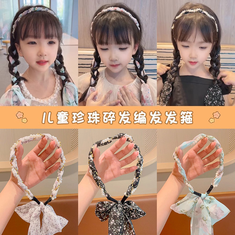 Pañuelo de seda floral para cabello trenzado para niños Diadema para niñas Trazado para el cabello Diadema de perlas de una pieza Tombro de horquilla antideslizante de todo fósforo