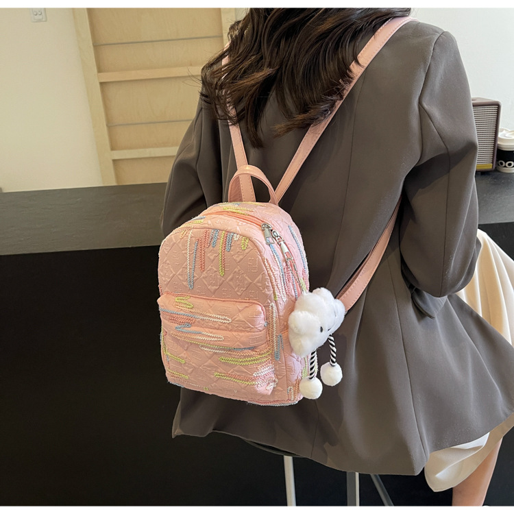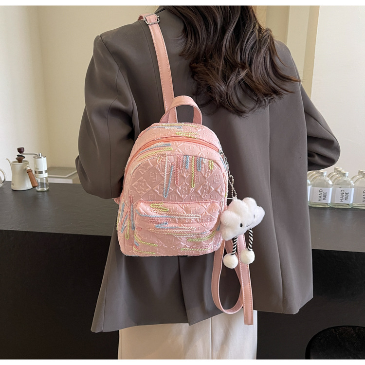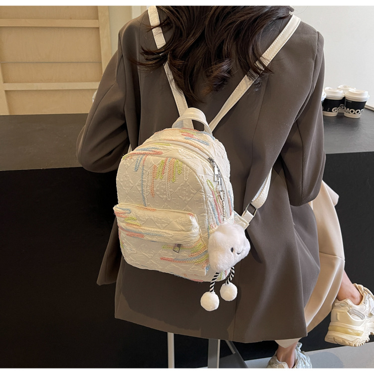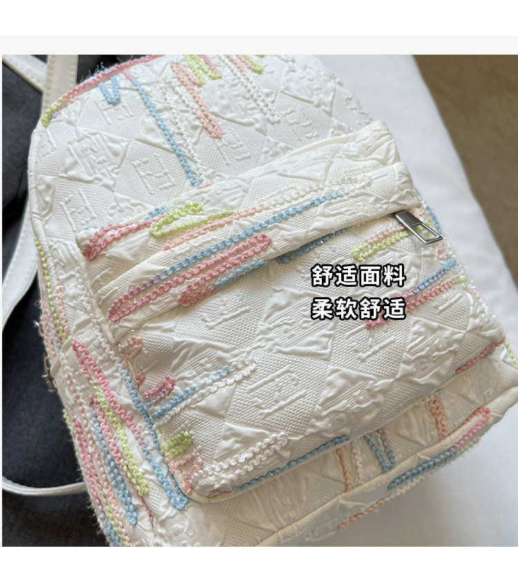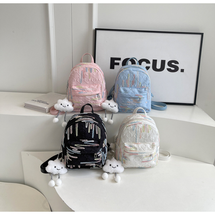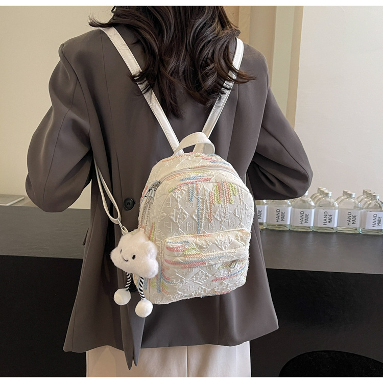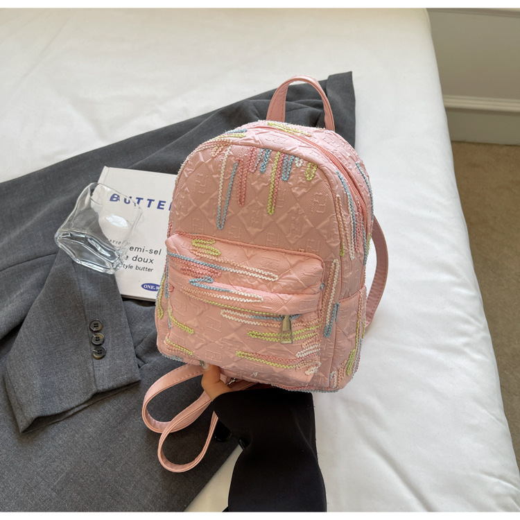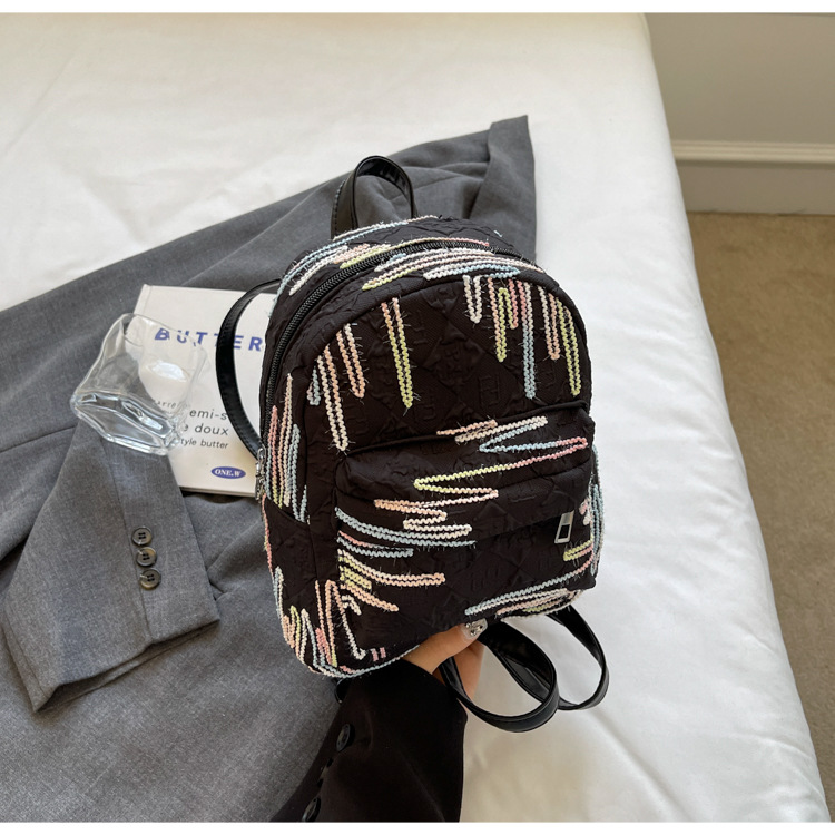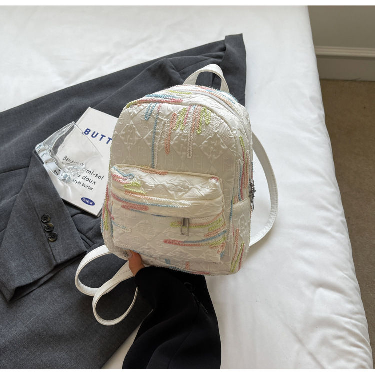 Mochila para viajes de niñas, hermosa mujer universitaria minimalista, rayas de color, mochila de moda de primavera.