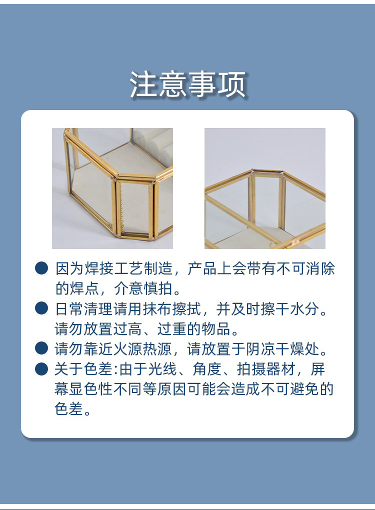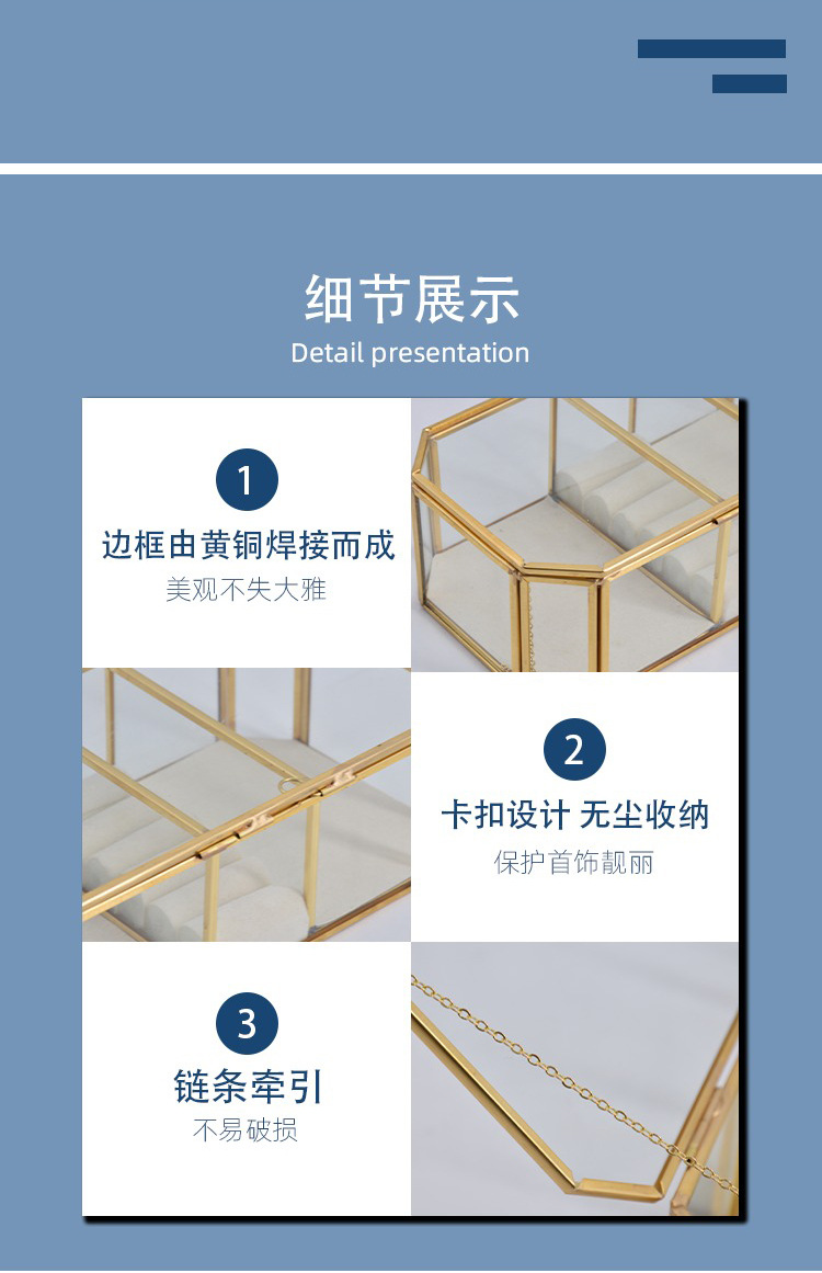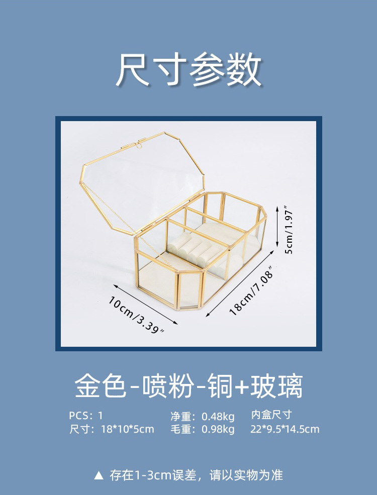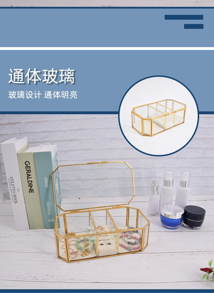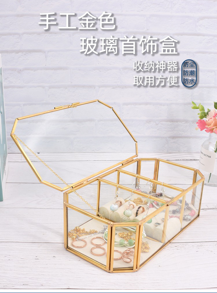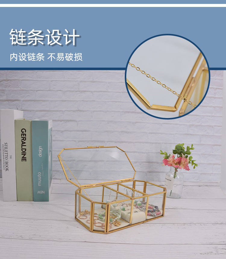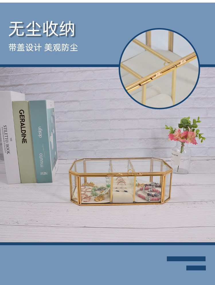 Caja de almacenamiento de joyas de vidrio con borde de cobre dorado hexagonal simple y exquisito, caja de regalo, caja de almacenamiento para el hogar, caja de almacenamiento de perlas