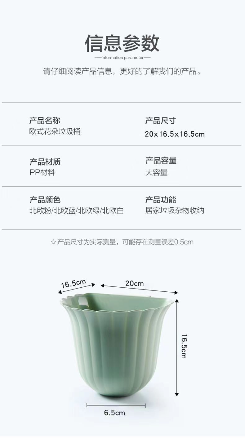| Color | Bote de basura de flores (blanco), bote de basura de flores (rosa), bote de basura de flores (verde), bote de basura de flores (azul) |