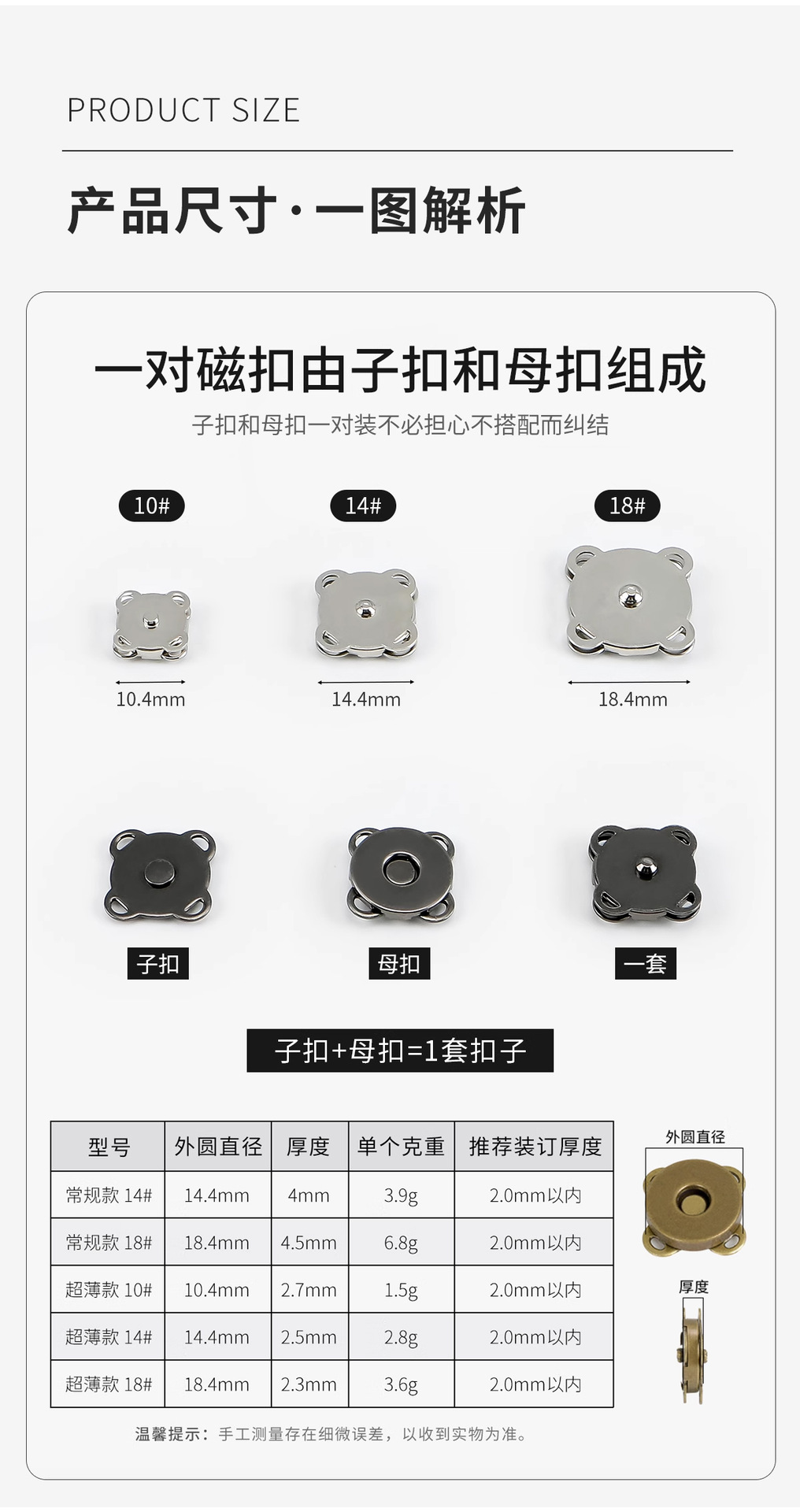 | Especificaciones y modelos | Hebilla magnética cosida a mano de color blanco plateado*18 mm,Hebilla magnética cosida a mano de color blanco plateado*14 mm,Hebilla magnética cosida a mano de color blanco plateado*10 mm,Hebilla magnética cosida a mano de bronce*18 mm,Hebilla magnética cosida a mano de bronce*14 mm,Hebilla magnética cosida a mano de bronce*10 mm,Negro pistola*Hebilla magnética cosida a mano de 18 mm,Negro pistola* Hebilla magnética cosida a mano de 14 mm,Negro pistola* Hebilla magnética cosida a mano de 10 mm,Amarillo*Hebilla magnética cosida a mano de 14 mm,Hebilla magnética cosida a mano de oro rosa*18 mm,Hebilla magnética cosida a mano de oro rosa*14 mm,Hebilla magnética cosida a mano de oro rosa*10 mm,Hebilla magnética ultrafina de mano blanca plateada * 18mm,Botón magnético cosido a mano ultrafino de bronce * 18mm,Hebilla magnética de mano ultrafina negra de pistola * 18mm,Hebilla magnética ultrafina plateada brillante * 18mm,Hebilla magnética ultrafina de mano blanca plateada * 14mm,Botón magnético cosido a mano ultrafino de bronce * 14mm,Pistola negra * 14mm hebilla magnética ultrafina de la mano,Hebilla magnética ultrafina plateada brillante * 14mm |