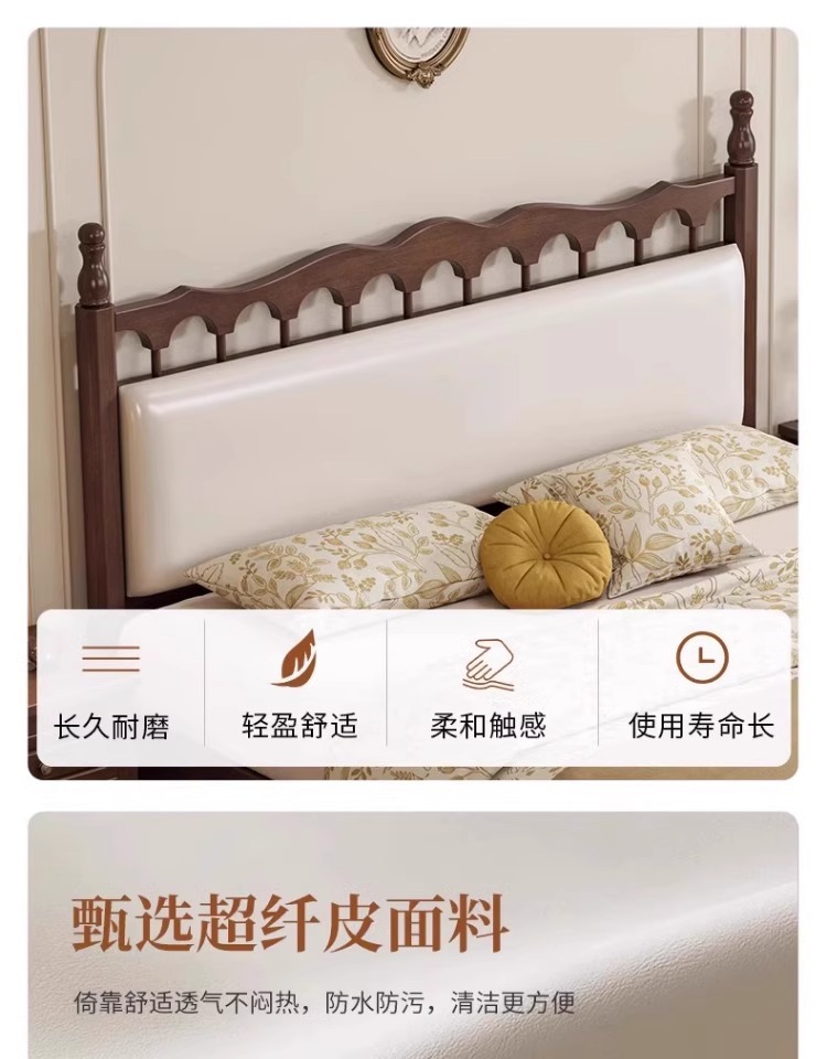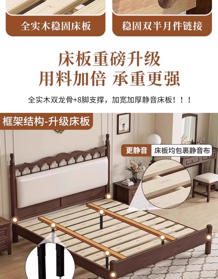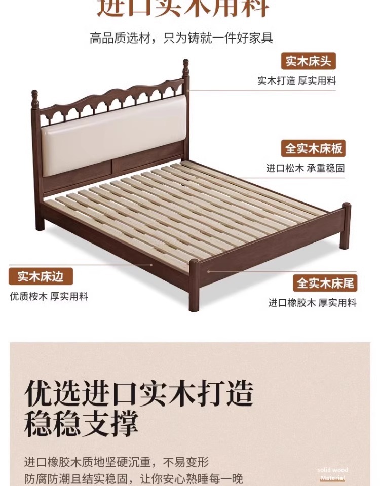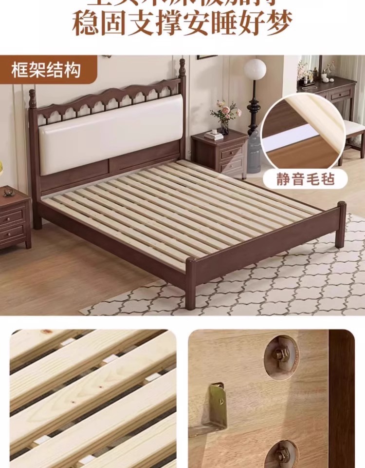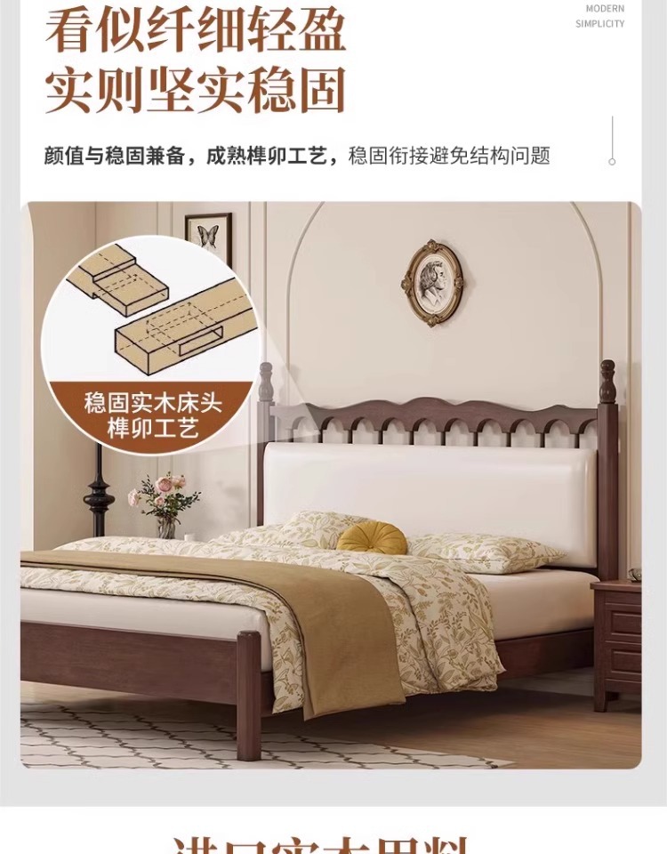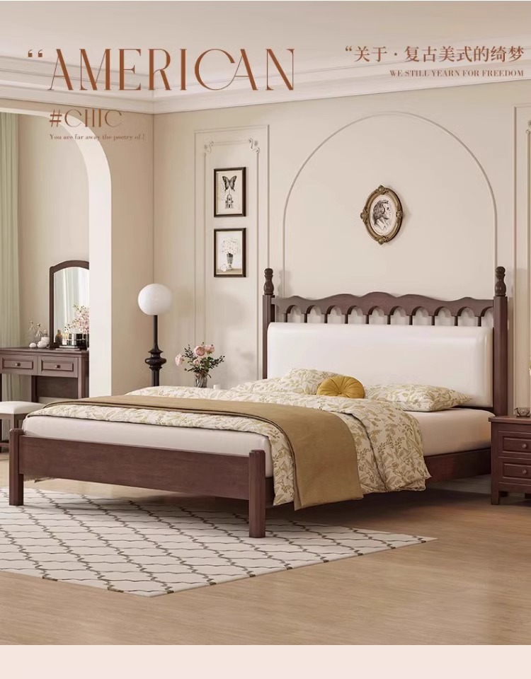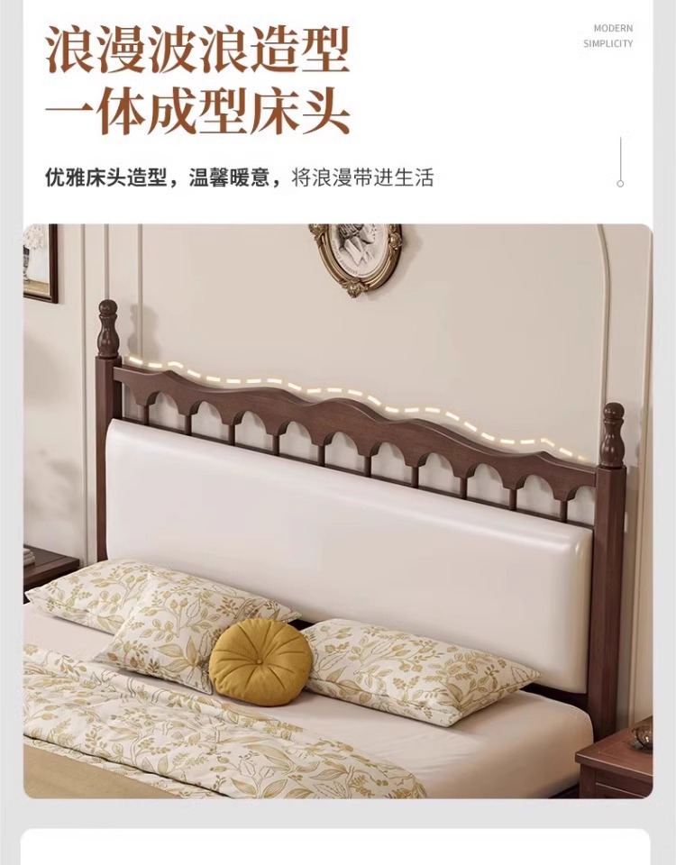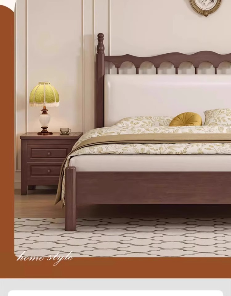 Cama de madera sólida retro nórdica 1.8m moderna simple cama doble dormitorio principal 1.5 cama ondulada de estilo medieval cama de matrimonio