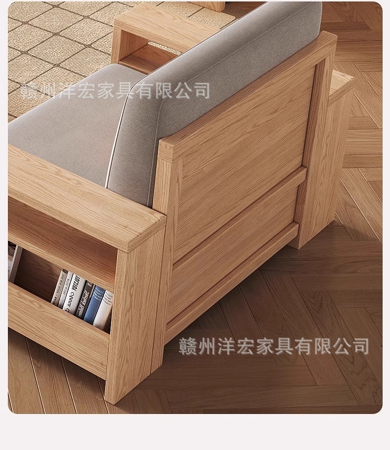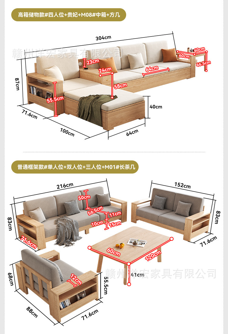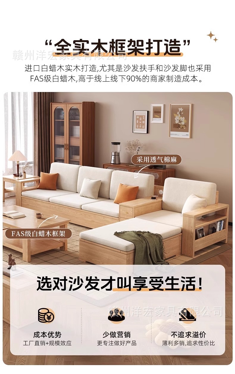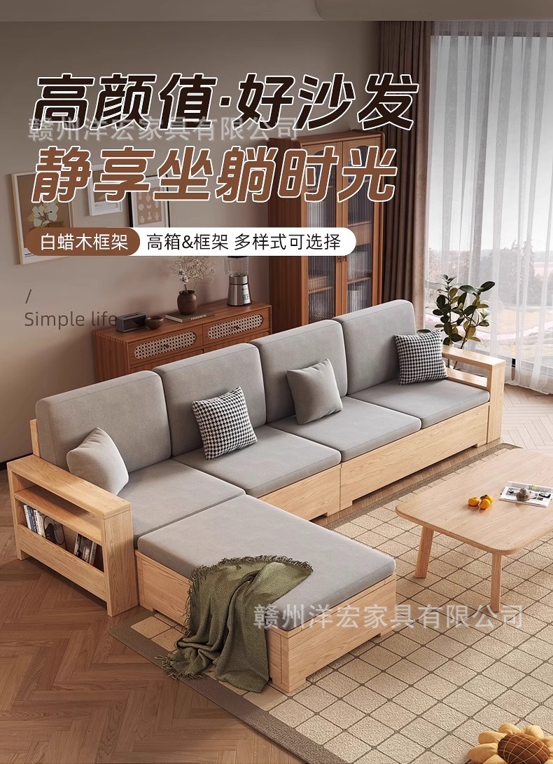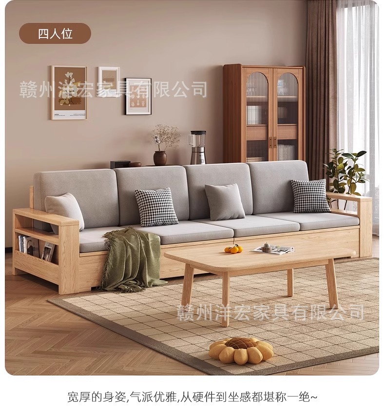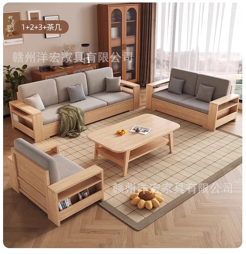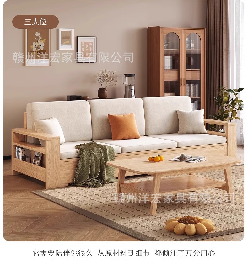 Sofá de madera sólida nórdica sofá de tela de madera de cera blanca simple sala de estar doméstica de madera de madera de tres filas
