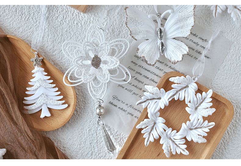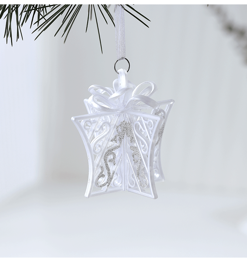 Nuevo colgante de acrílico de Navidad blanco transfronterizo, copos de nieve en polvo de brillo, paquete de regalo de árbol de Navidad de mariposa, colgante de caramelo pequeño