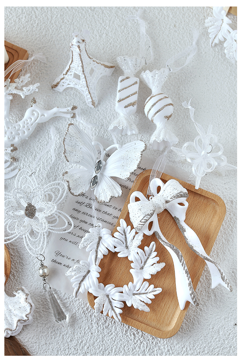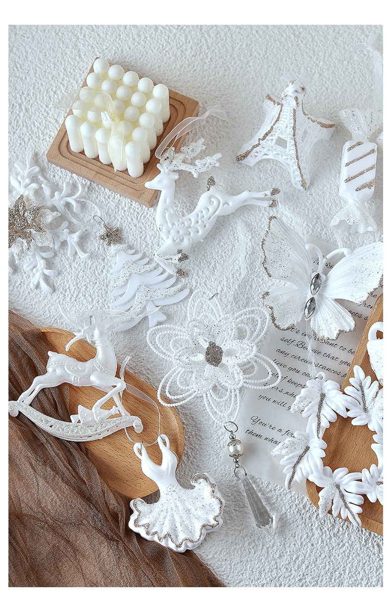 | Colores | Árbol de Navidad blanco,Alce blanco,Mariposa blanca,Tito de hierro blanco,Guirnalda blanca,Copo de nieve blanco,Flores blancas,Candy blanco 2 piezas,Falda blanca,Lazo blanco,Ciervo blanco,Paquete de regalo blanco |