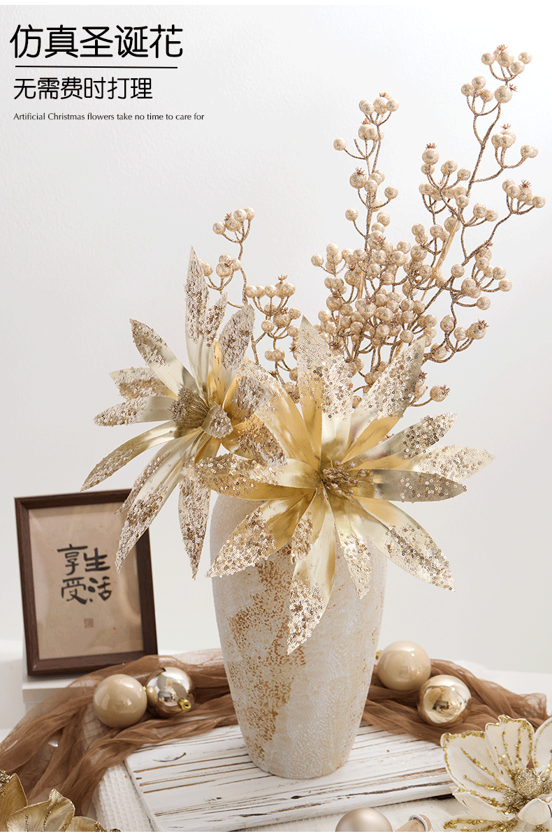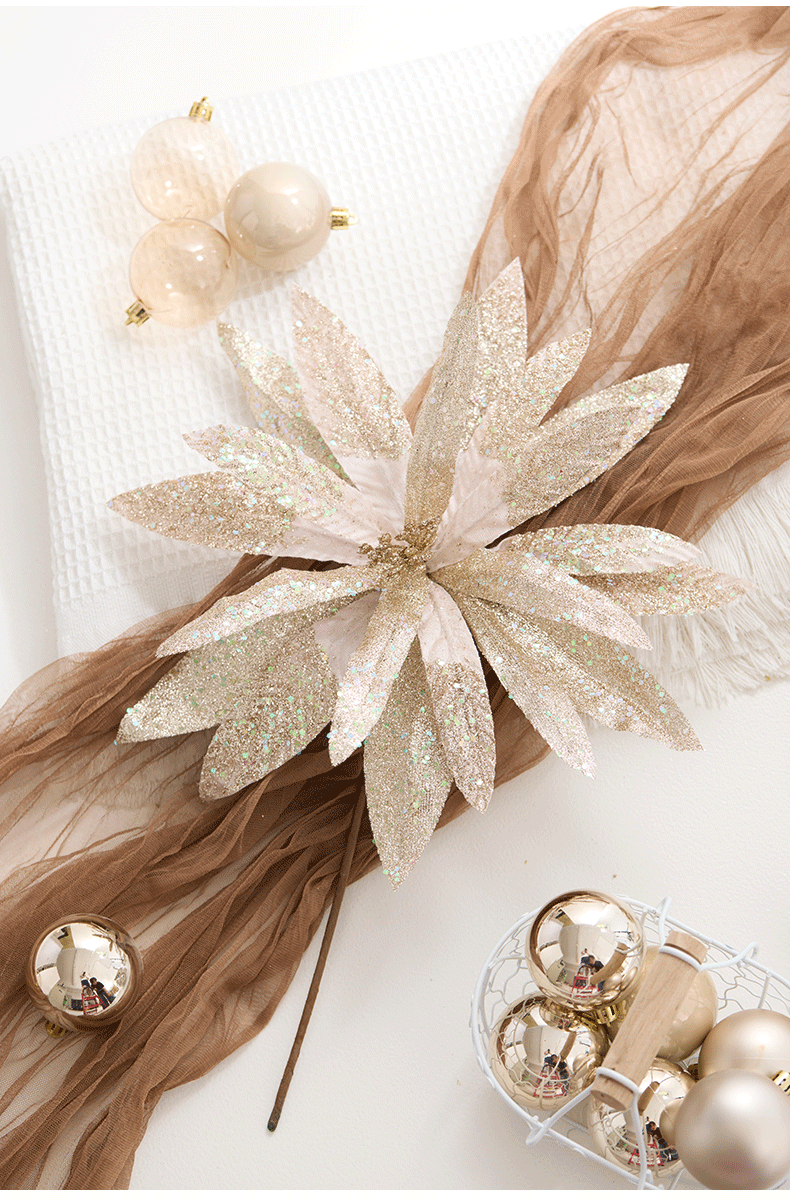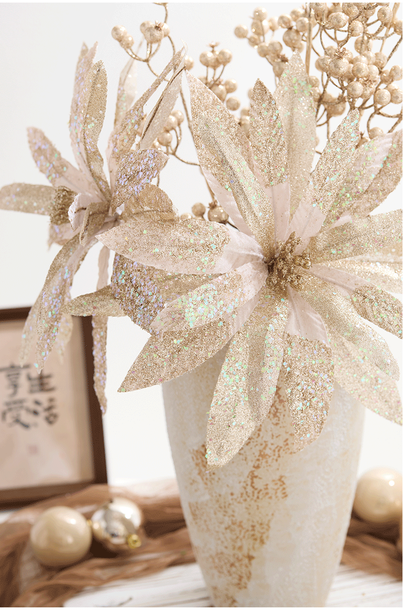 Ventas transfronterizas de flores de Navidad doradas de alta calidad tela brillante super grande flores de Navidad decoraciones colgantes de árbol de Navidad