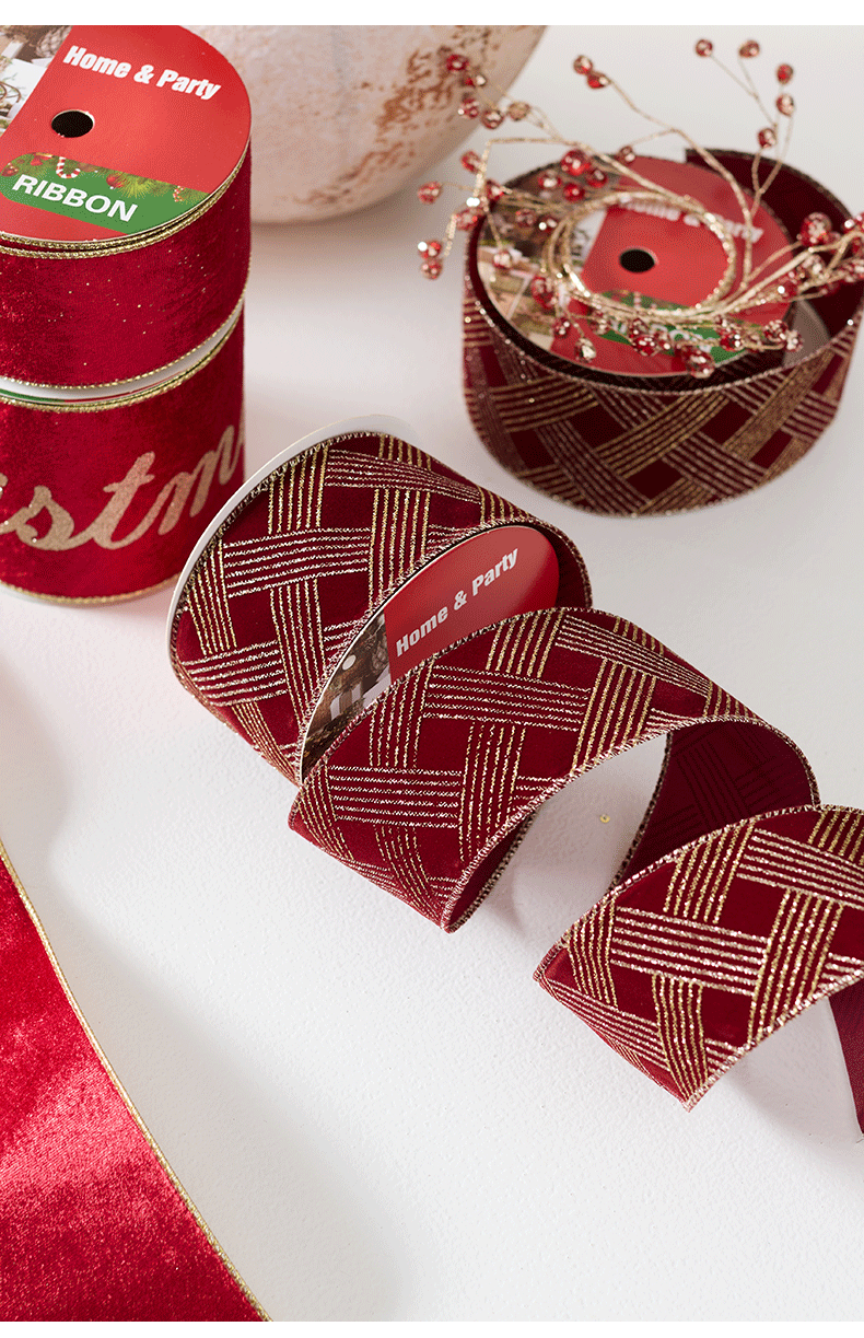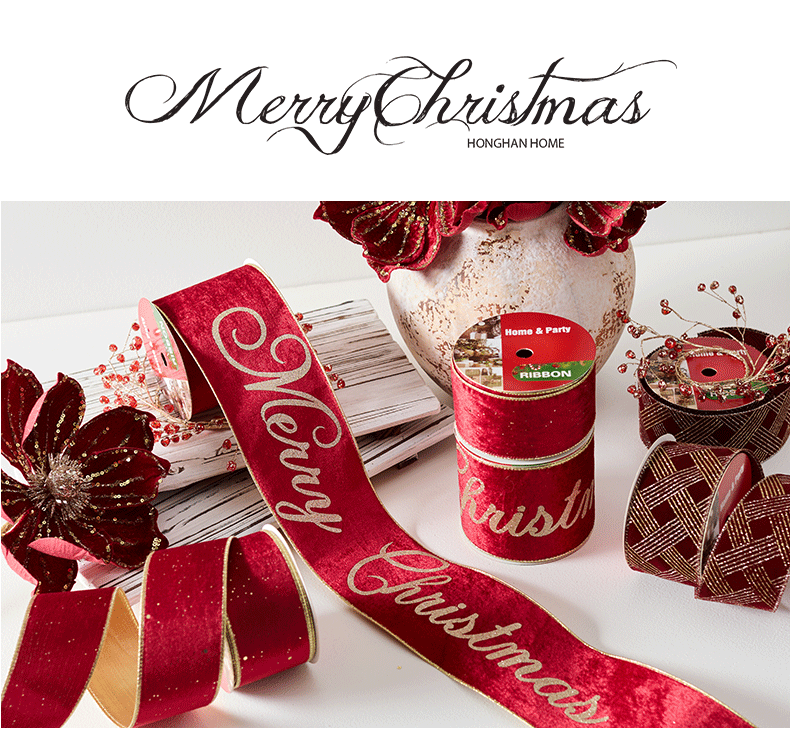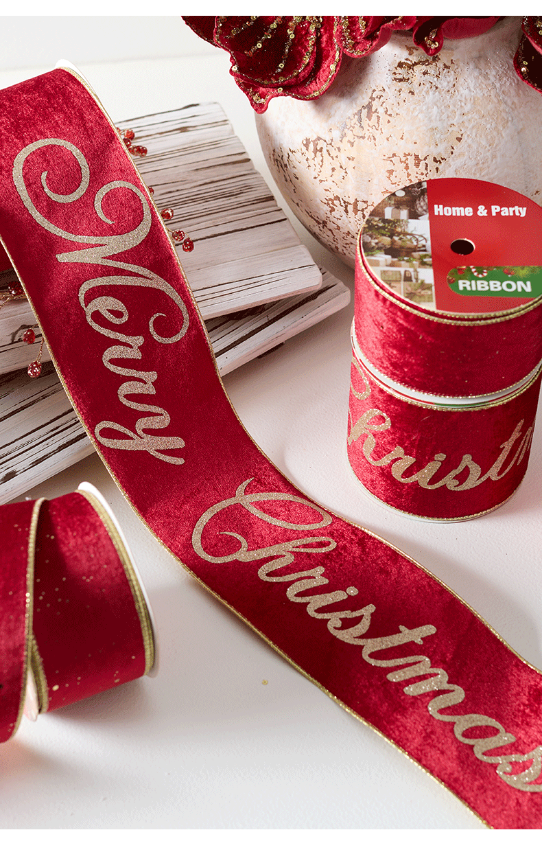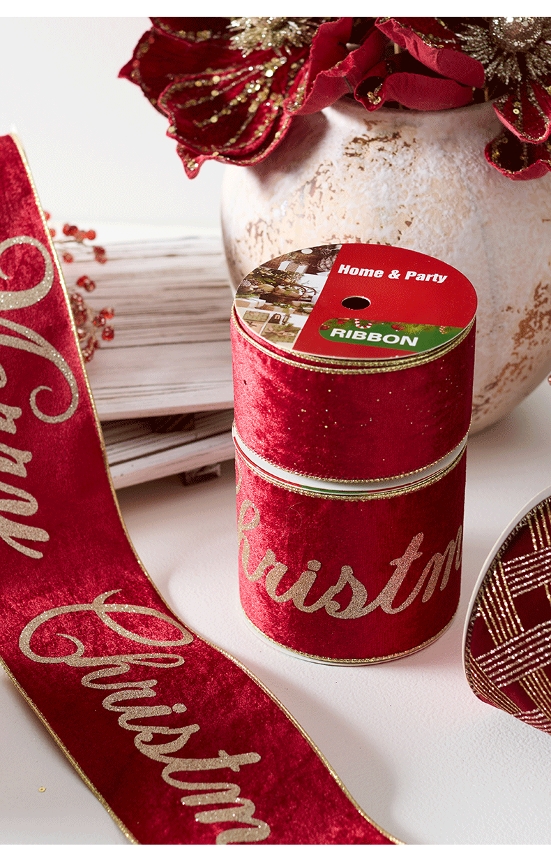 | Colores | 24-8(10cm terciopelo dos colores merry christmas),24-7(6.3cm terciopelo dorado),24-9 (6,3 cm vino tinto flocado champán en polvo dorado en diagonal),Tenga en cuenta que 10 yardas son aproximadamente 9,1 metros |