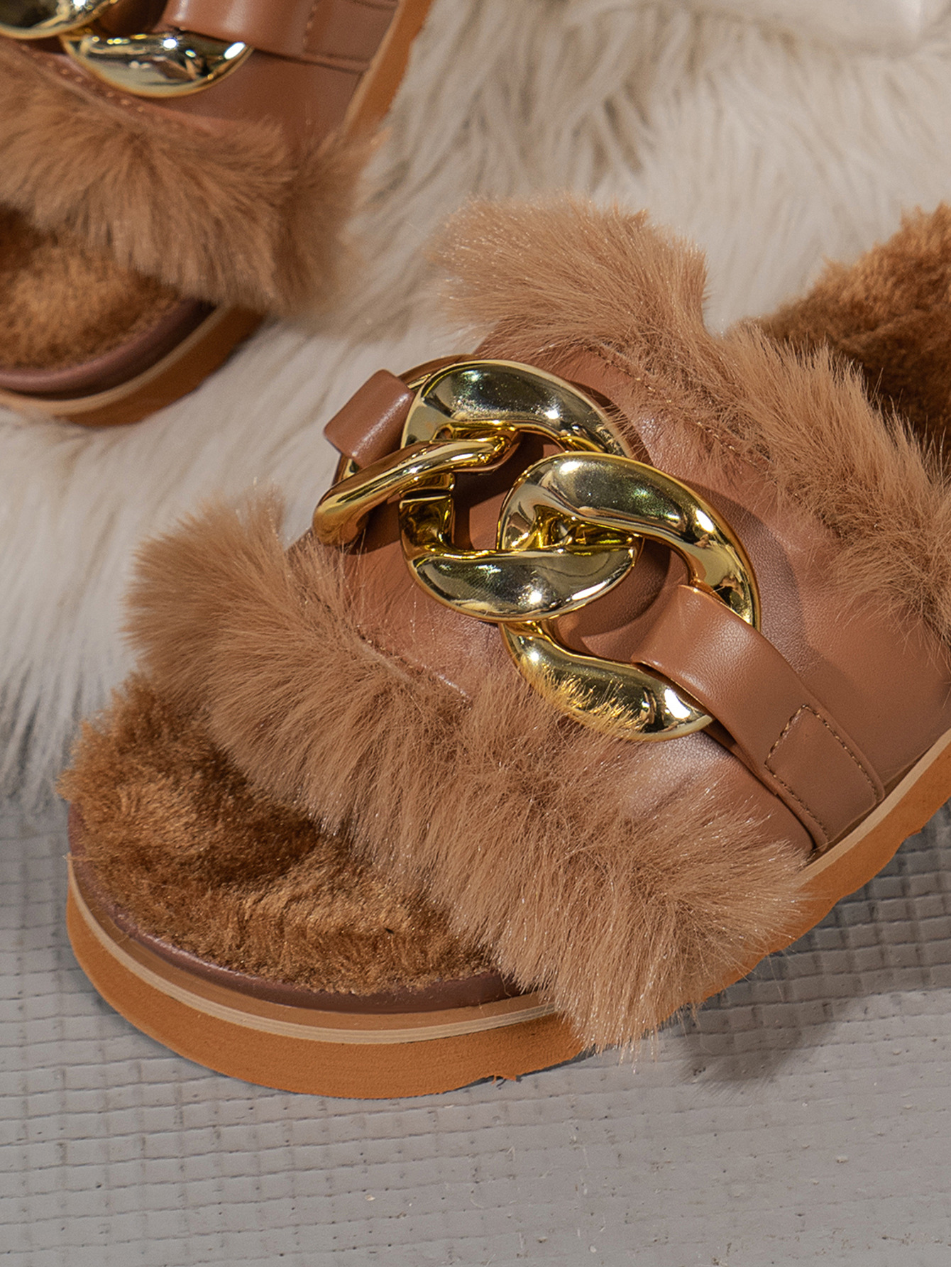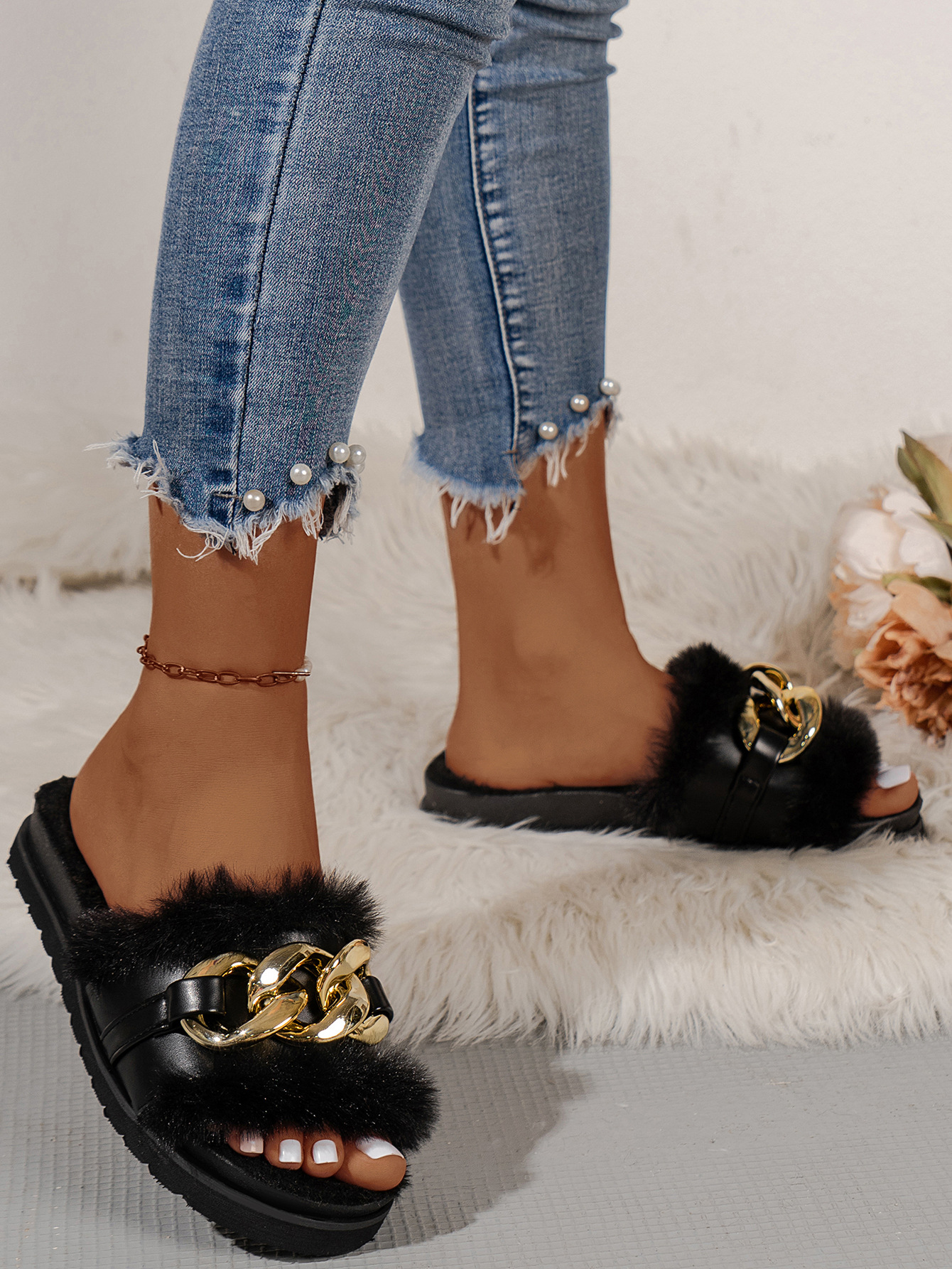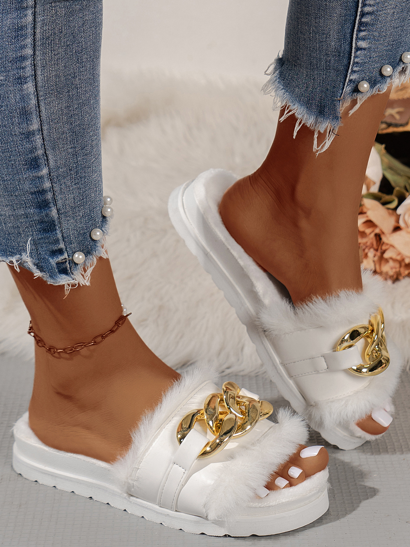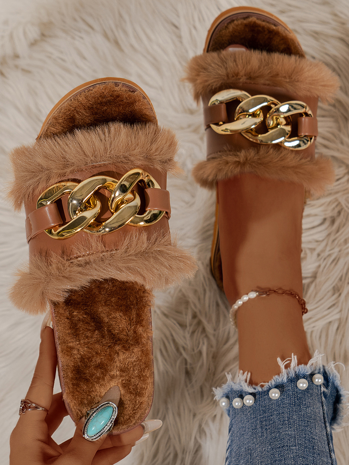 2024 nueva moda abertura zapatillas de lana zapatillas de cadena metálica zapatillas de algodón para mujeres ocio interior calentamiento zapatillas