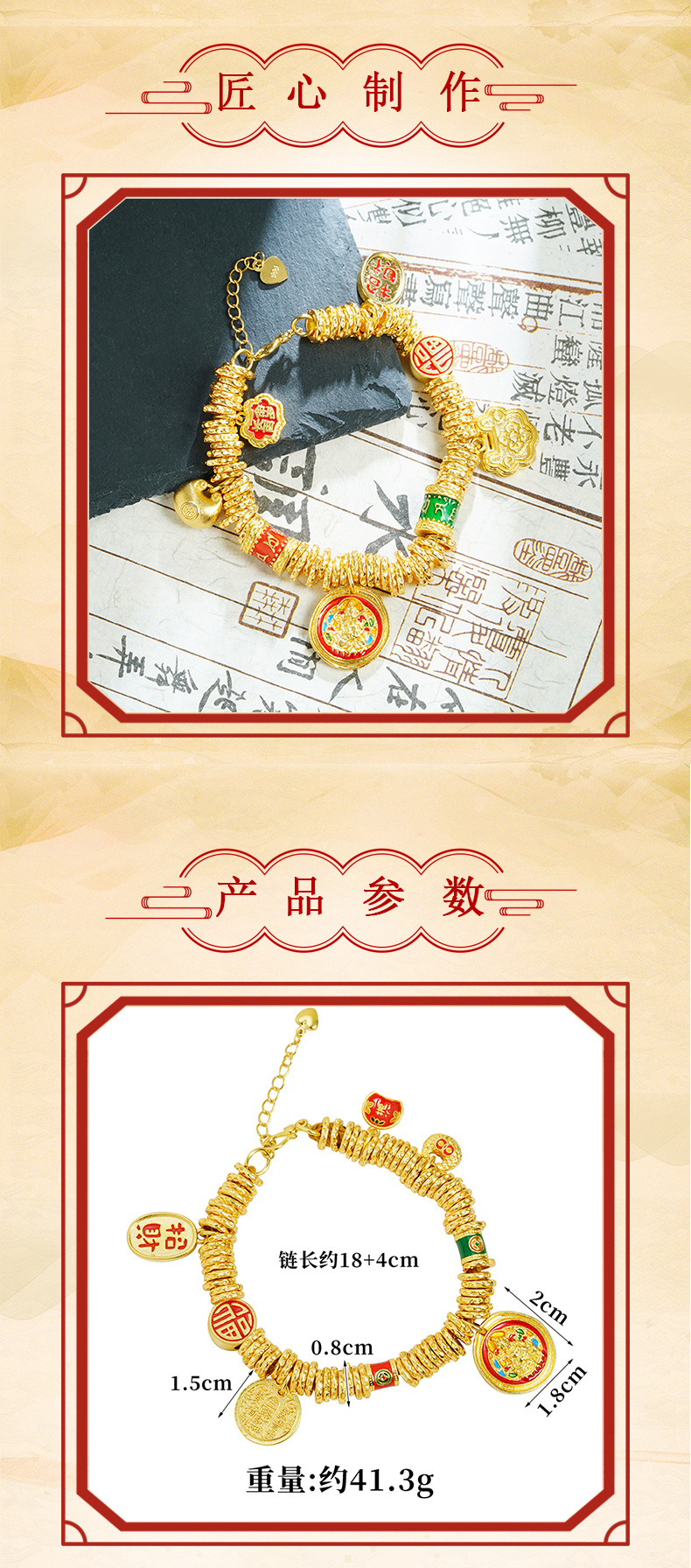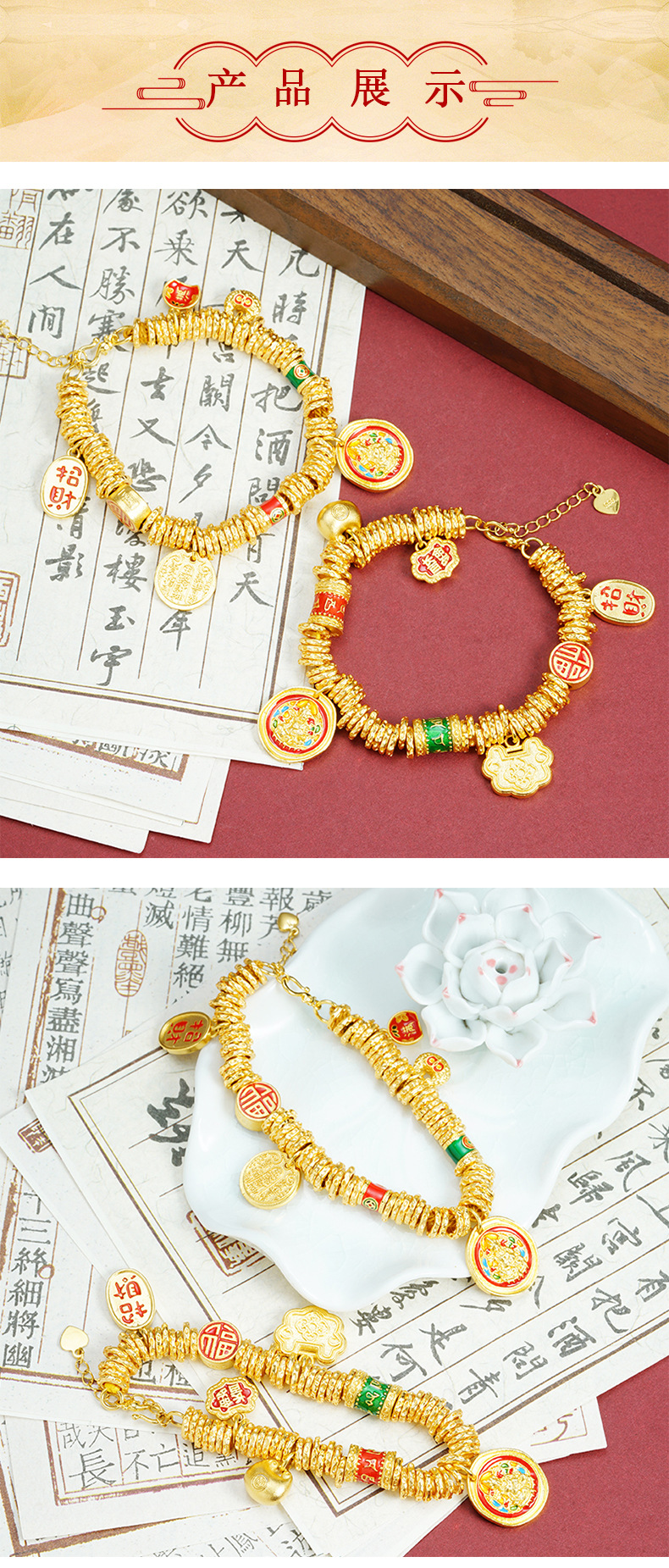 Nueva pulsera de oro de arena antigua de estilo chino, plato de marea nacional, bendición gorda, pulsera de Dios de la riqueza amarilla, el viento del palacio no se desvanece durante mucho tiempo, joyería