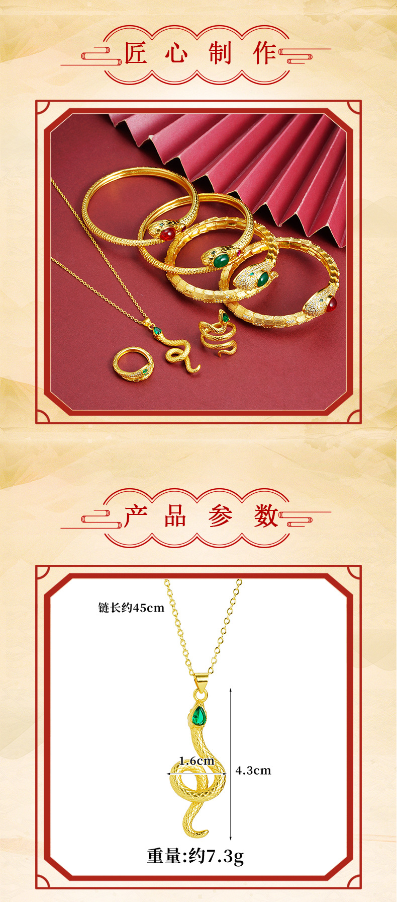 Collar de oro de arena vietnamita, marea nacional, serpiente espiritual de circonio, pulsera abierta, conjunto de anillos, estilo chino femenino, joyería que no se desvanece durante mucho tiempo