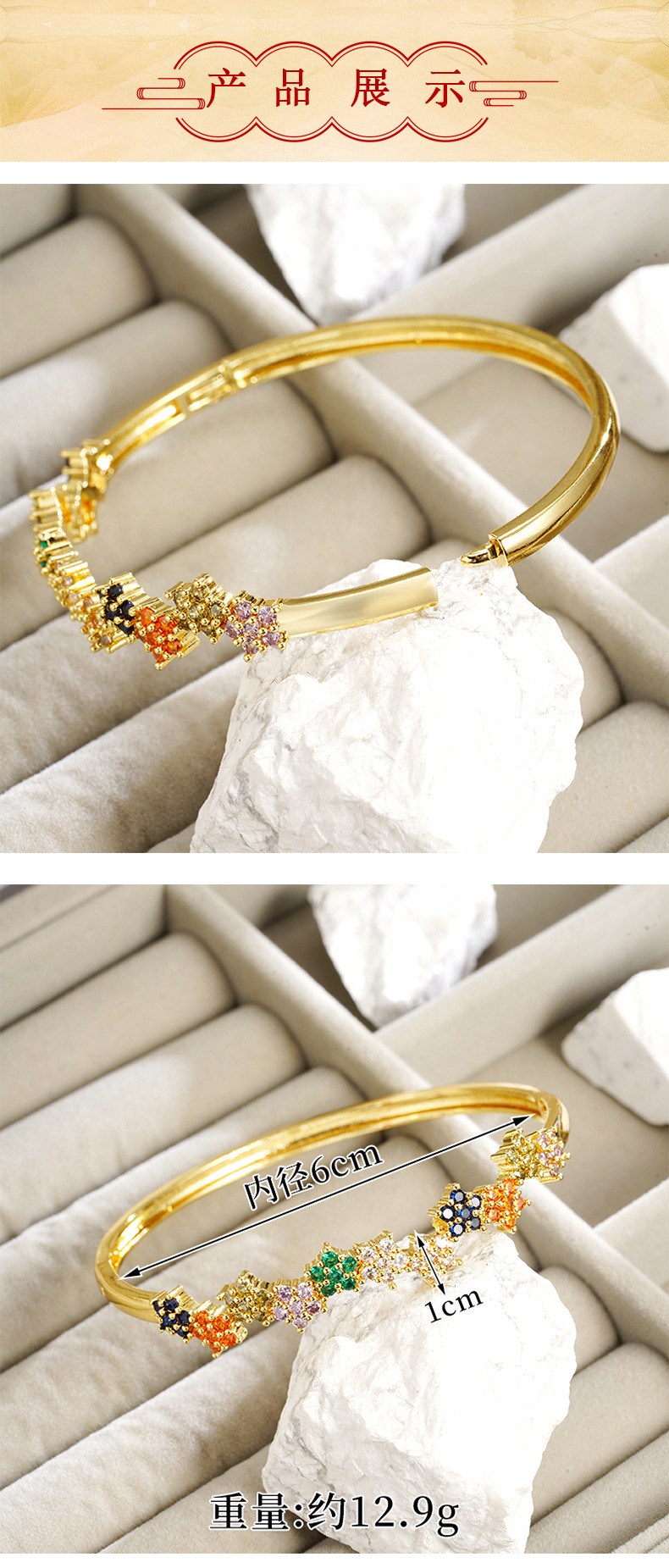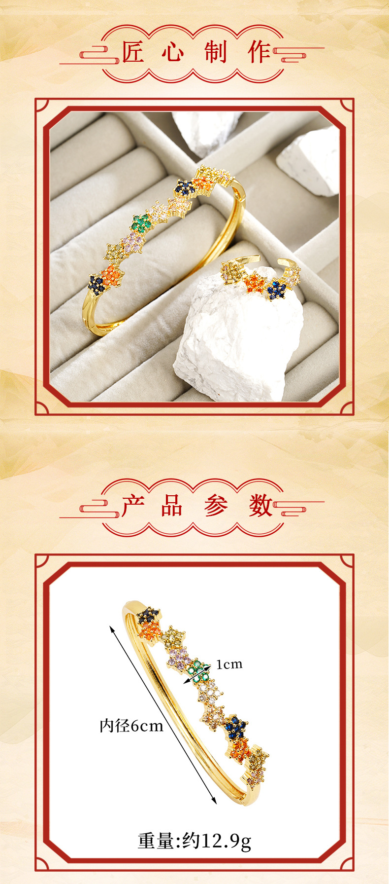 Brazalete de 18k de galvanoplastia de oro de arena antigua transfronteriza, anillo de circonio con microincrustaciones de estilo europeo y americano, joyería de nicho femenina que no se desvanece durante mucho tiempo
