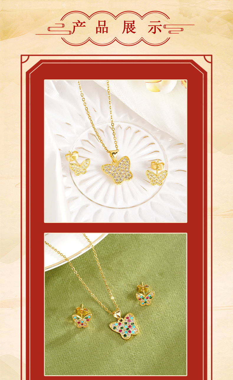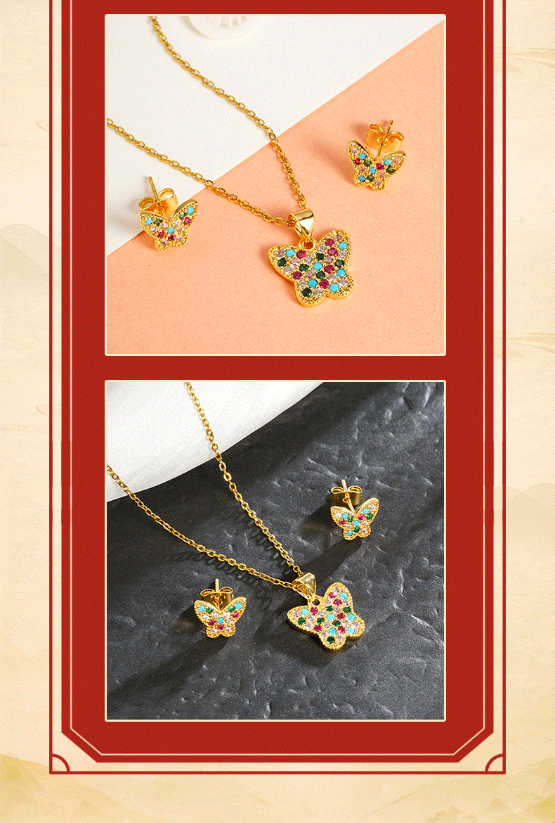 | Colores | Collar de mariposas de colores X2885,Collar de mariposa X2886,Pendientes de mariposa de colores E2433,Pendientes de mariposa E2432 |