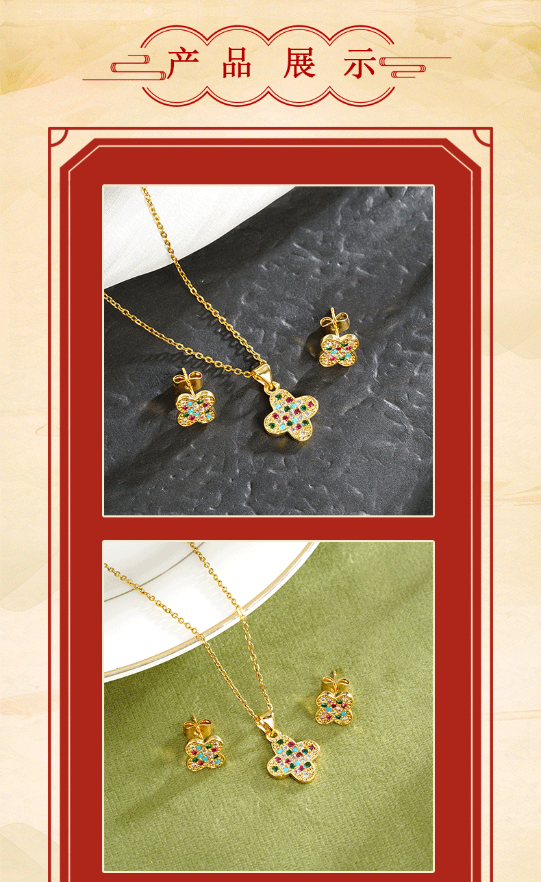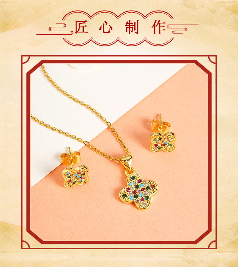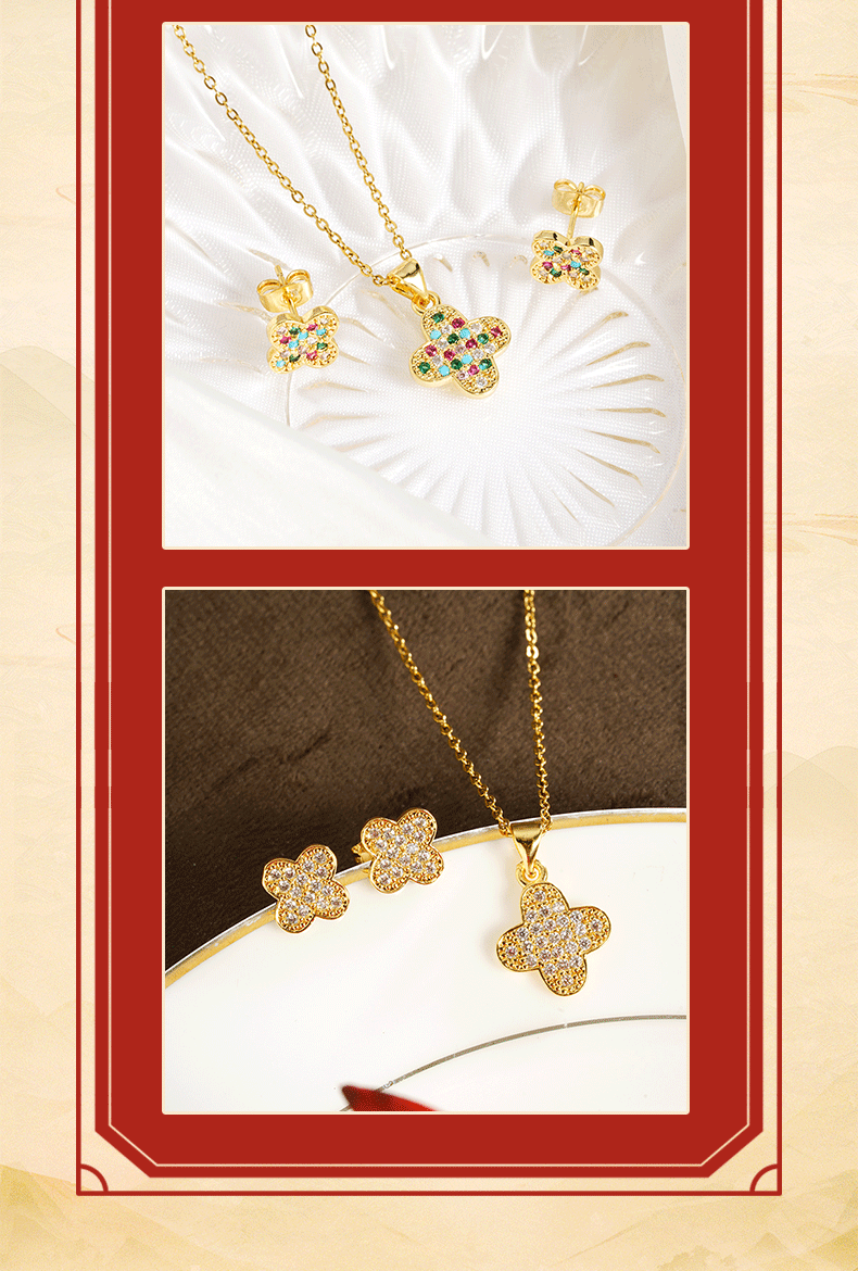 Moda de oro de arena de Vietnam, color de lujo ligero, incrustaciones de diamantes, collar de flores de cuatro hojas, pendientes, joyas transfronterizas para mujeres que no se desvanecen durante mucho tiempo