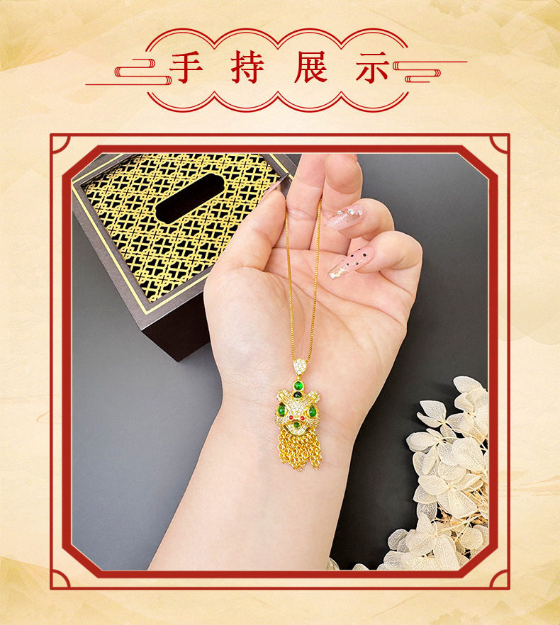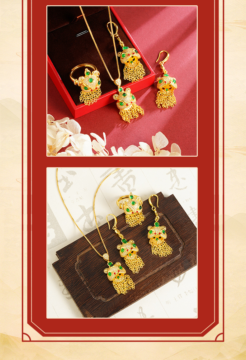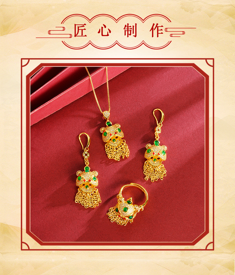 Collar colgante de oro de arena Collar de danza del león con incrustaciones de diamantes Pendientes Anillo abierto Pendientes de borla Conjunto Accesorios Yiwu al por mayor