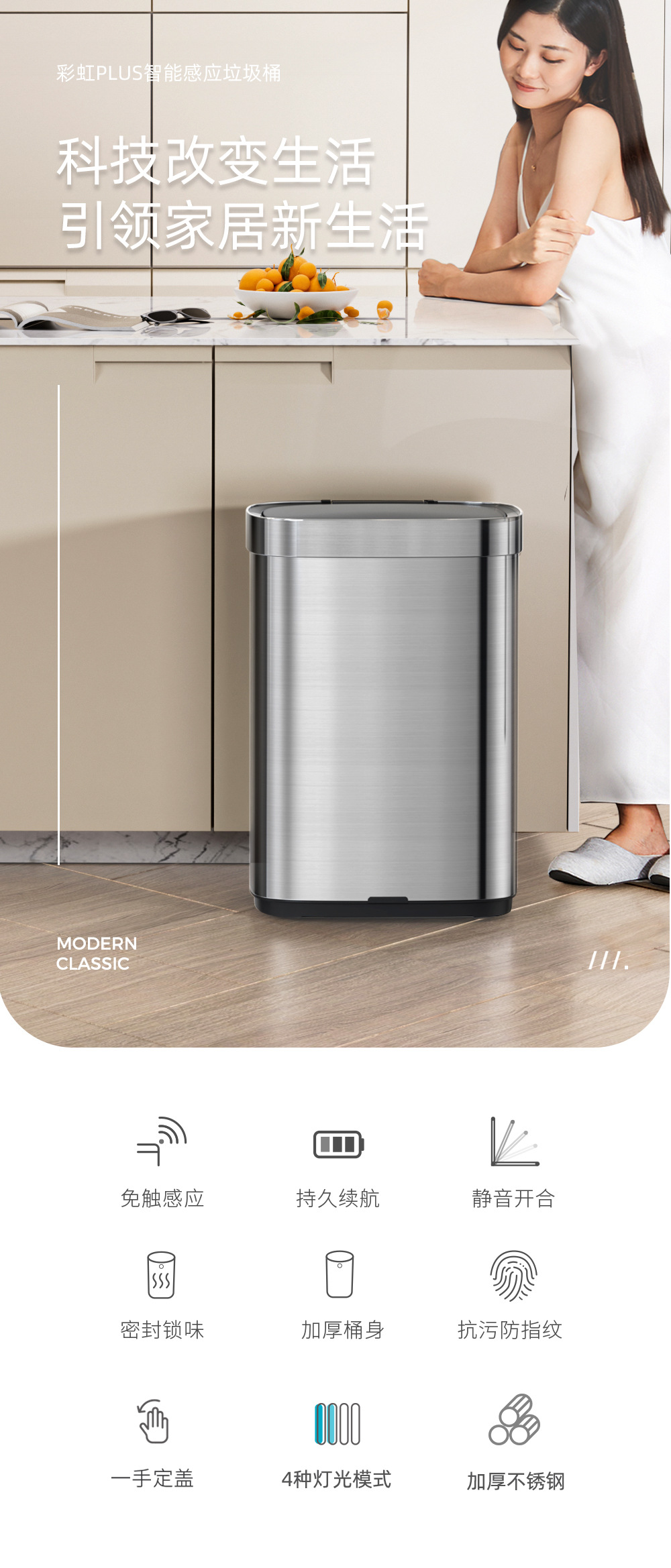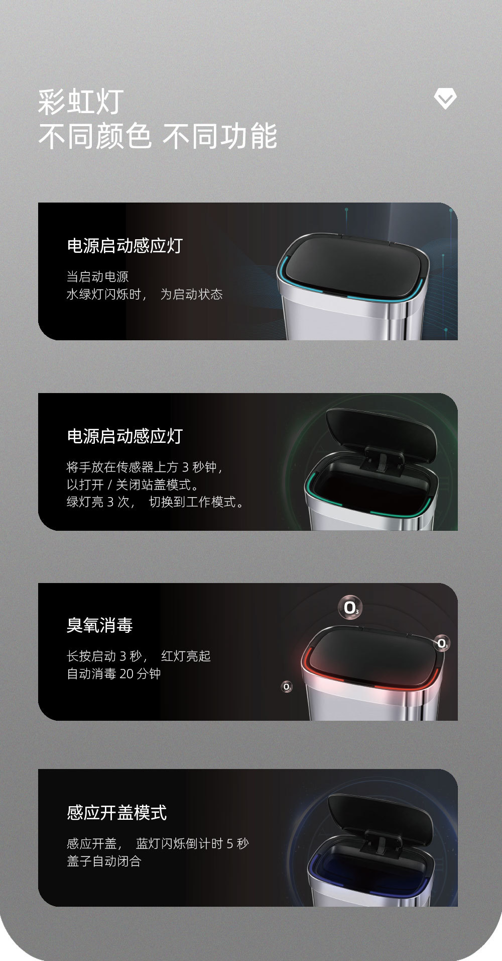 Basurero inteligente de acero inoxidable con sensor automático y desinfección por ozono para cocina y sala de estar