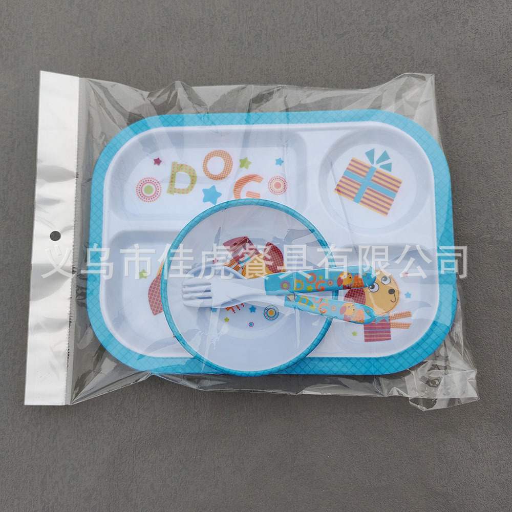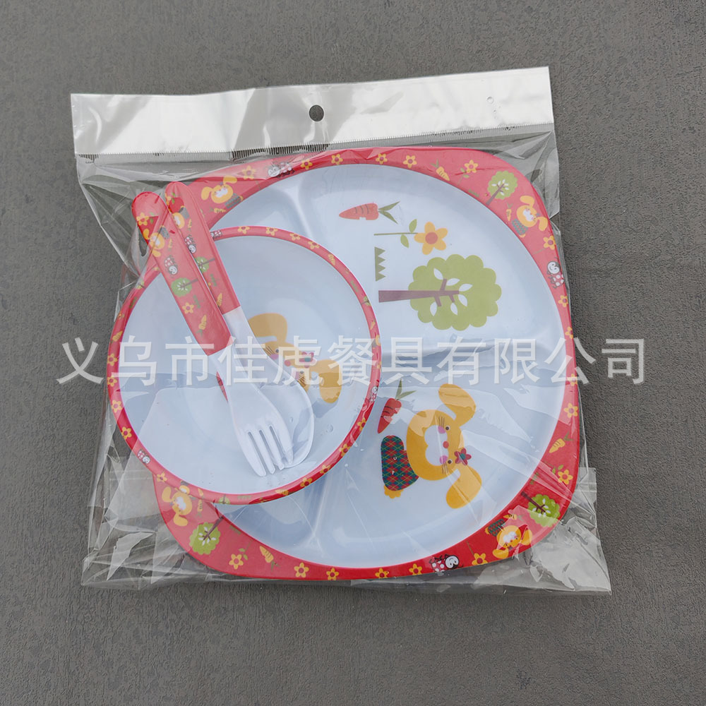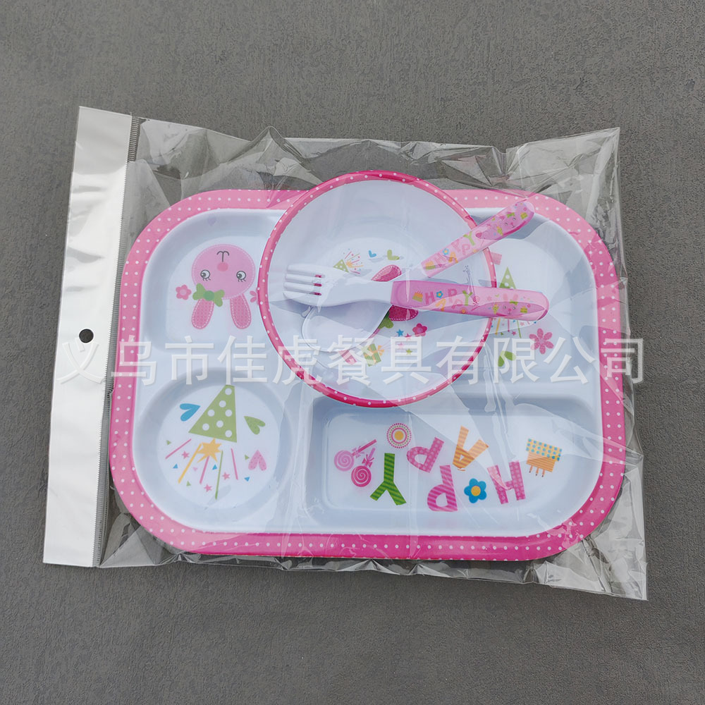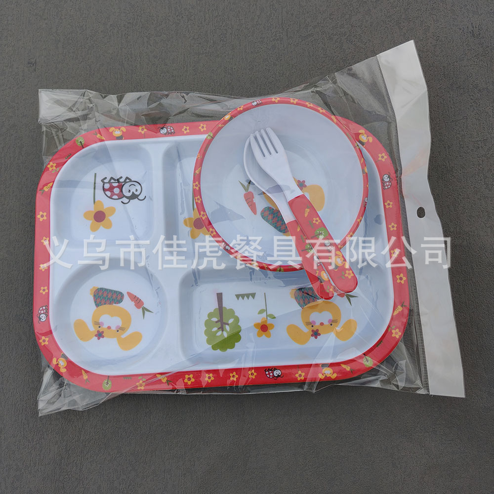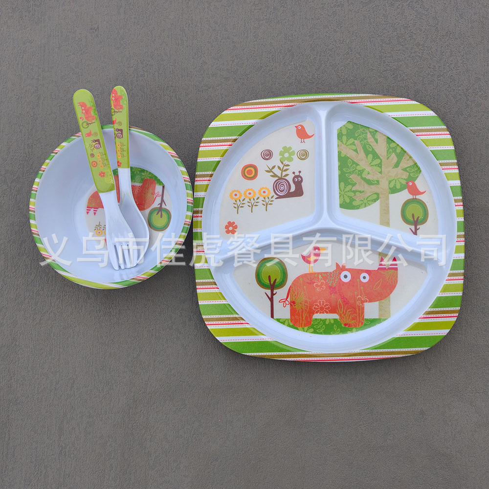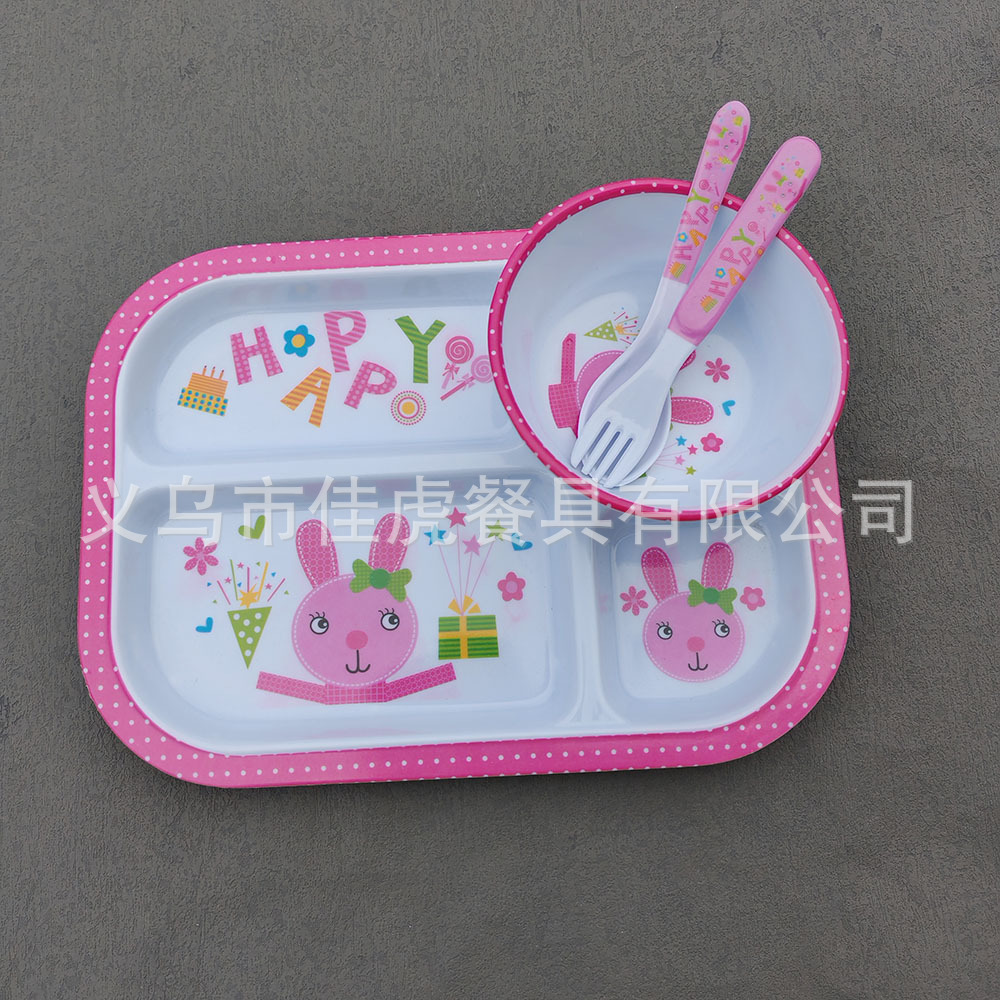 Melamina Tilamina Vajilla para niños Tazón de dibujos animados Tenedor Cuchara Juego de cuatro piezas Plato de comedor de tres compartidos y cuatro compartidos Fabricantes de platos