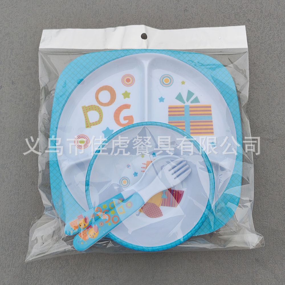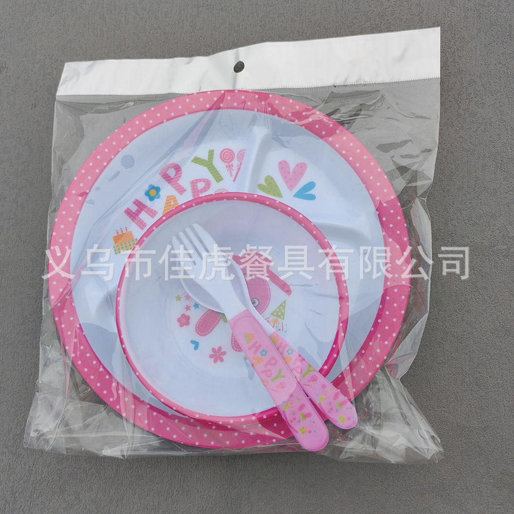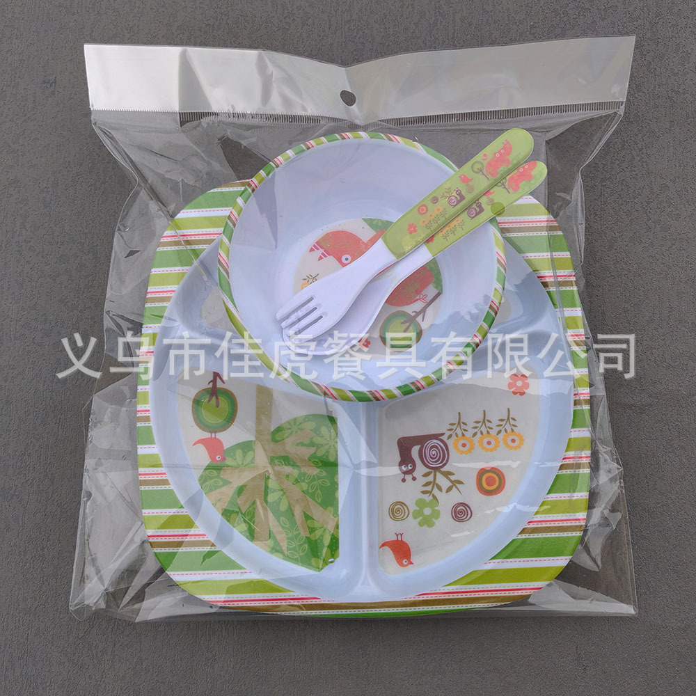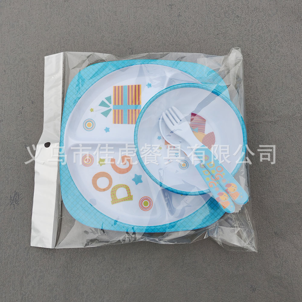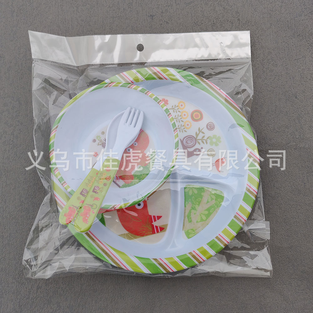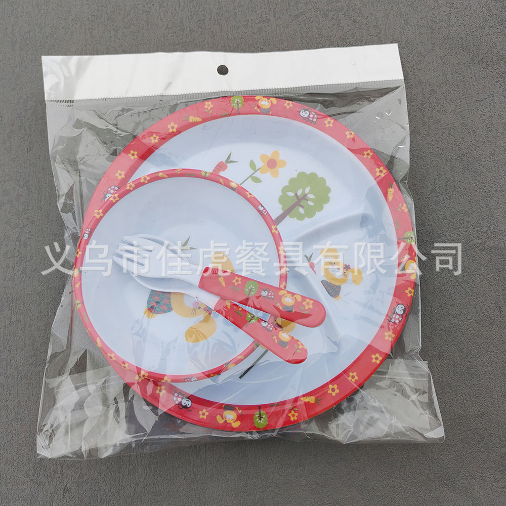 Melamina Tilamina Vajilla para niños Tazón de dibujos animados Tenedor Cuchara Juego de cuatro piezas Plato de comedor de tres compartidos y cuatro compartidos Fabricantes de platos