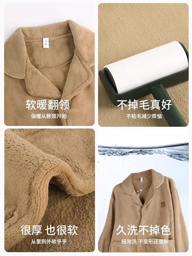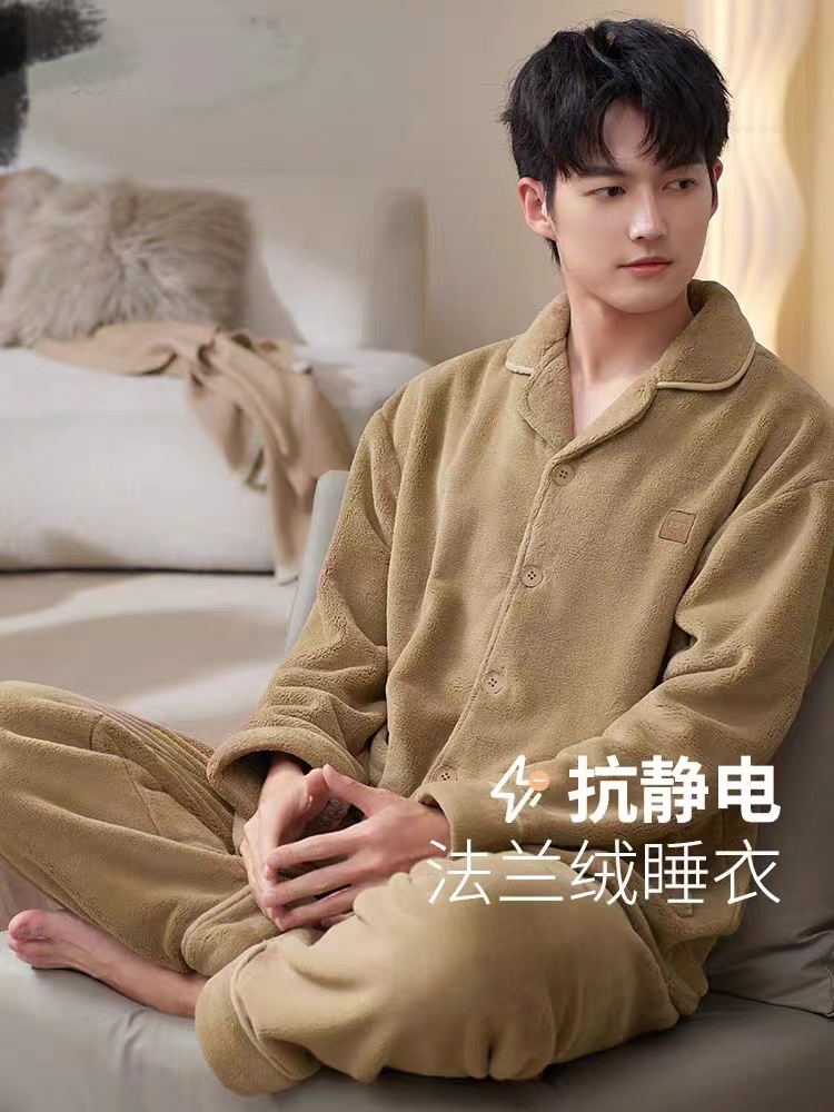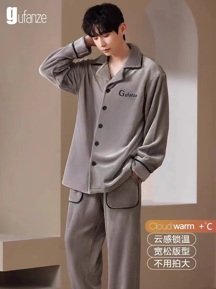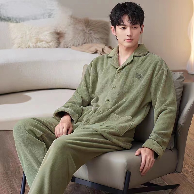 Pijamas para hombres otoño y invierno nuevos botones de franela ropa de casa Cardigan set bordado con solapa pijamas sueltos
