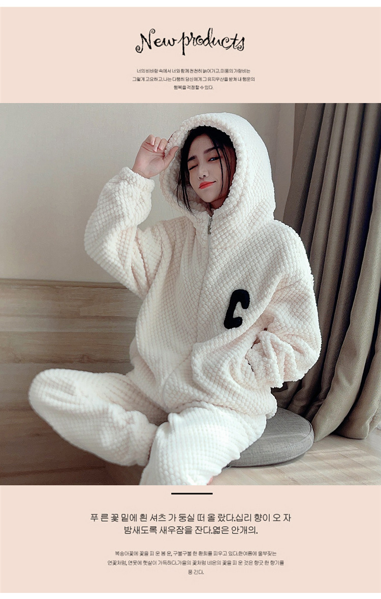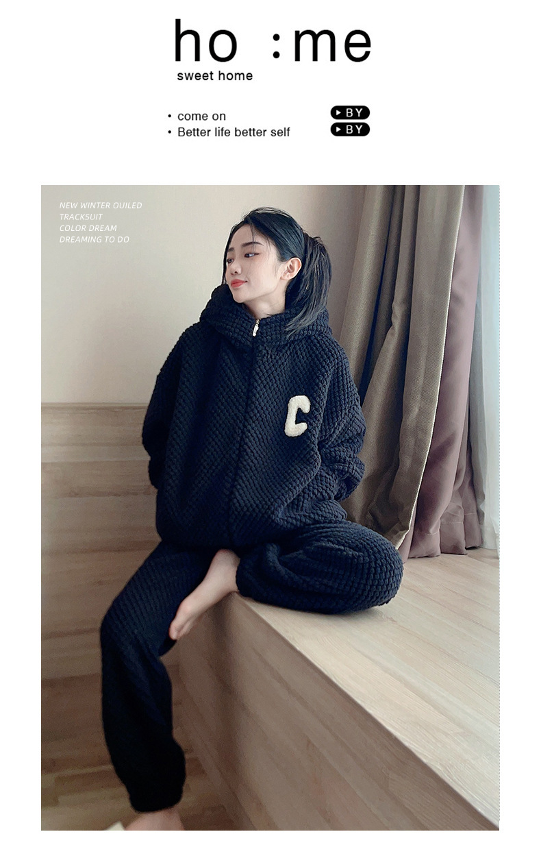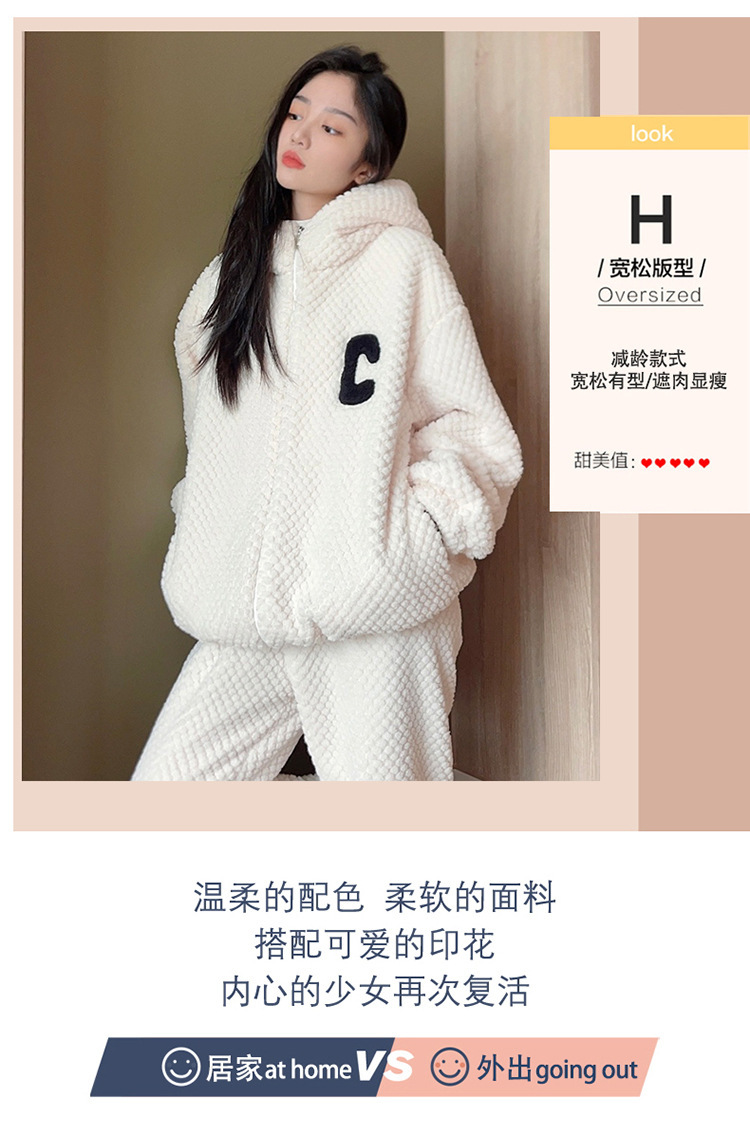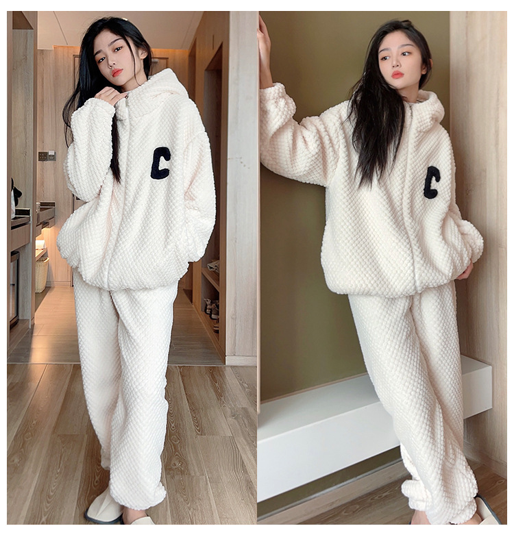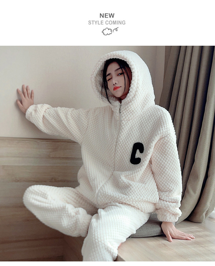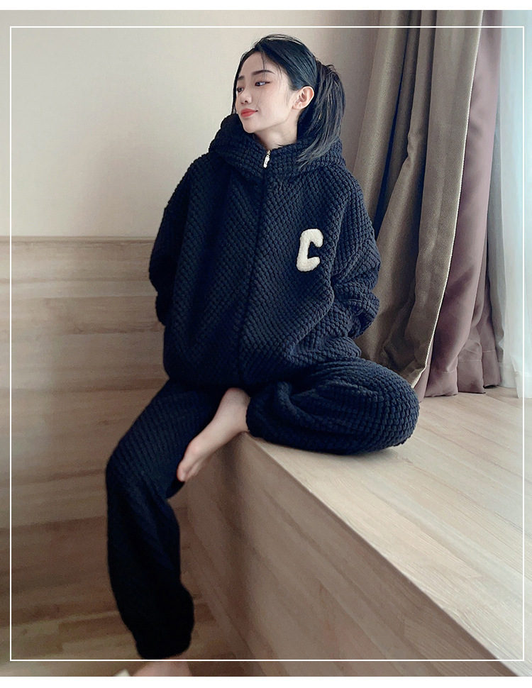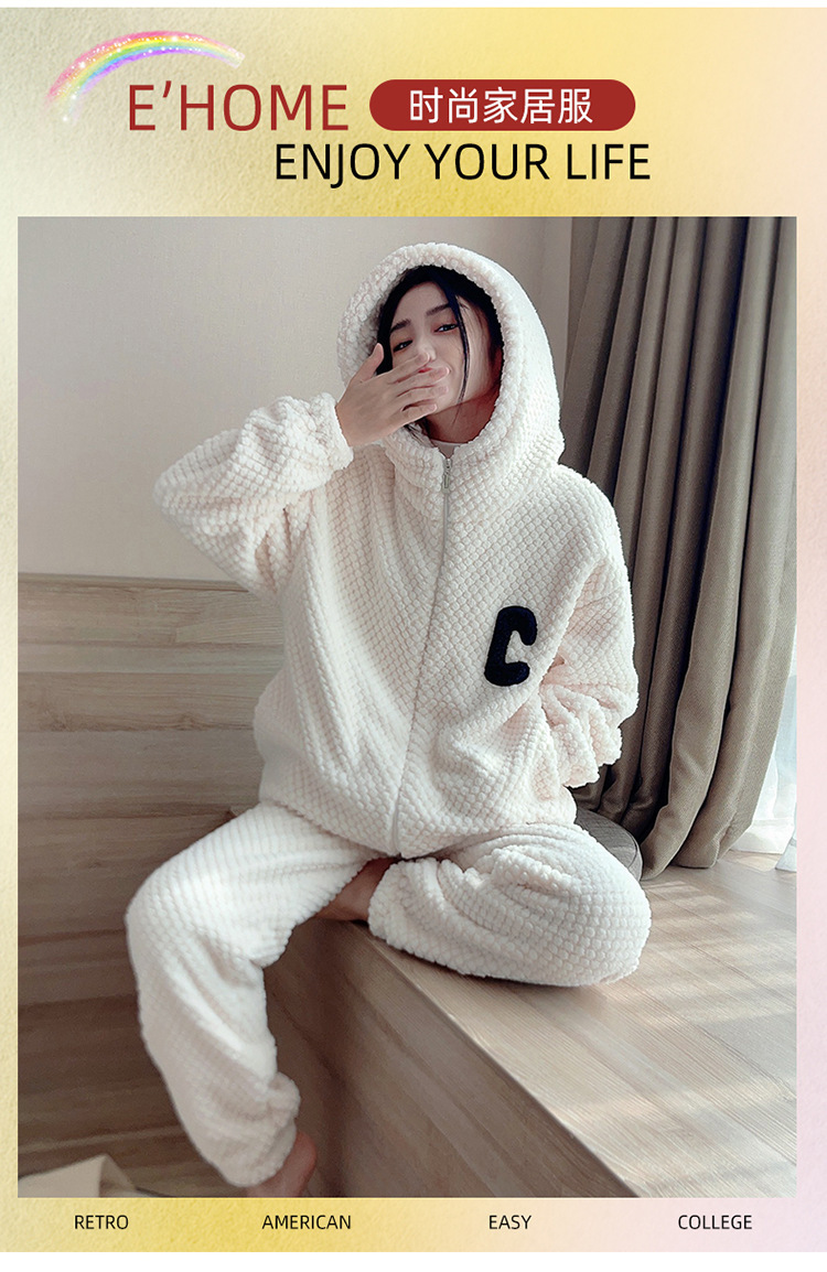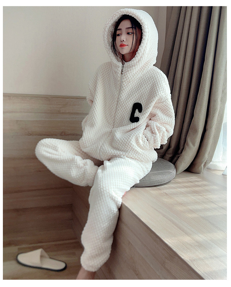 Pijamas de caída en línea para mujeres de otoño y invierno deportivos con capuzas de vello y cremallera de ocio gruesa para estudiantes se pueden usar con ropa de hogar