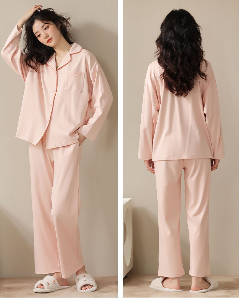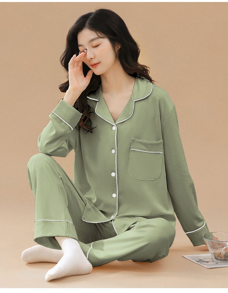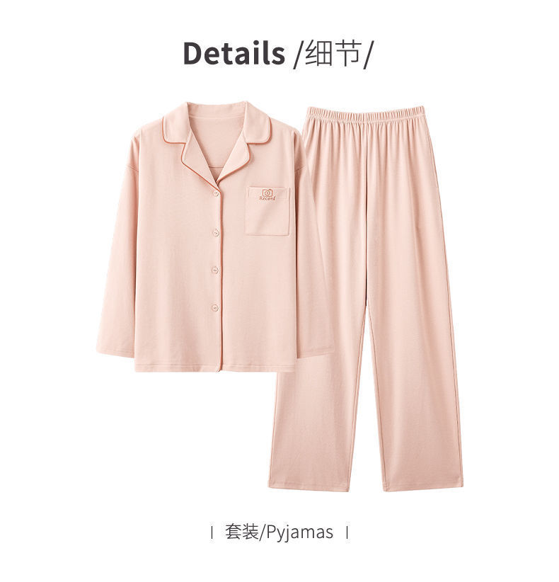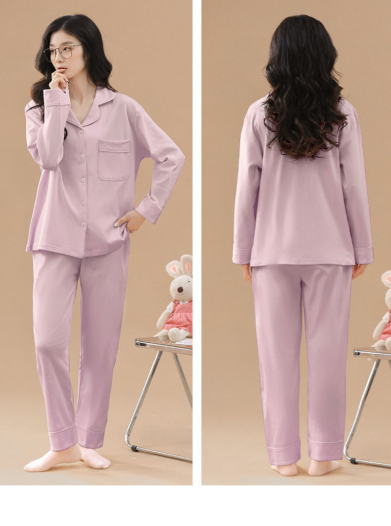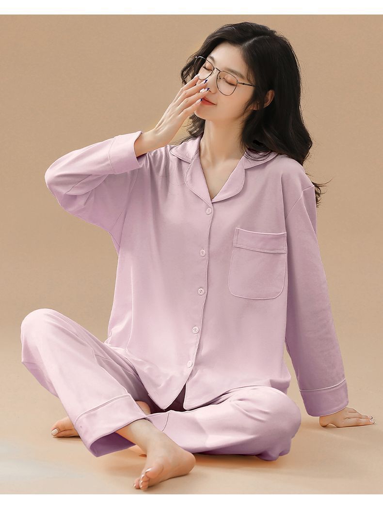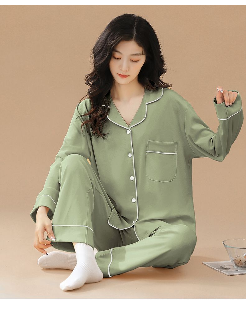Pijama de algodón de primavera y otoño de color sólido de otoño pantalones de manga larga cardigan damas de tamaño grande se puede usar fuera conjunto de ropa de casa