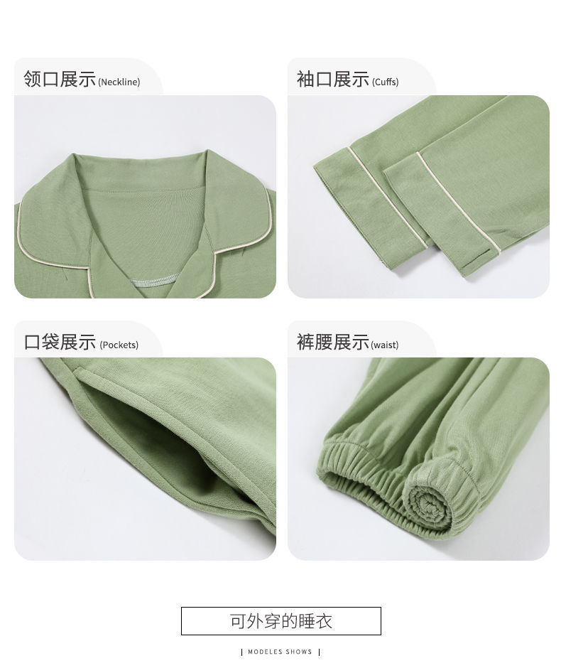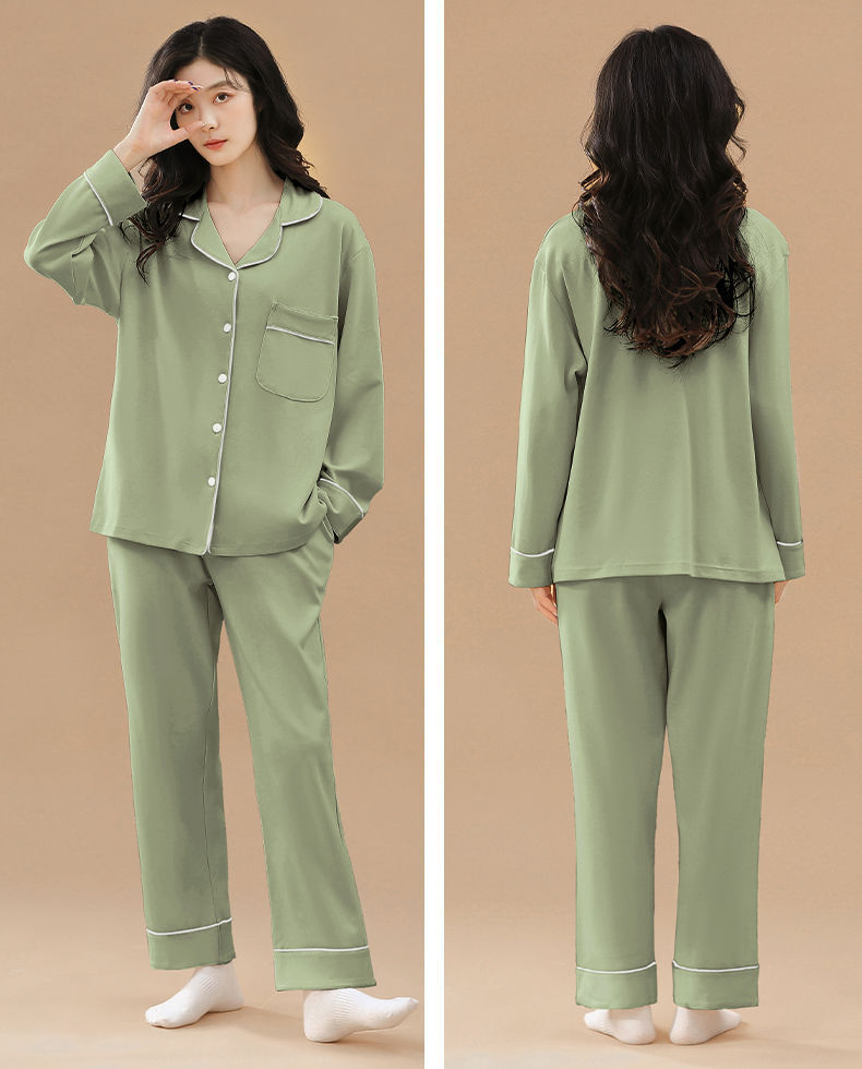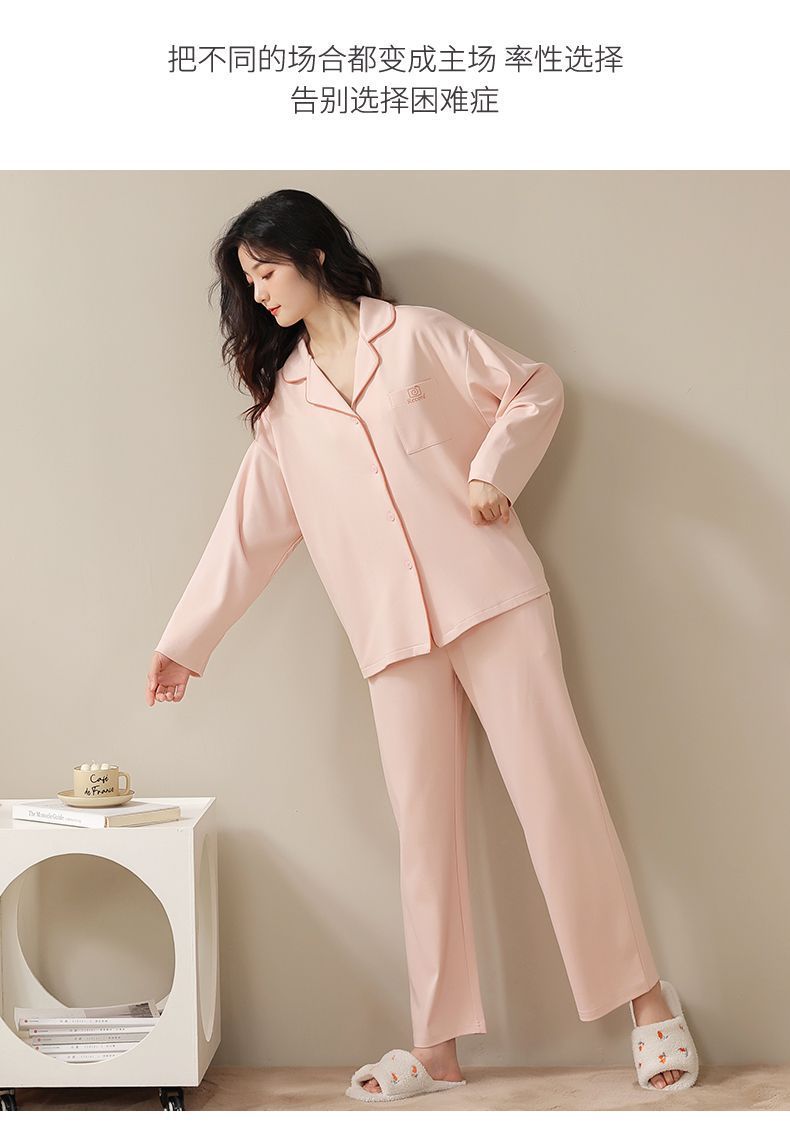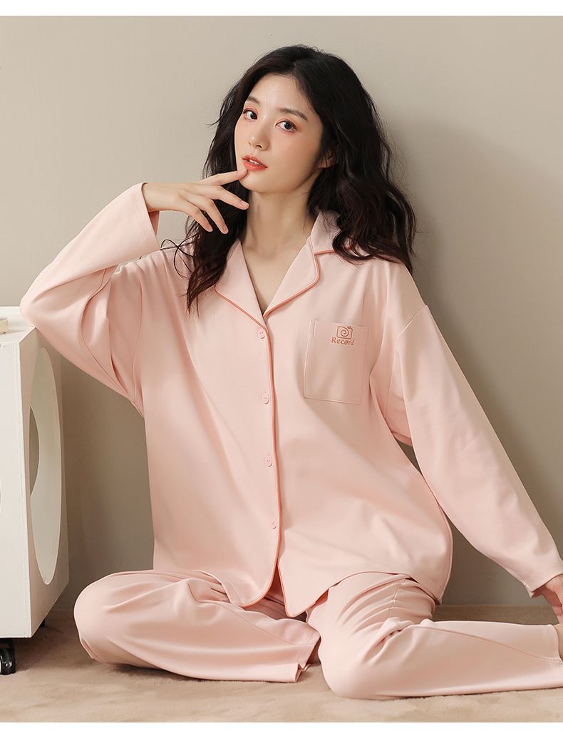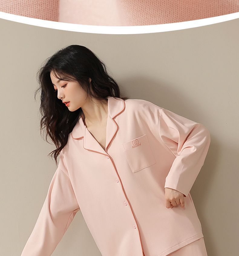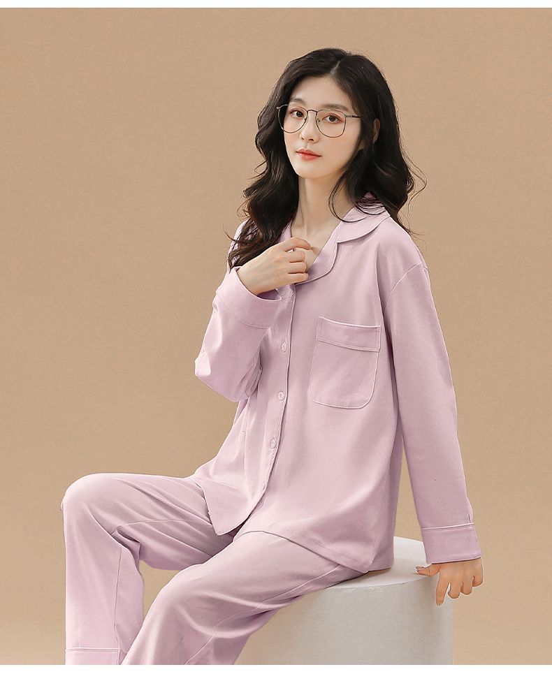 Pijama de algodón de primavera y otoño de color sólido de otoño pantalones de manga larga cardigan damas de tamaño grande se puede usar fuera conjunto de ropa de casa