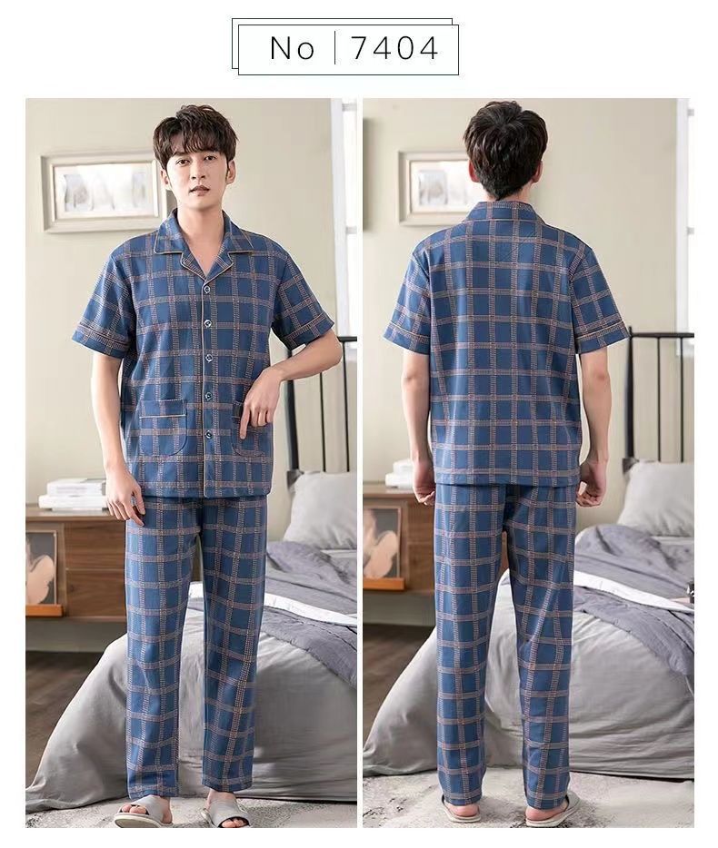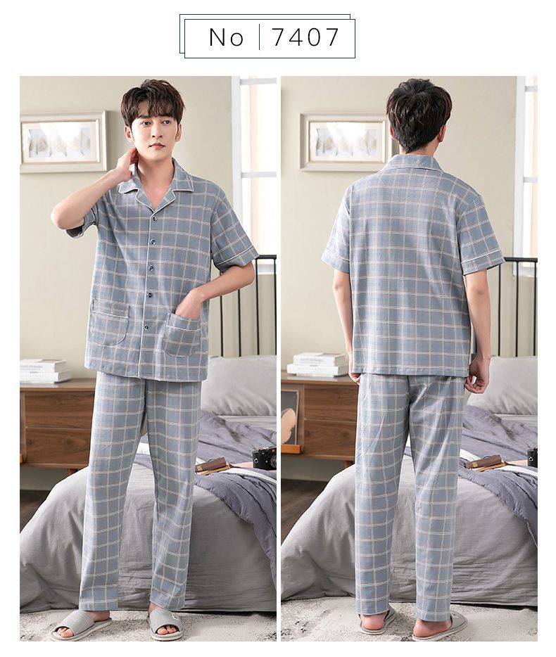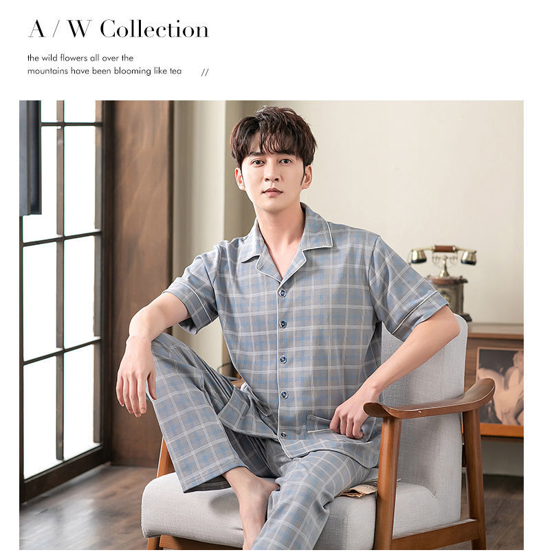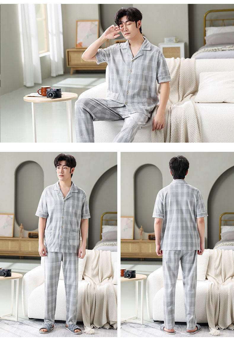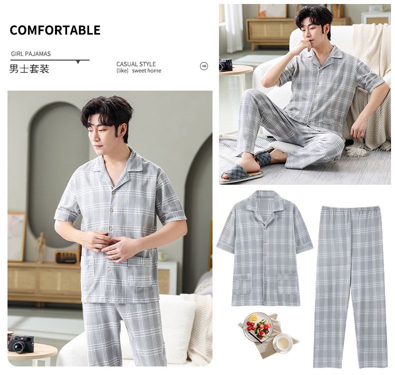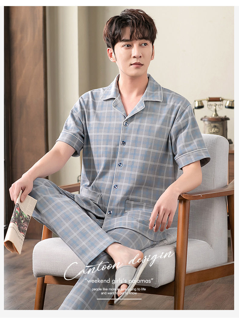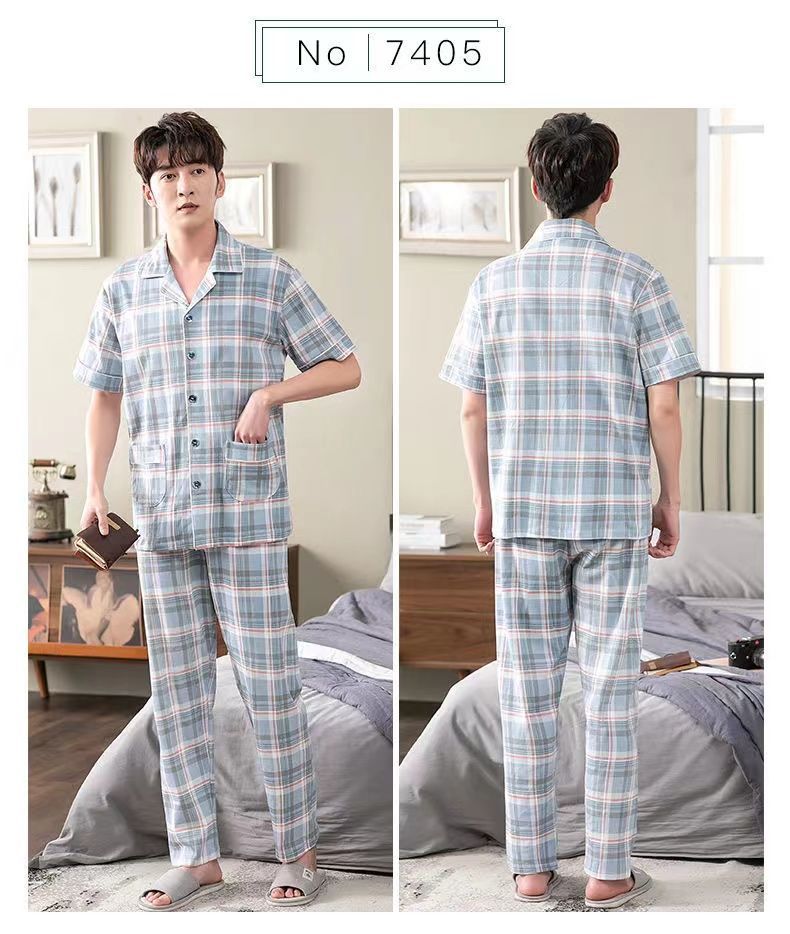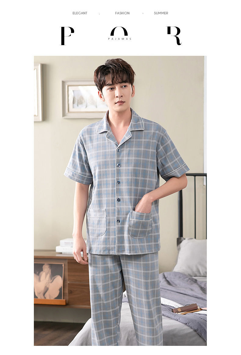 Pijamas de hombre Pantalones de manga corta de verano traje de dos piezas 100% algodón suelto más tamaño cardigan Plaid ropa para el hogar