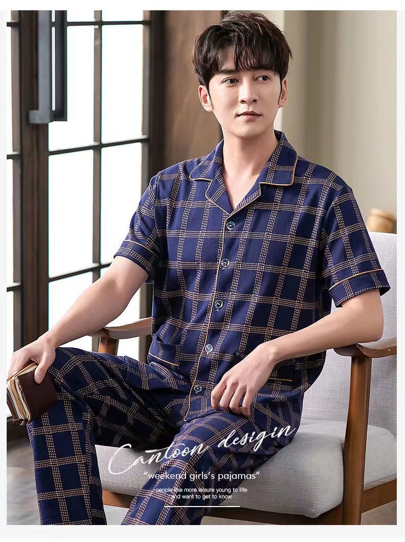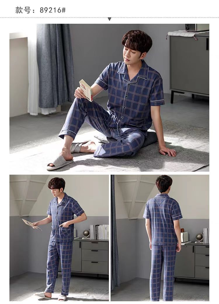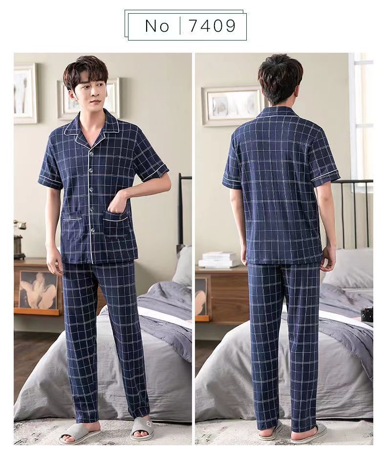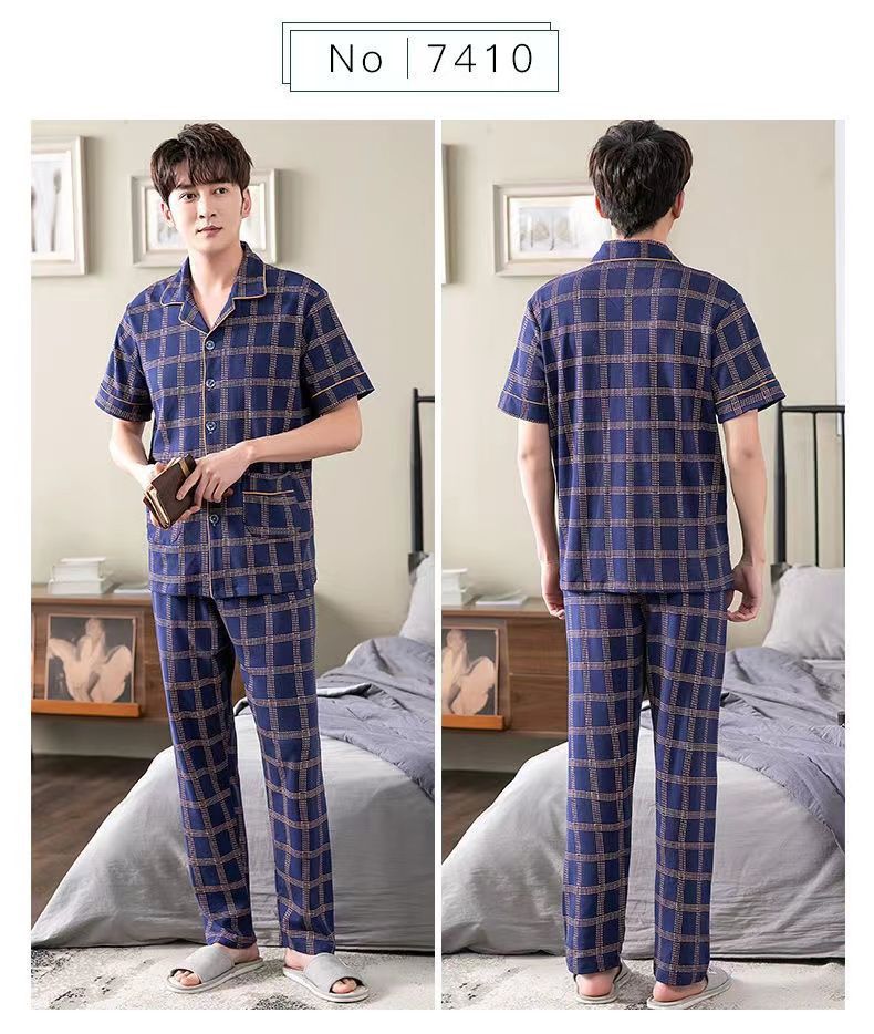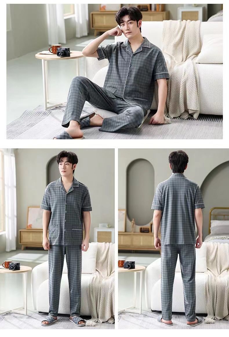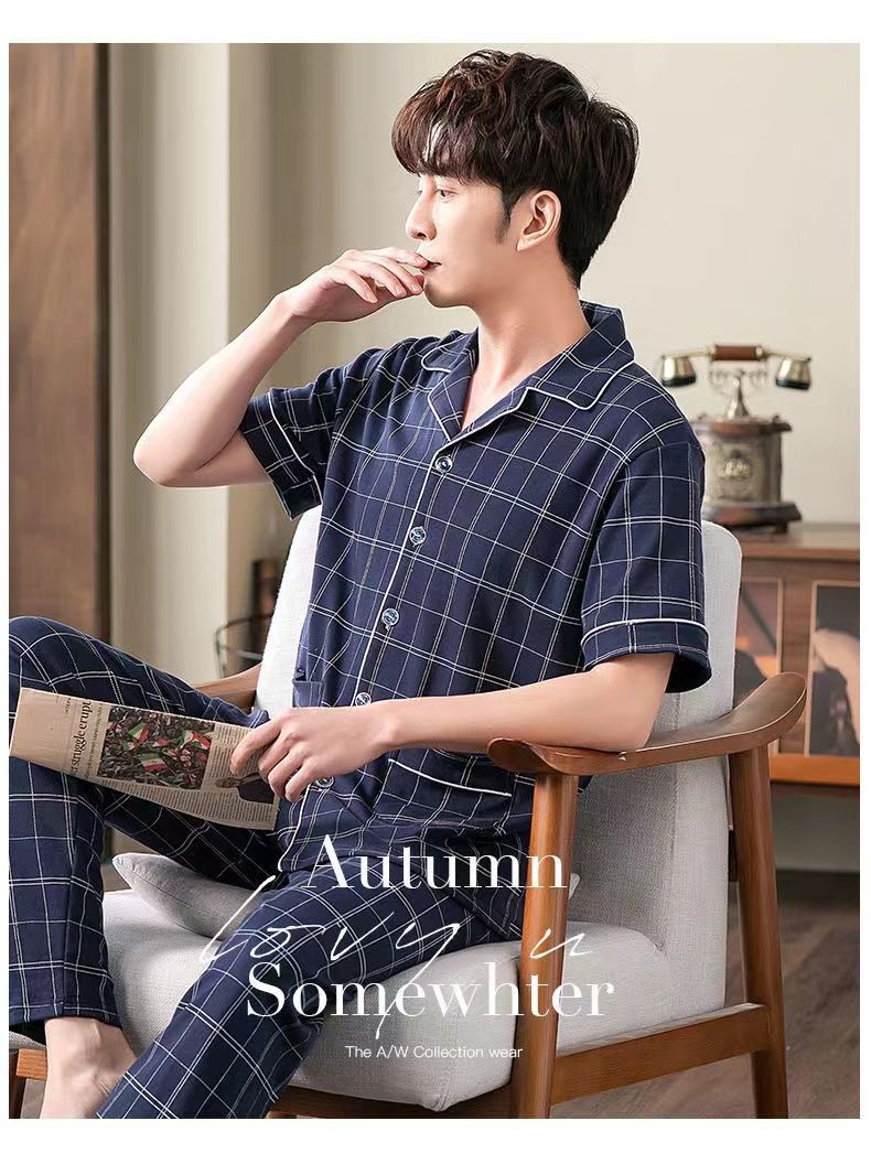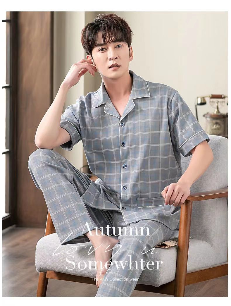 Pijamas de hombre Pantalones de manga corta de verano traje de dos piezas 100% algodón suelto más tamaño cardigan Plaid ropa para el hogar