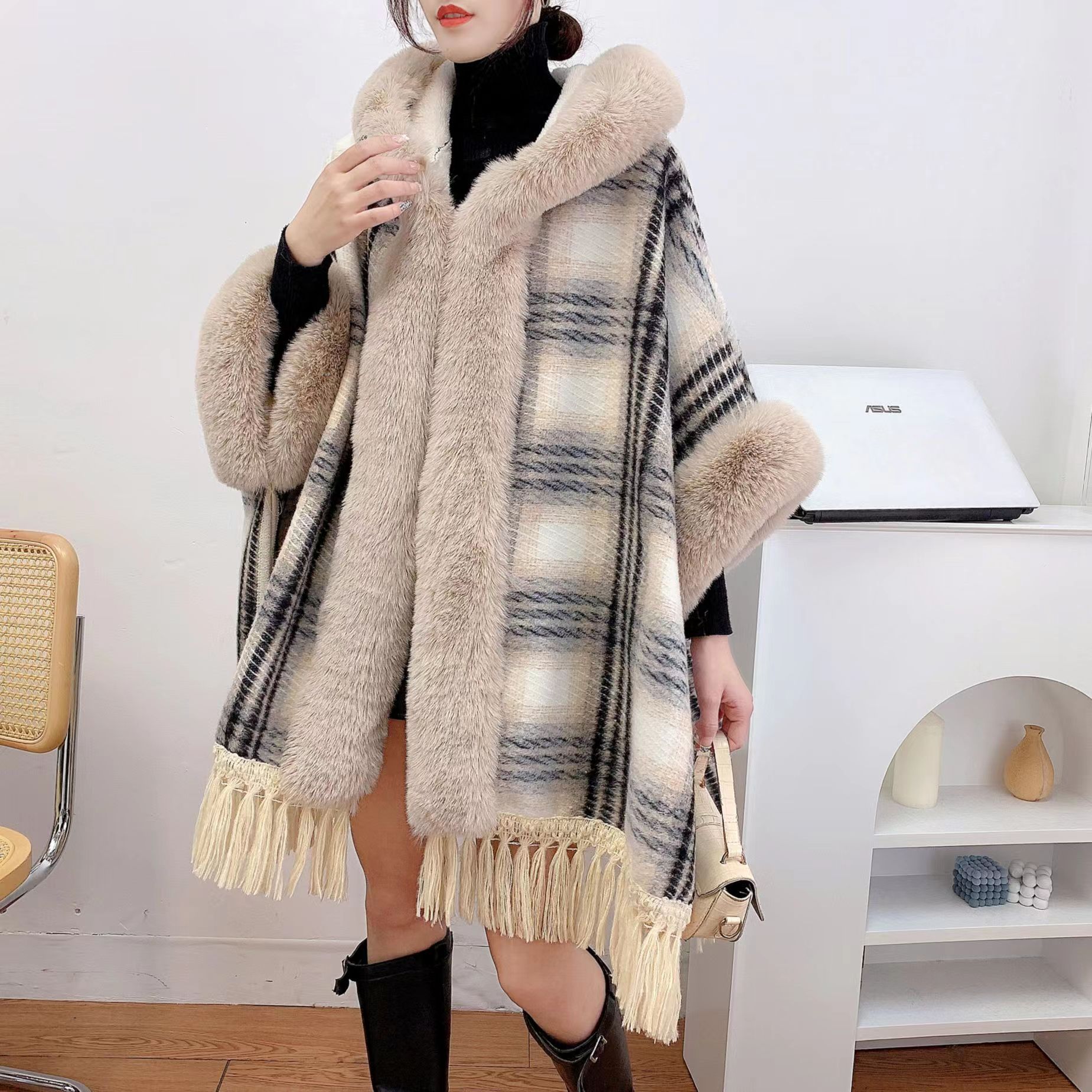 Abrigo de mantón del Cabo de invierno para mujer nueva moda con forro polar borla gruesa Cuello de piel con capucha abrigo de longitud media dulce