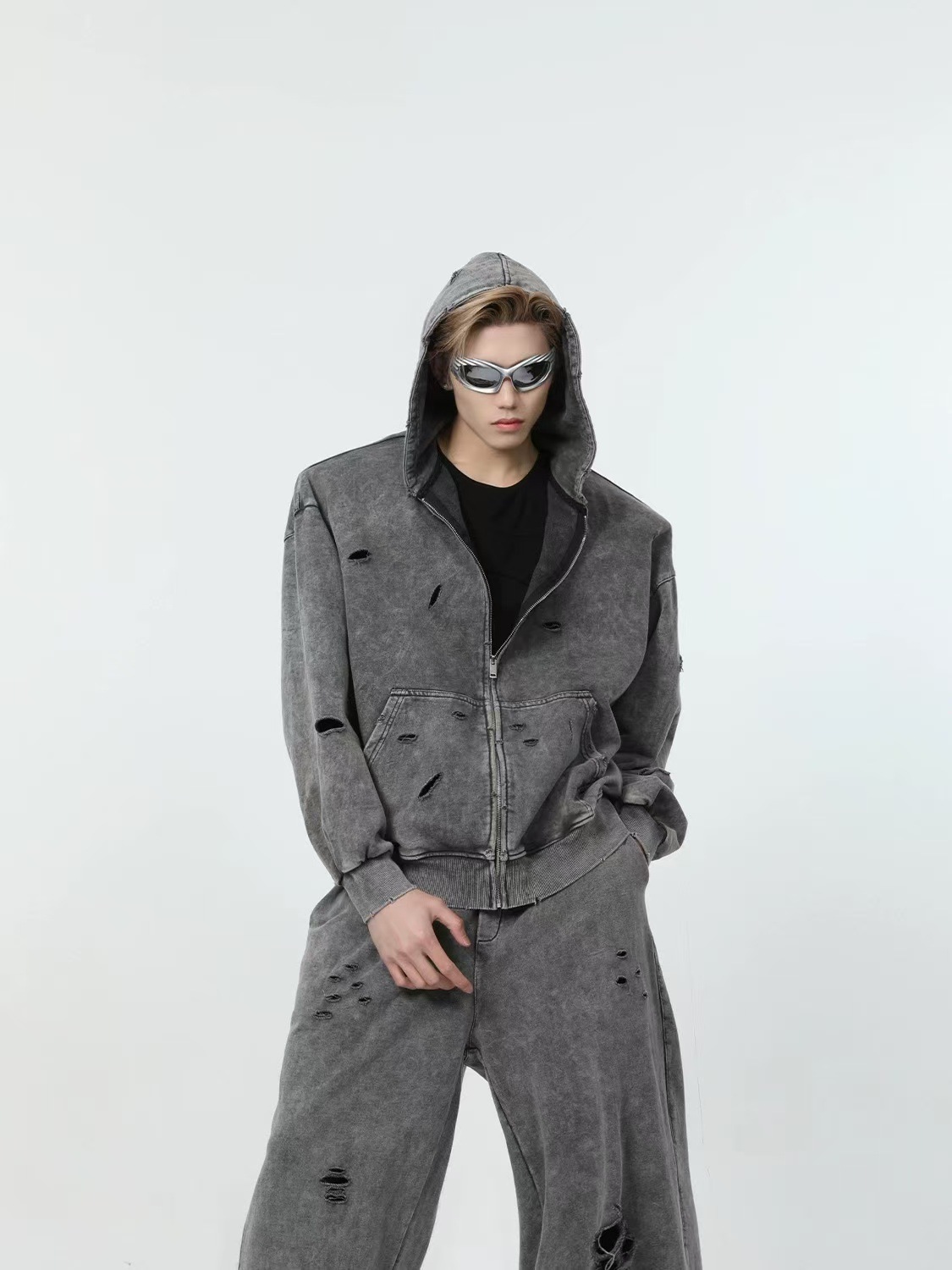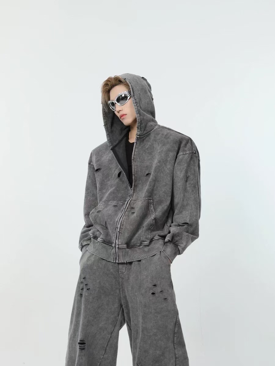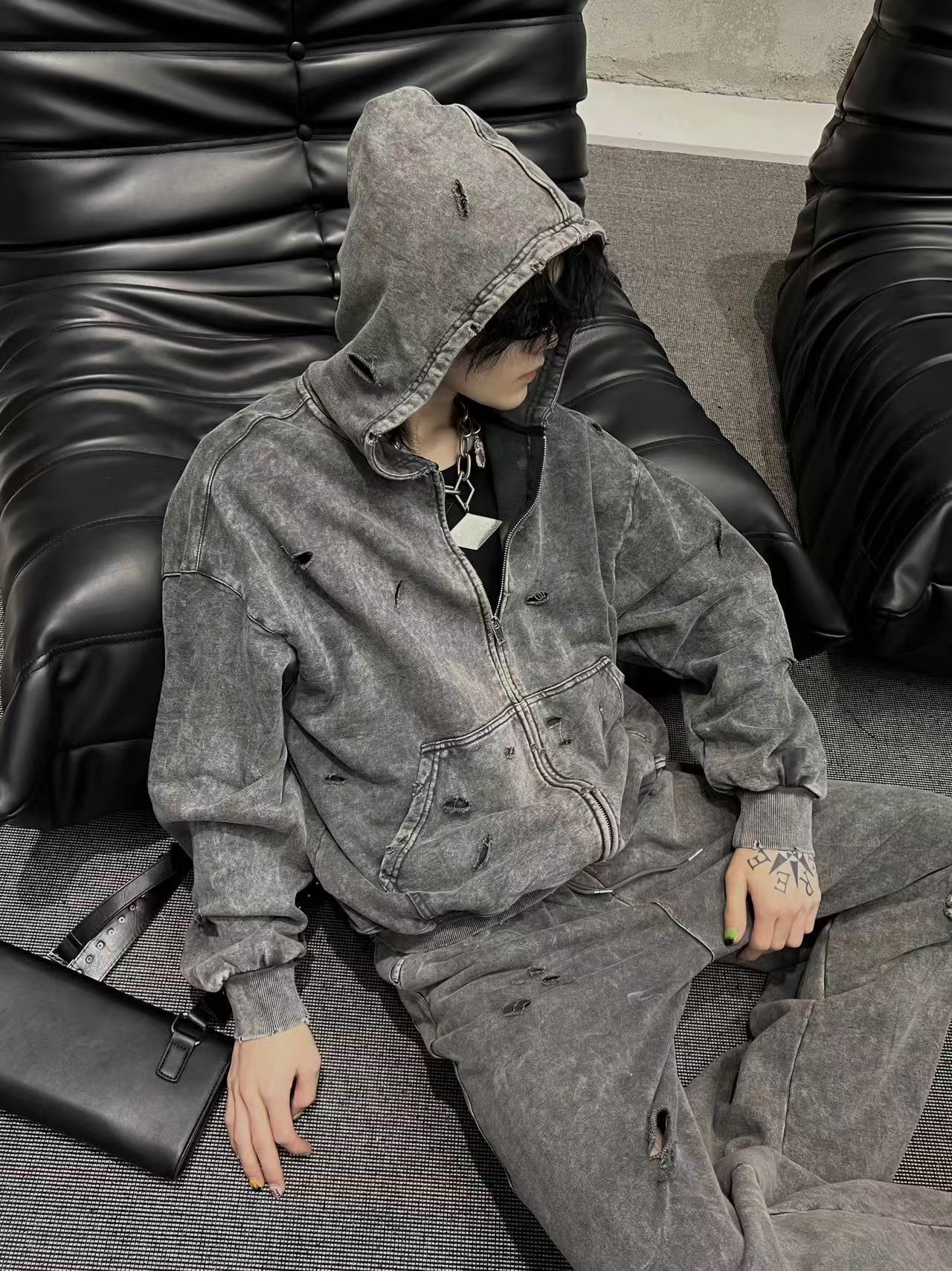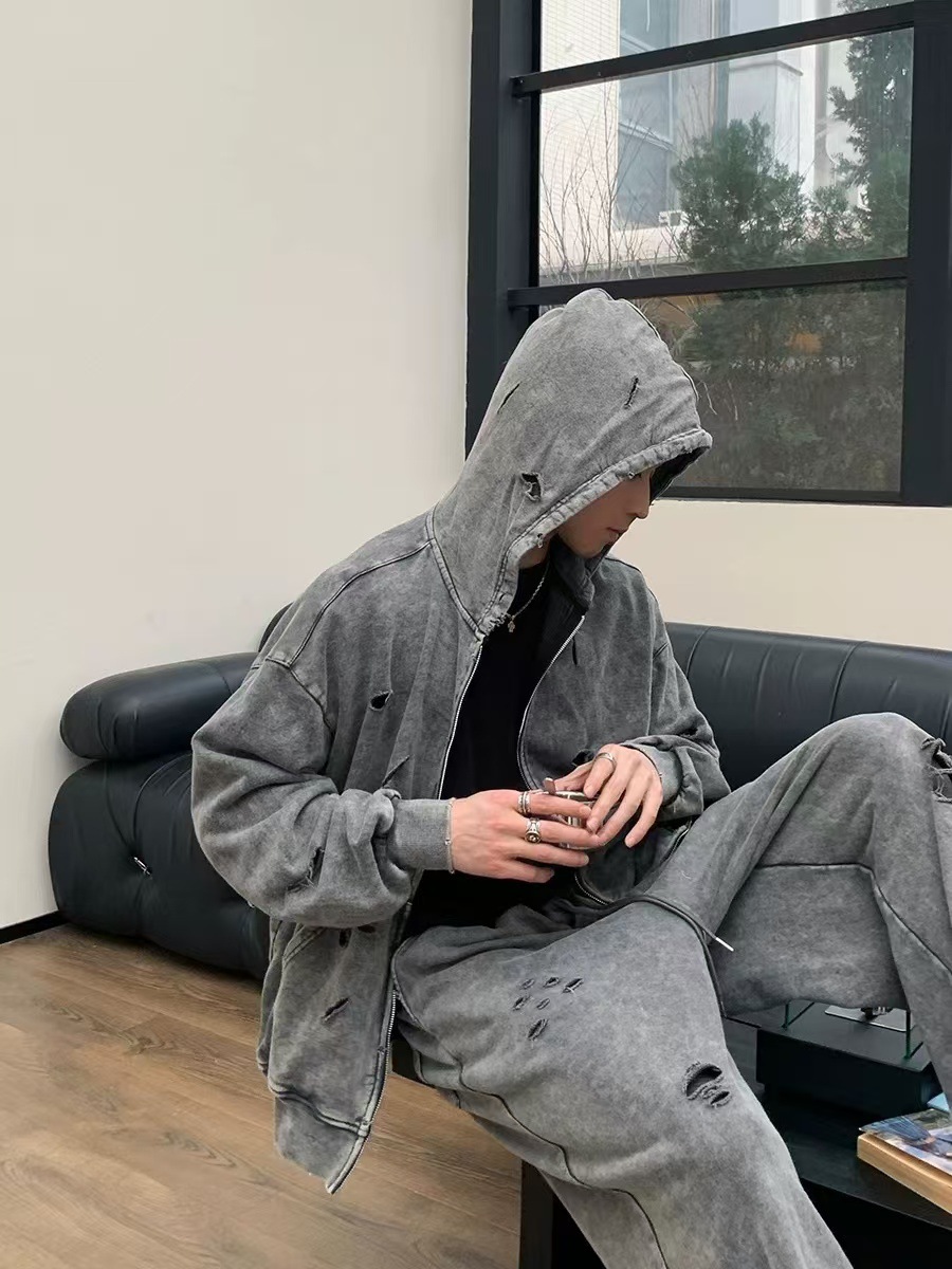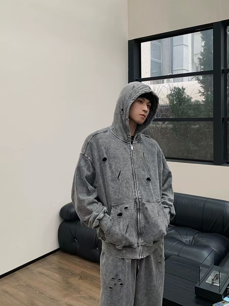 Amazon nuevo agujero sudadera con capuz hombre lavado con agua pesado suelto versátil pareja retro la misma camisa de moda
