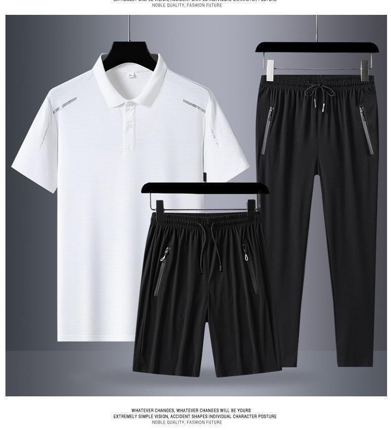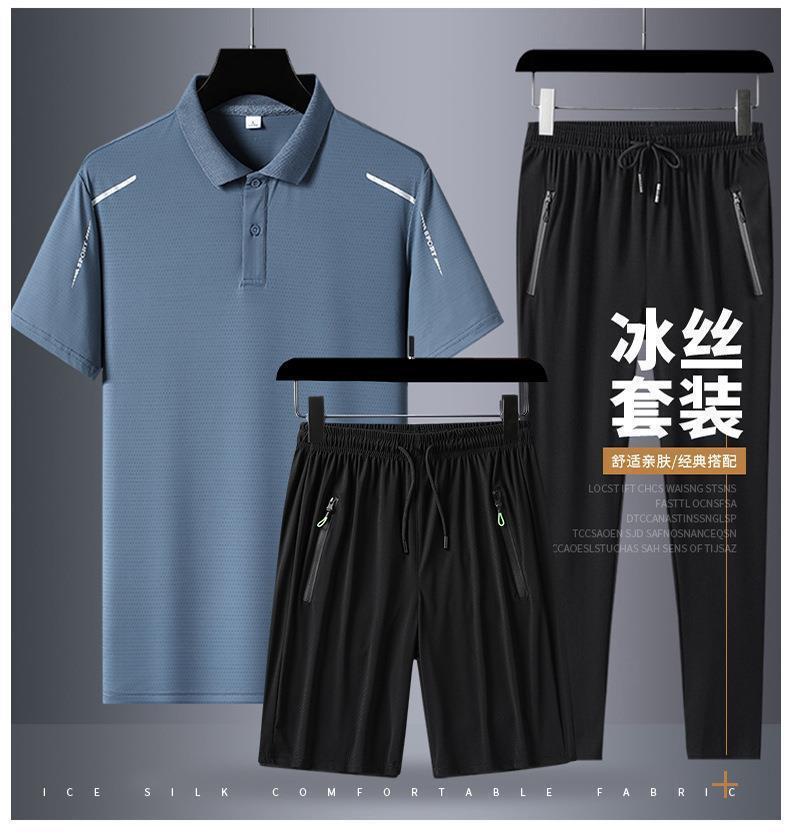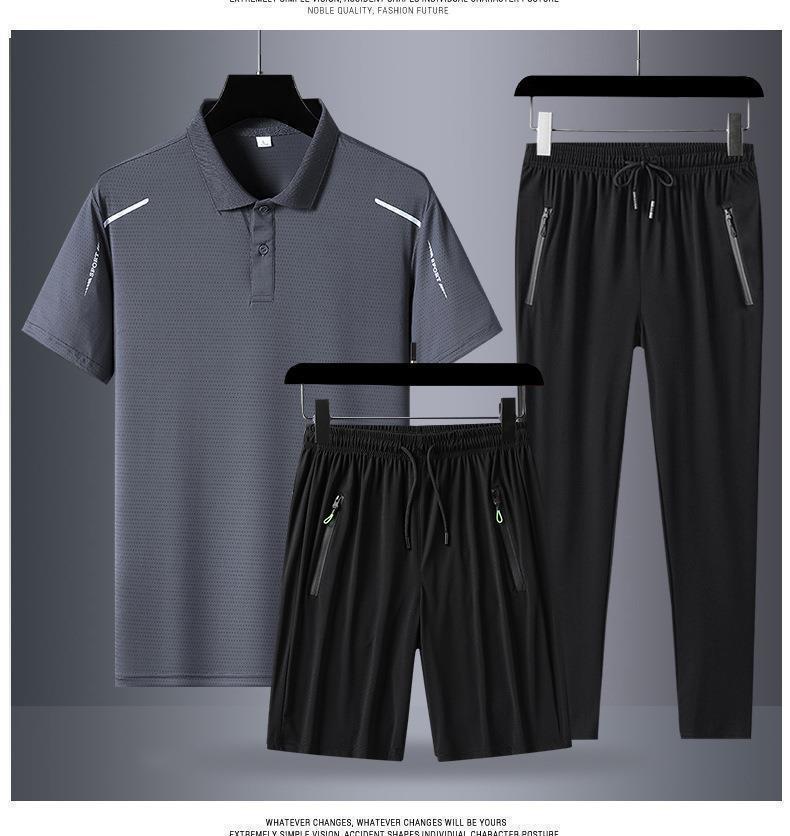 Verano helado juego deportivo hombre rápido secado tres piezas juego casual mangas cortas pantalones largos polo juego deportivo al por mayor
