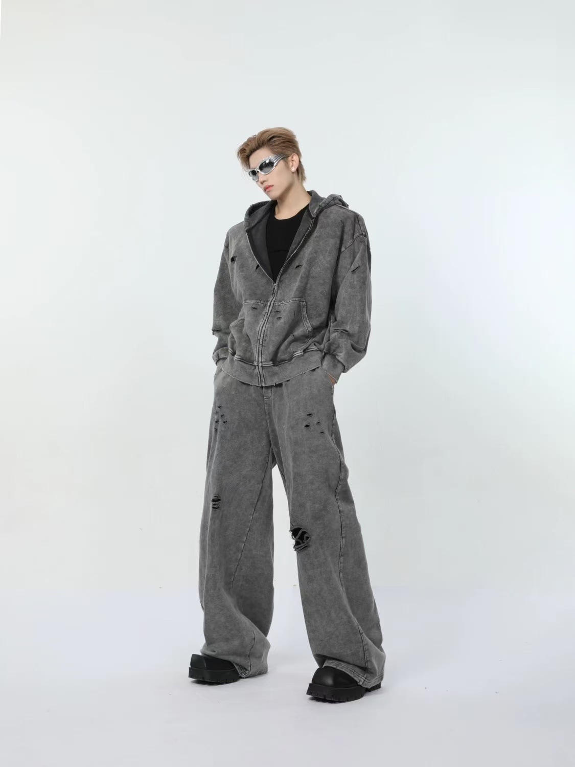 Otoño y invierno nuevos agujeros encapuchados sudaderos lavado con agua pesado suelto versátil retrógrado chaqueta de moda