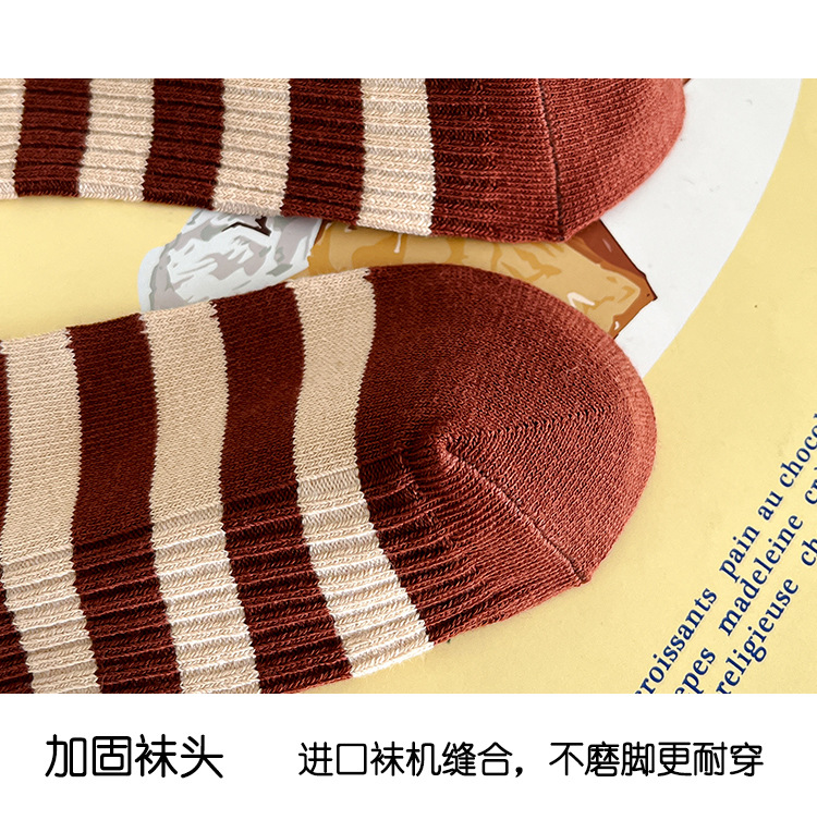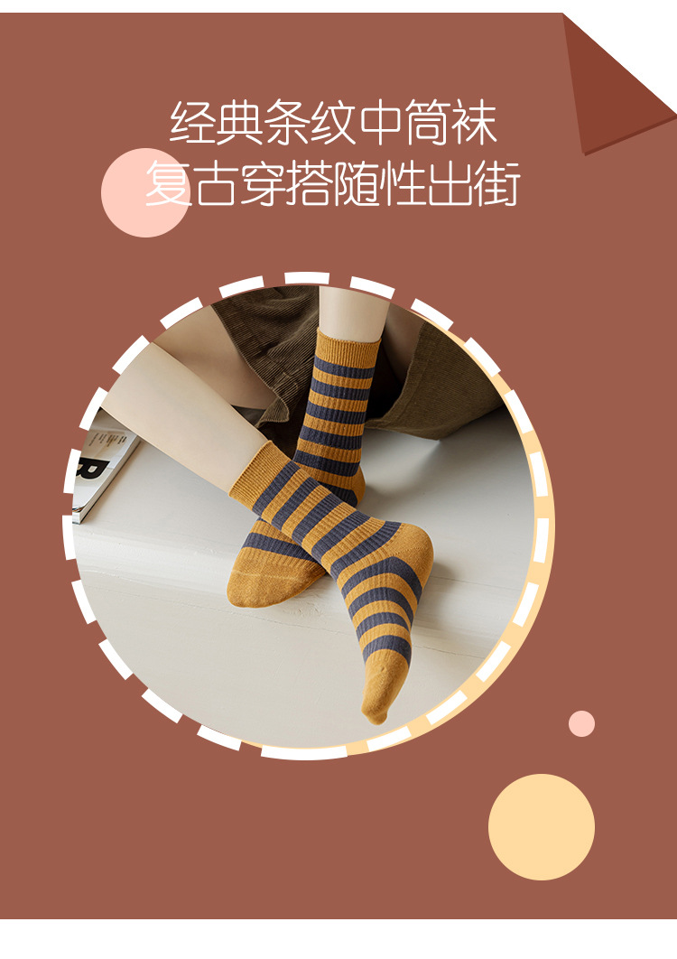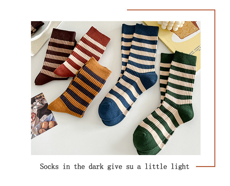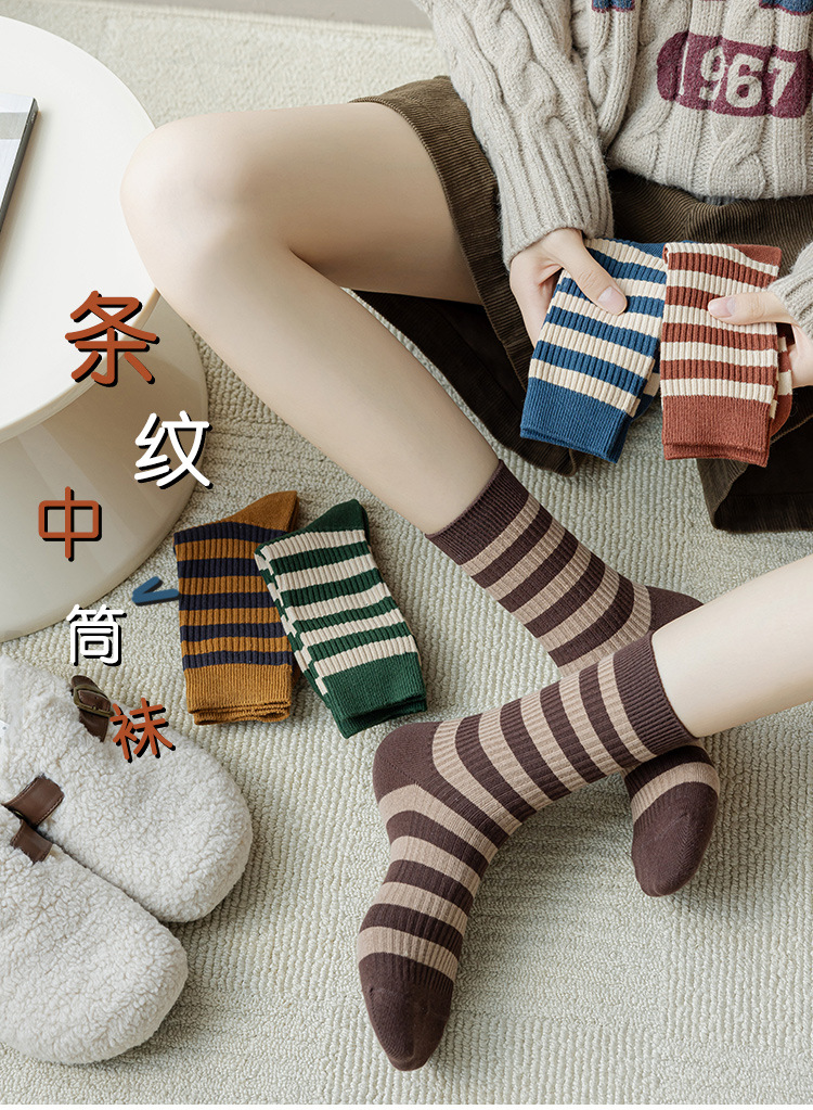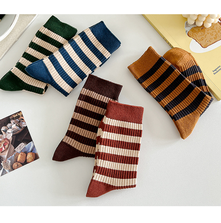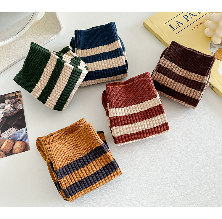 Primavera y otoño de las mujeres a rayas calcetines largos de algodón peinado de algodón de la vendimia de las mujeres de doble aguja calcetines de media pantorrilla Zhuji calcetines de las mujeres al por mayor