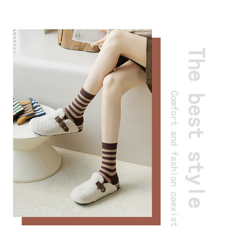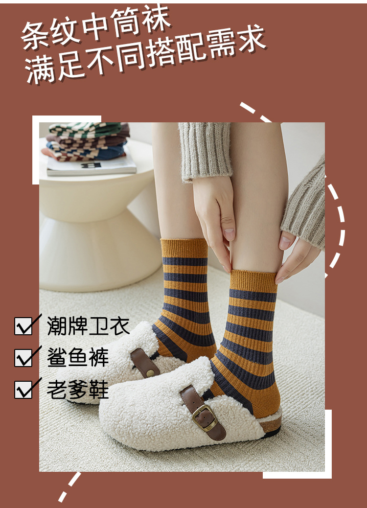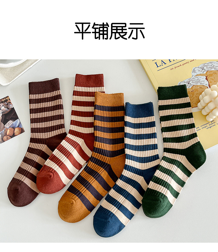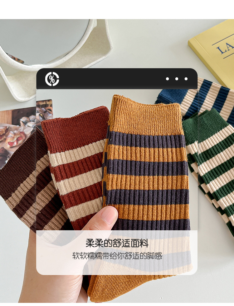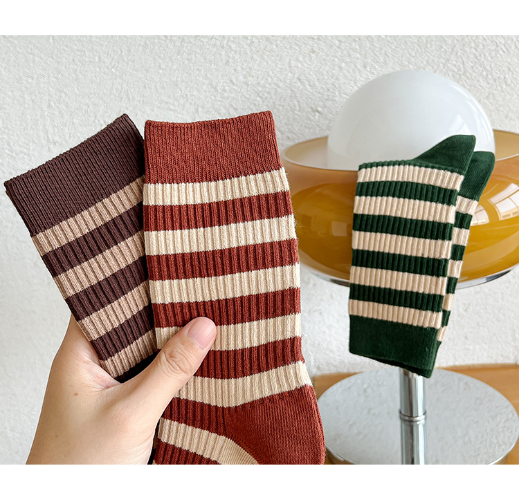 Primavera y otoño de las mujeres a rayas calcetines largos de algodón peinado de algodón de la vendimia de las mujeres de doble aguja calcetines de media pantorrilla Zhuji calcetines de las mujeres al por mayor