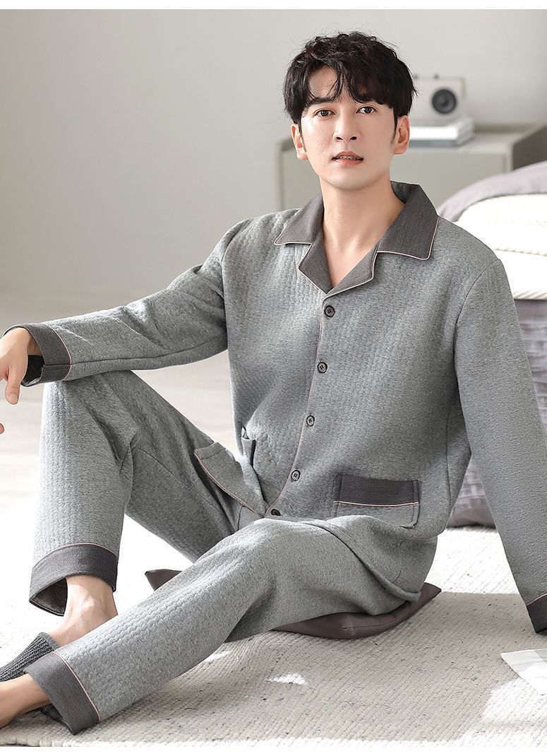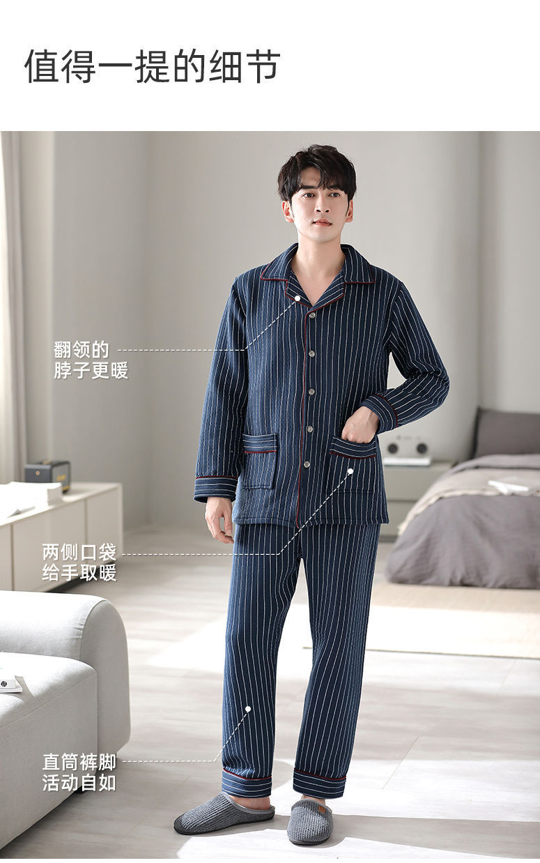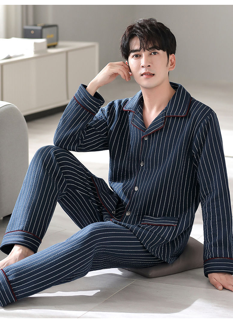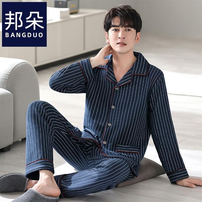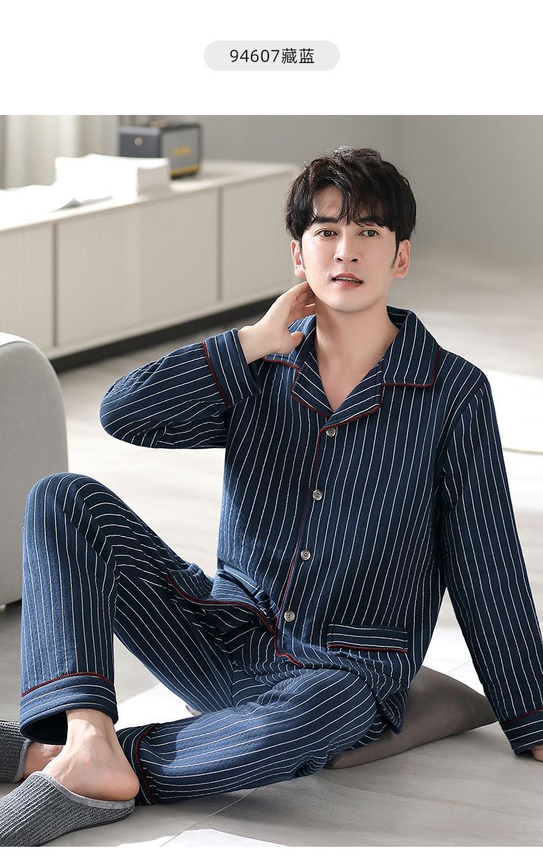 Pijamas de algodón puro para hombres de primavera y otoño engrosado de manga larga para hombres de otoño e invierno ropa de hogar de invierno para hombres acolchada fina