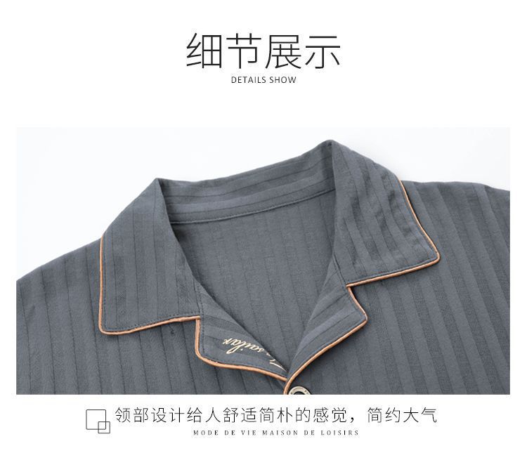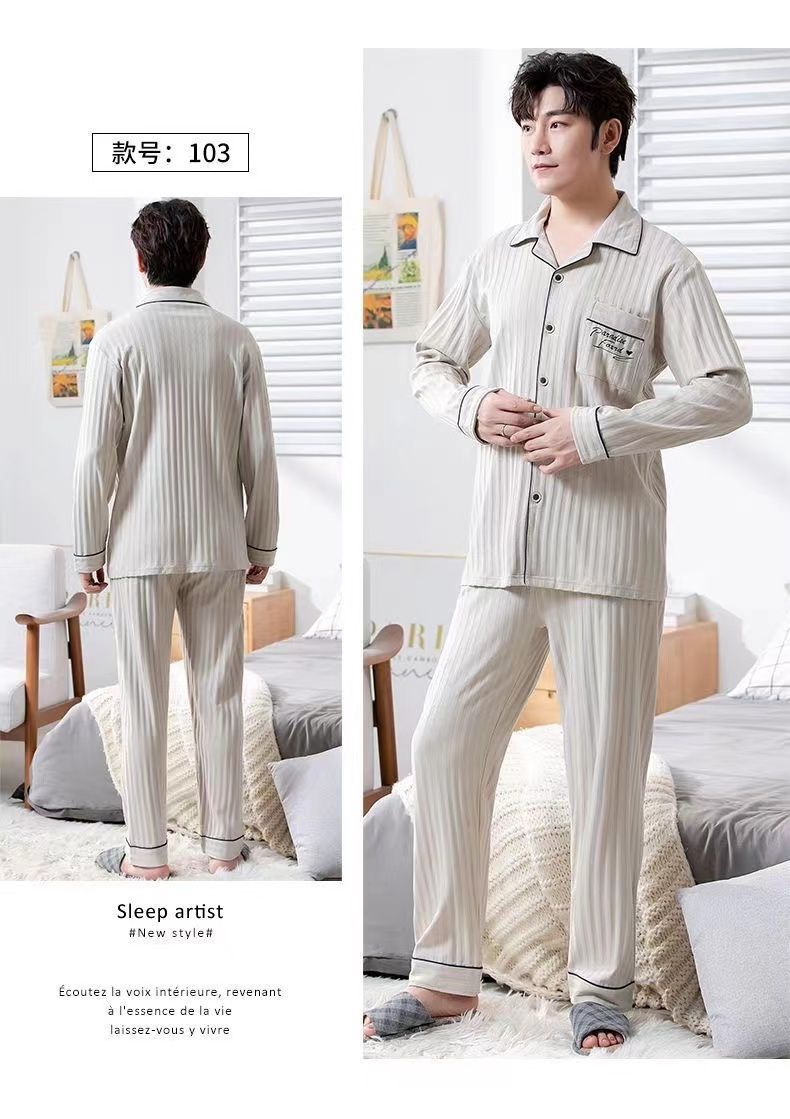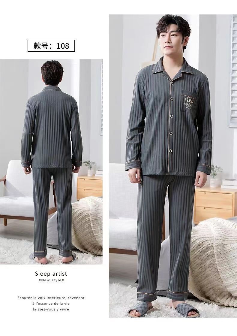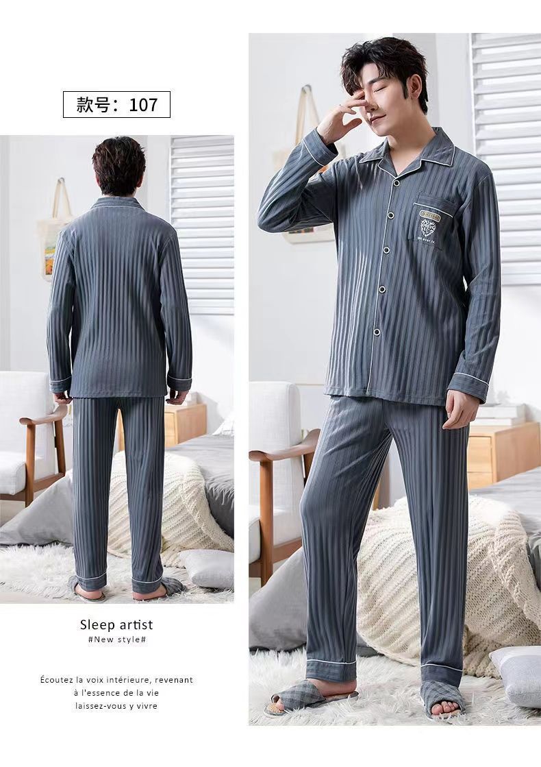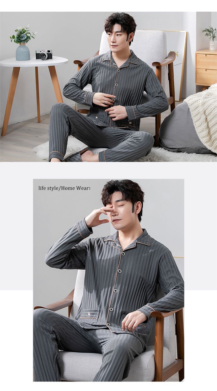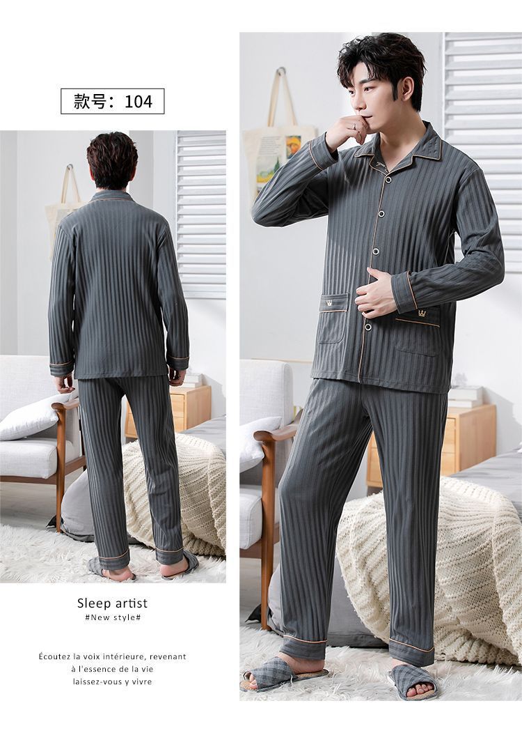 Pijama de algodón masculino primavera y otoño cardigan de manga larga suelta más grande se puede usar fuera del conjunto de ropa de casa