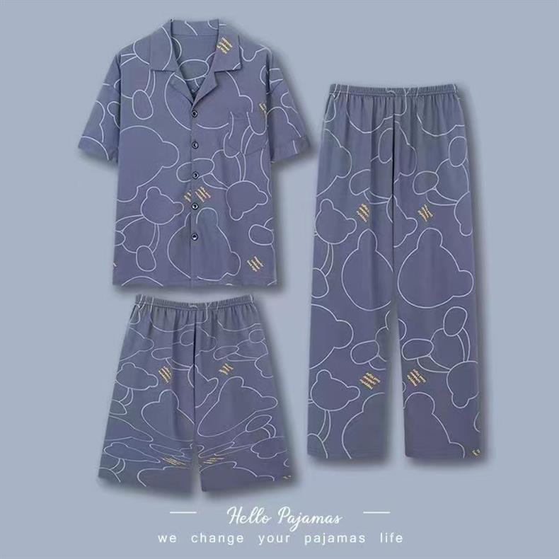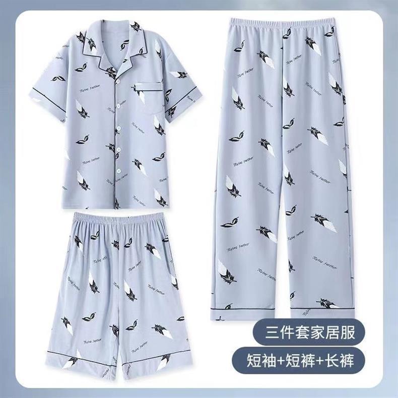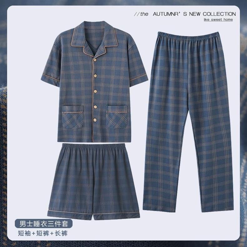 Pajamas de hombre de algodón de tres piezas, pantalones largos de manga corta de verano, ropa casera para hombres, set delgado casual
