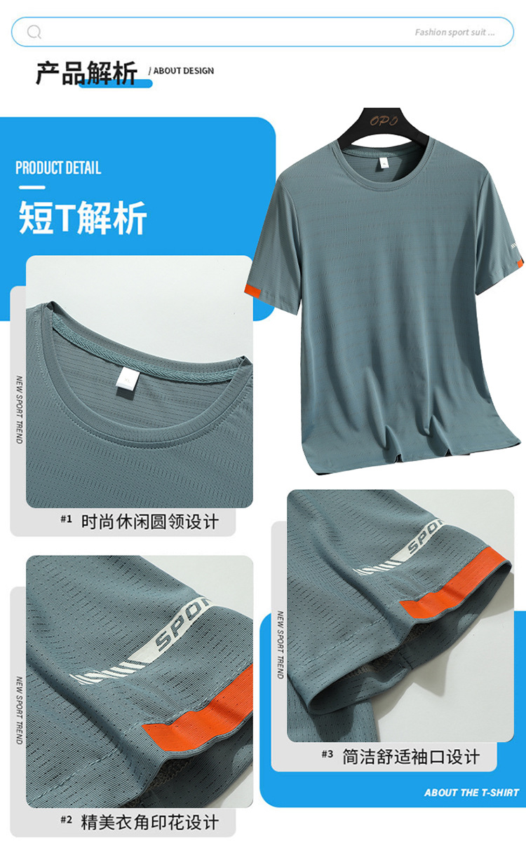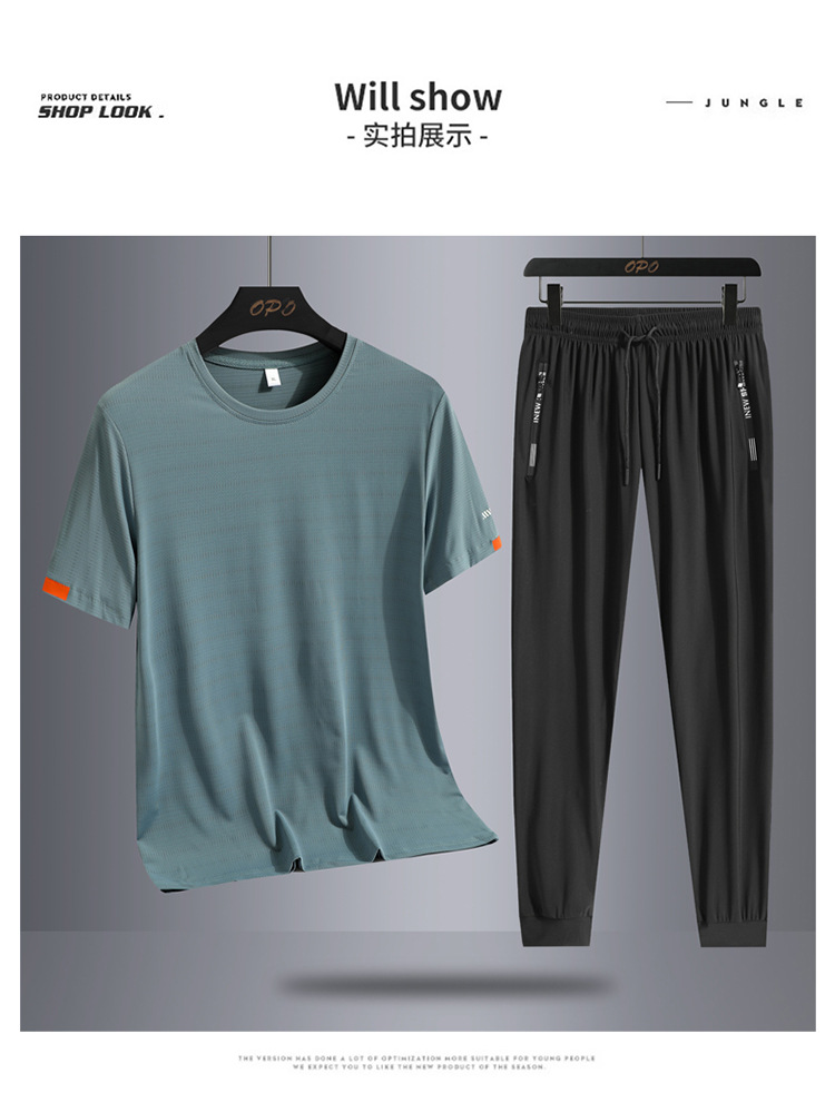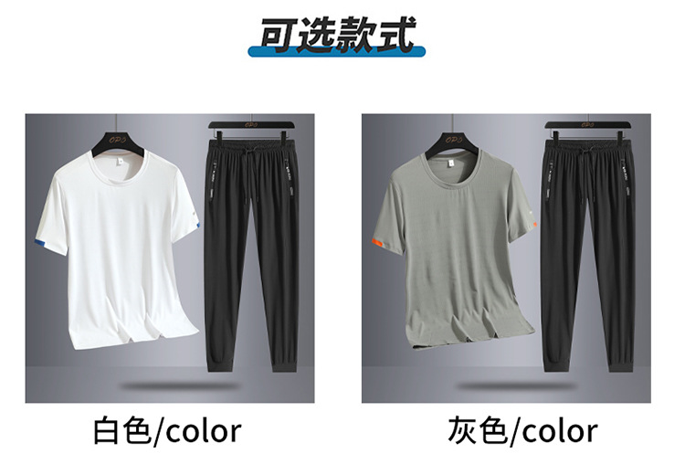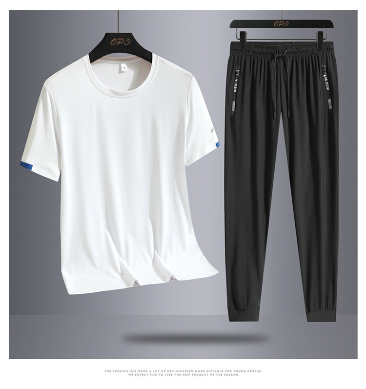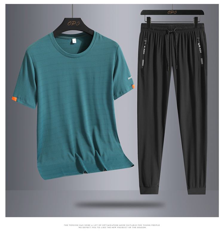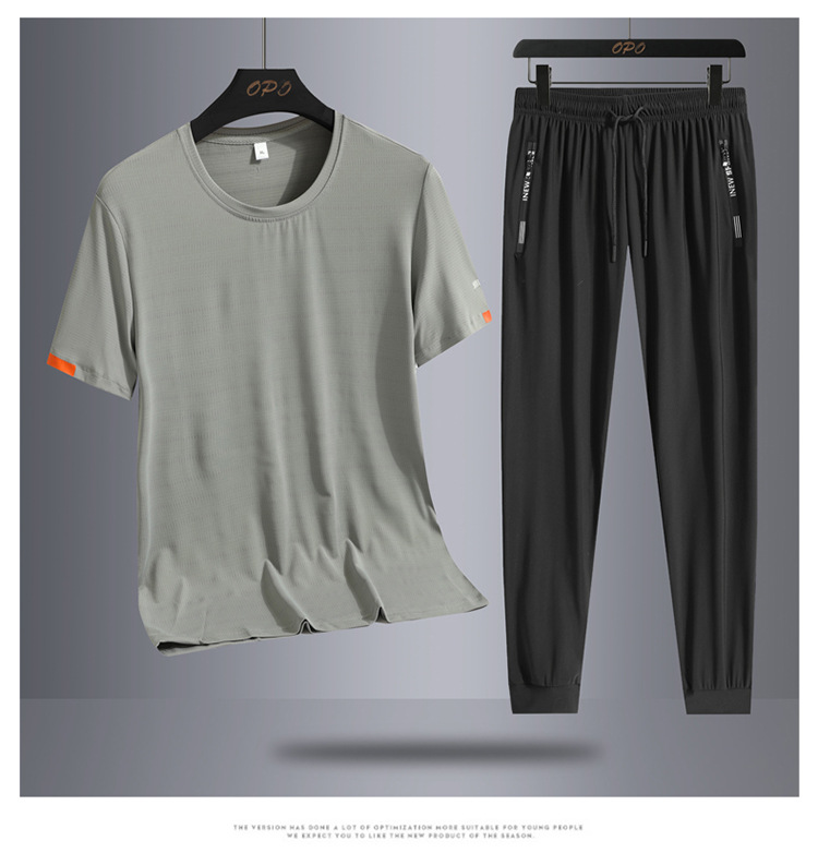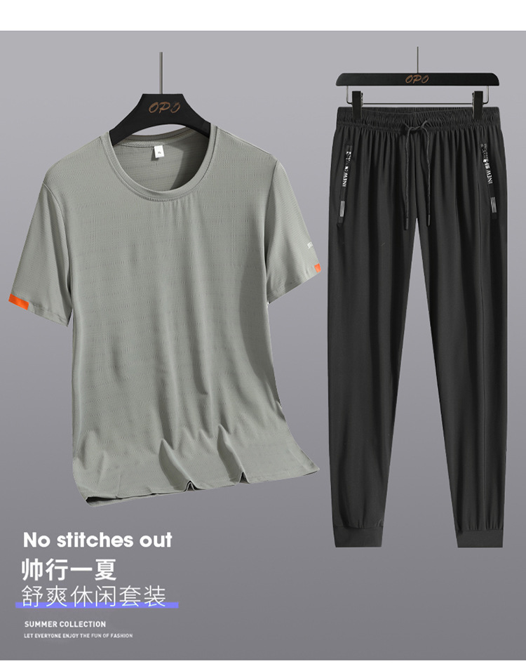 Verano helado juego casual hombre deportivo al aire libre suelto hombre dos piezas juego transpirable secado rápido cuello redondo camiseta pantalón largo