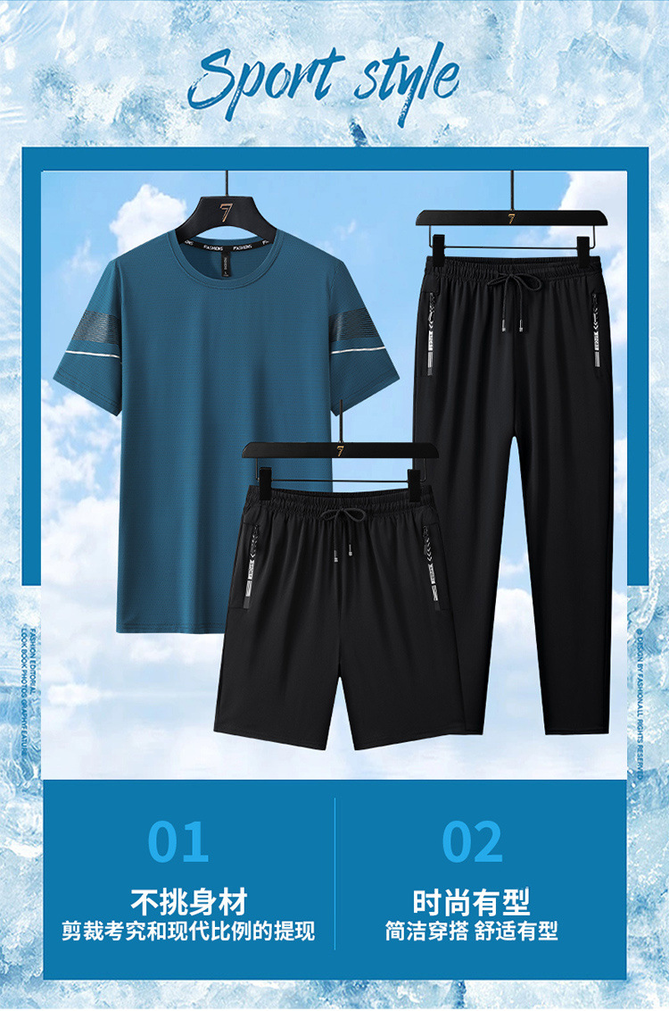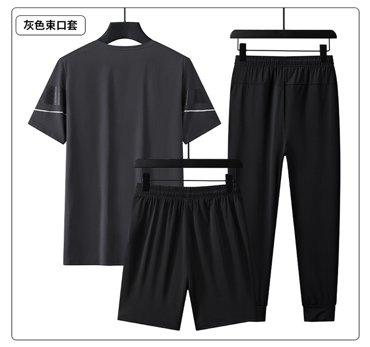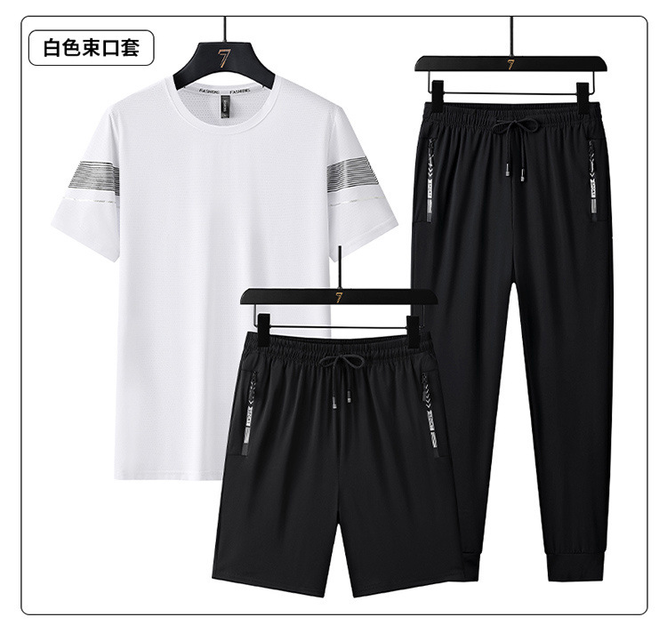 Trajes deportivos de seda de hielo de verano para hombres, mangas cortas, pantalones cortos, pantalones largos, carreras casuales, secado rápido, delgado, conjunto de tres piezas al por mayor
