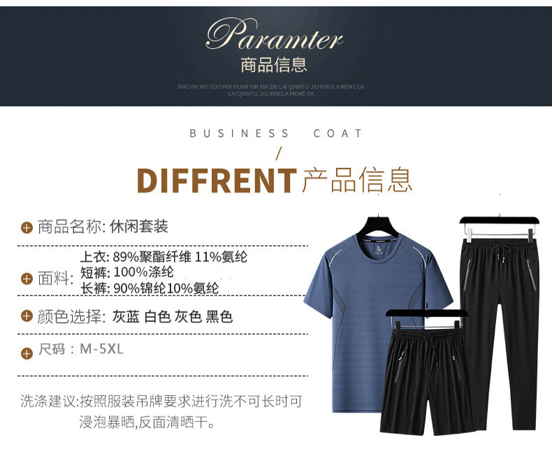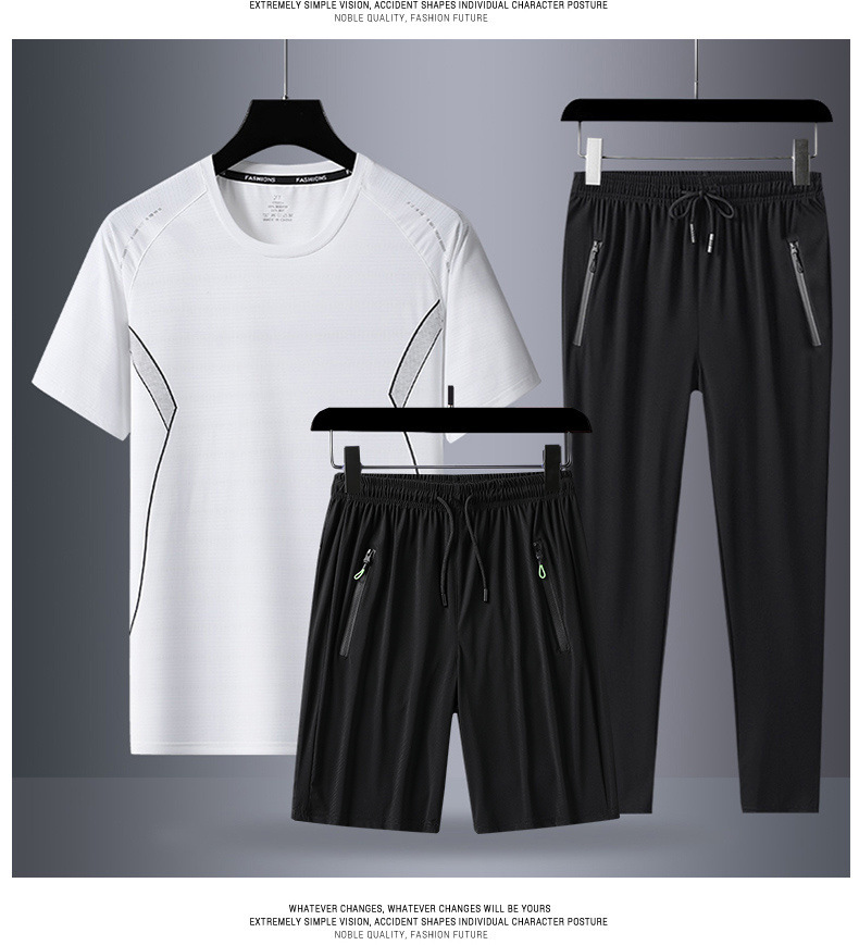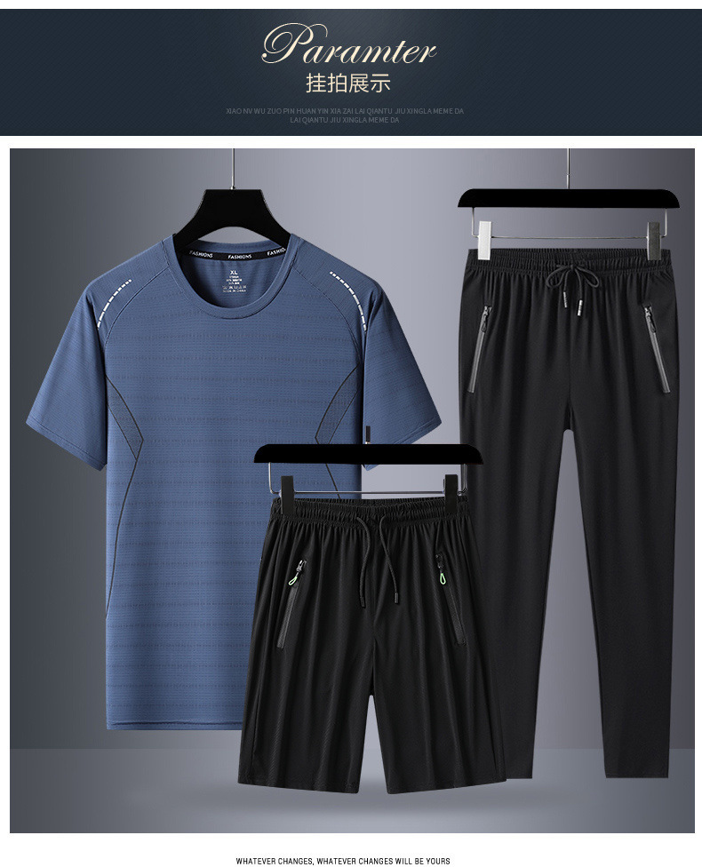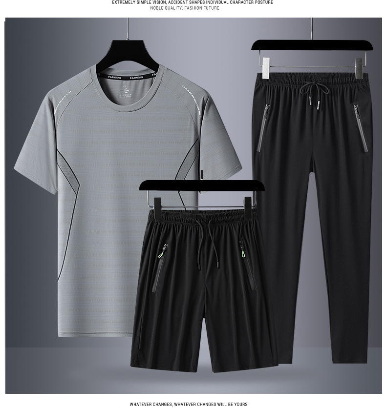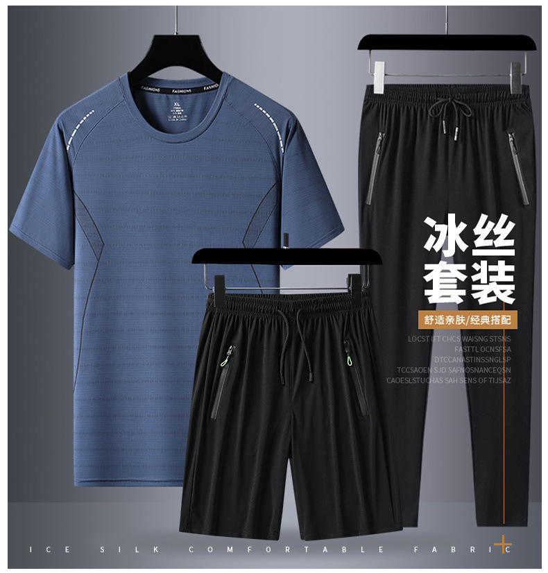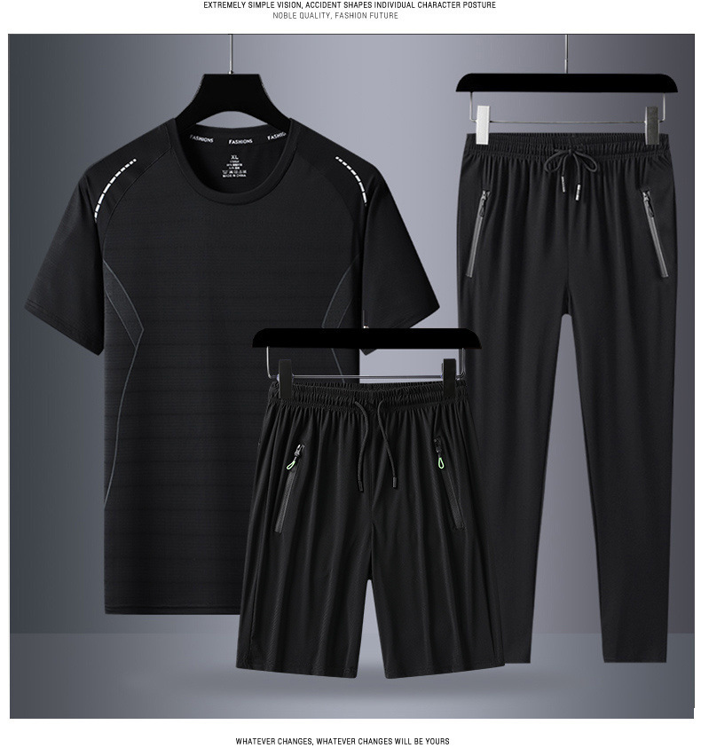 Verano hombre camiseta de mangas cortas tres piezas set gran hielo secado rápido chaqueta pantalones cortos deportivos casuales dos piezas set al por mayor