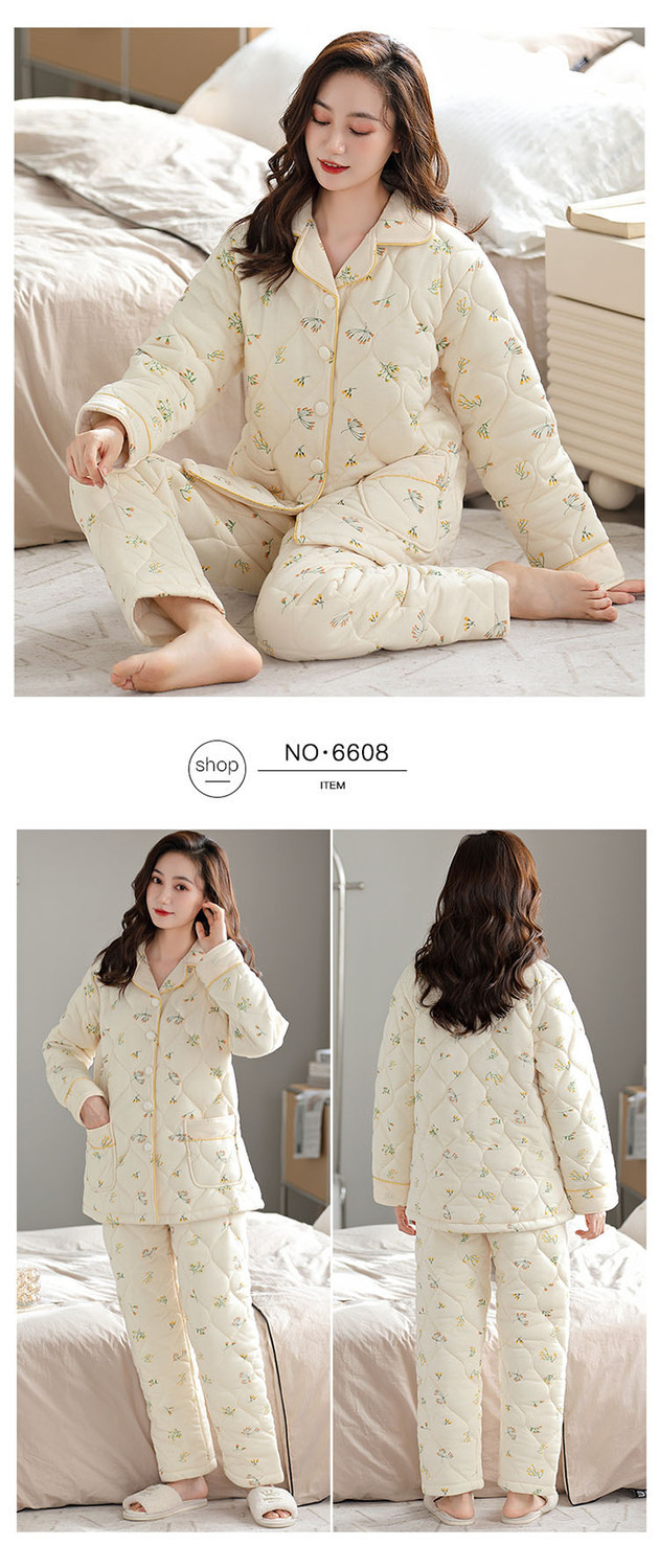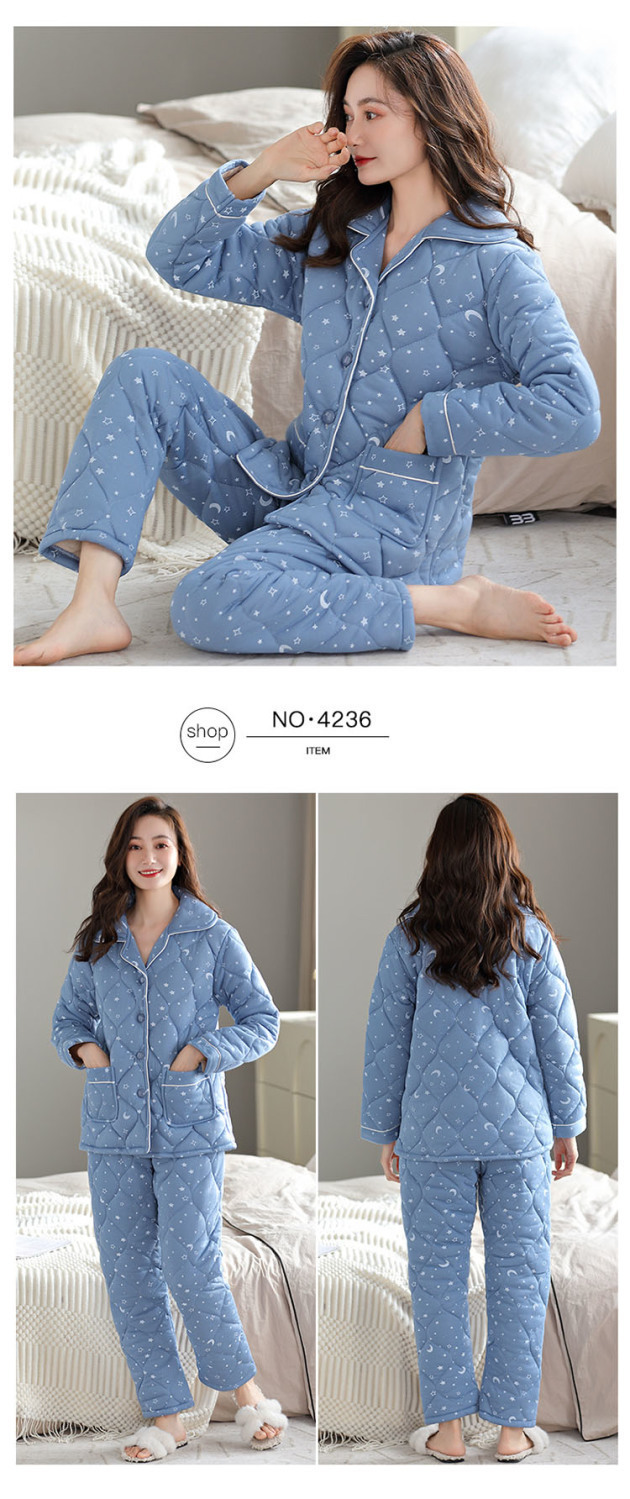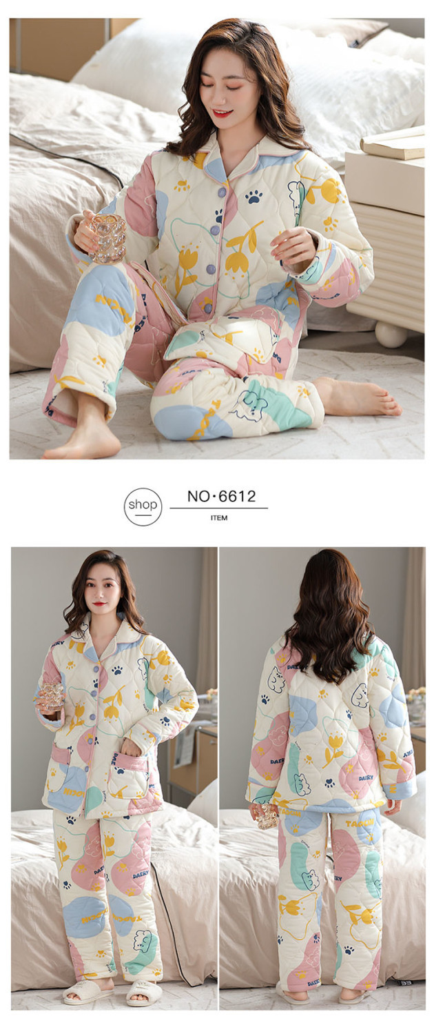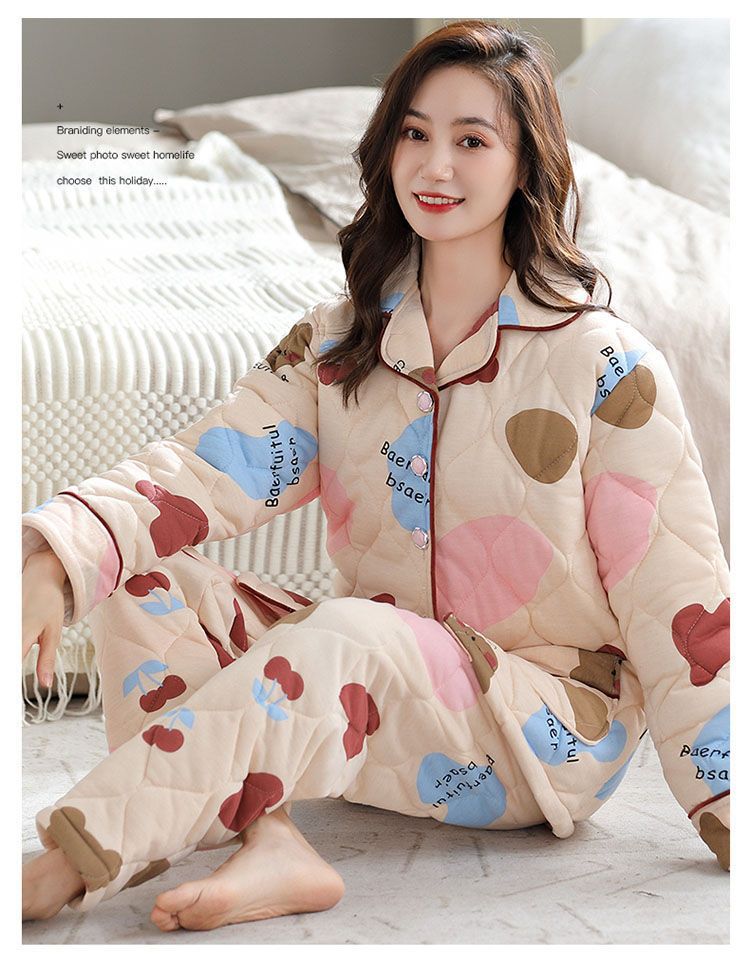 100% algodón engrosado de tres capas de las mujeres acolchadas de otoño e invierno pijamas estilo occidental simple traje de desgaste para el hogar