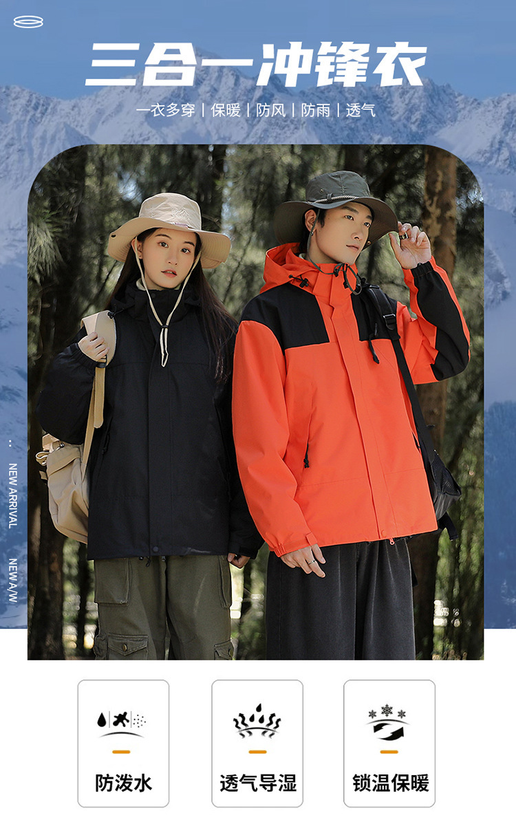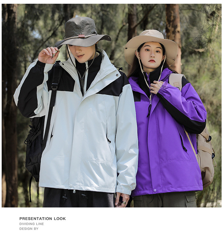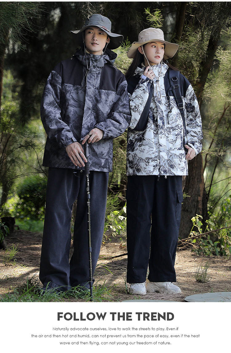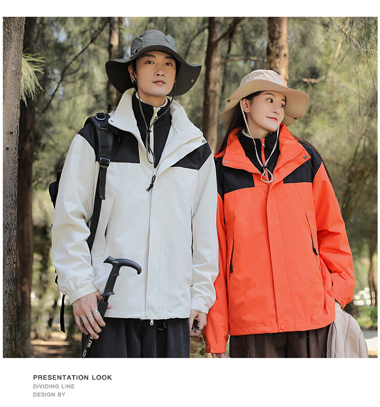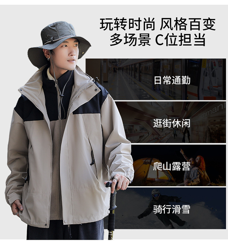 Chaqueta de invierno al aire libre para hombres y mujeres tres en uno de dos piezas de lana engrosada chaqueta de alpinismo a prueba de viento al por mayor en vivo