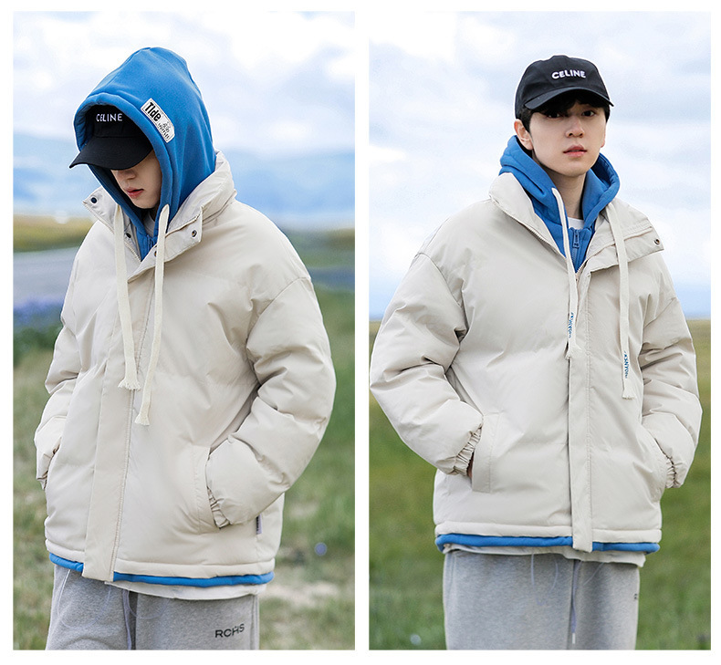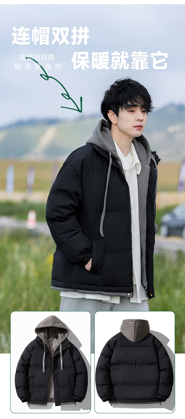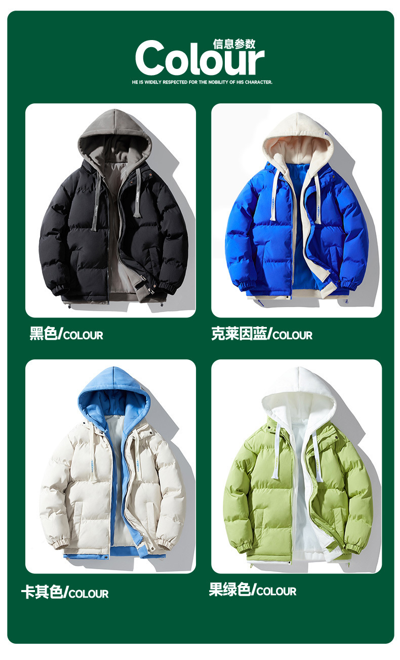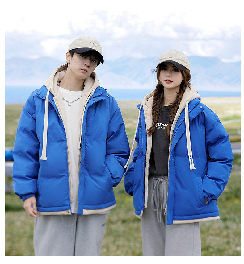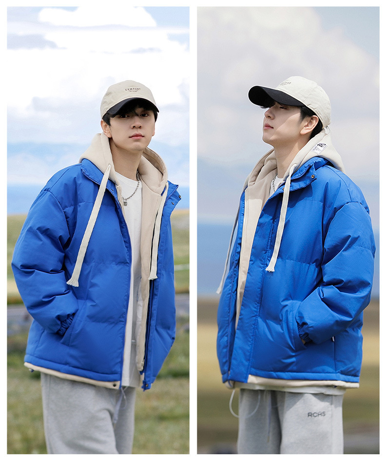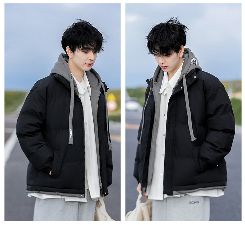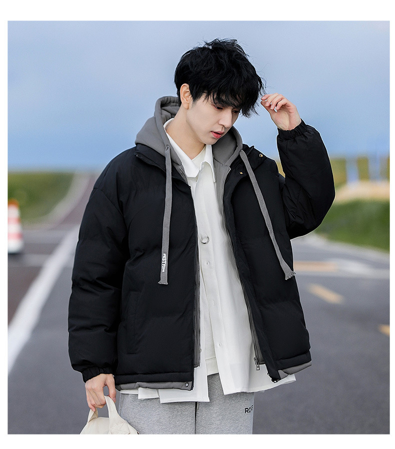 Abrigo acolchado de algodón para hombres invierno 2023 nuevo abrigo de pan con capucha de color sólido suelta pareja de moda falso Abrigo acolchado de algodón de dos piezas
