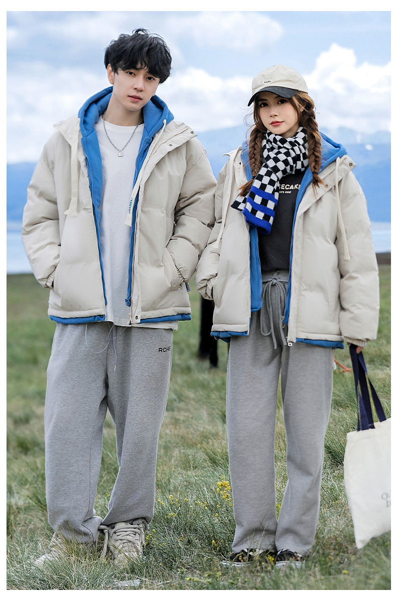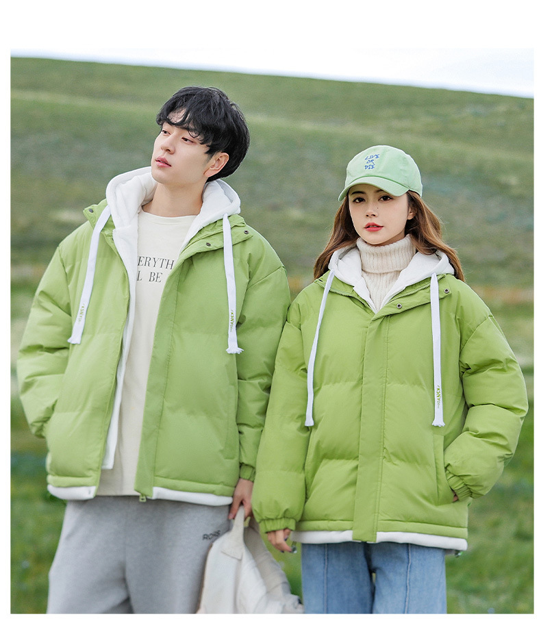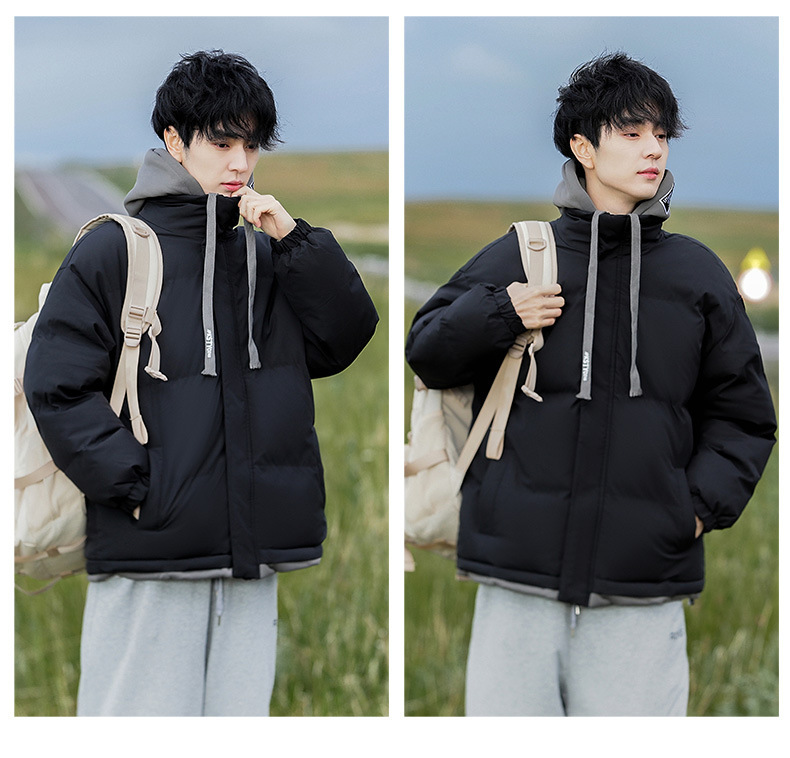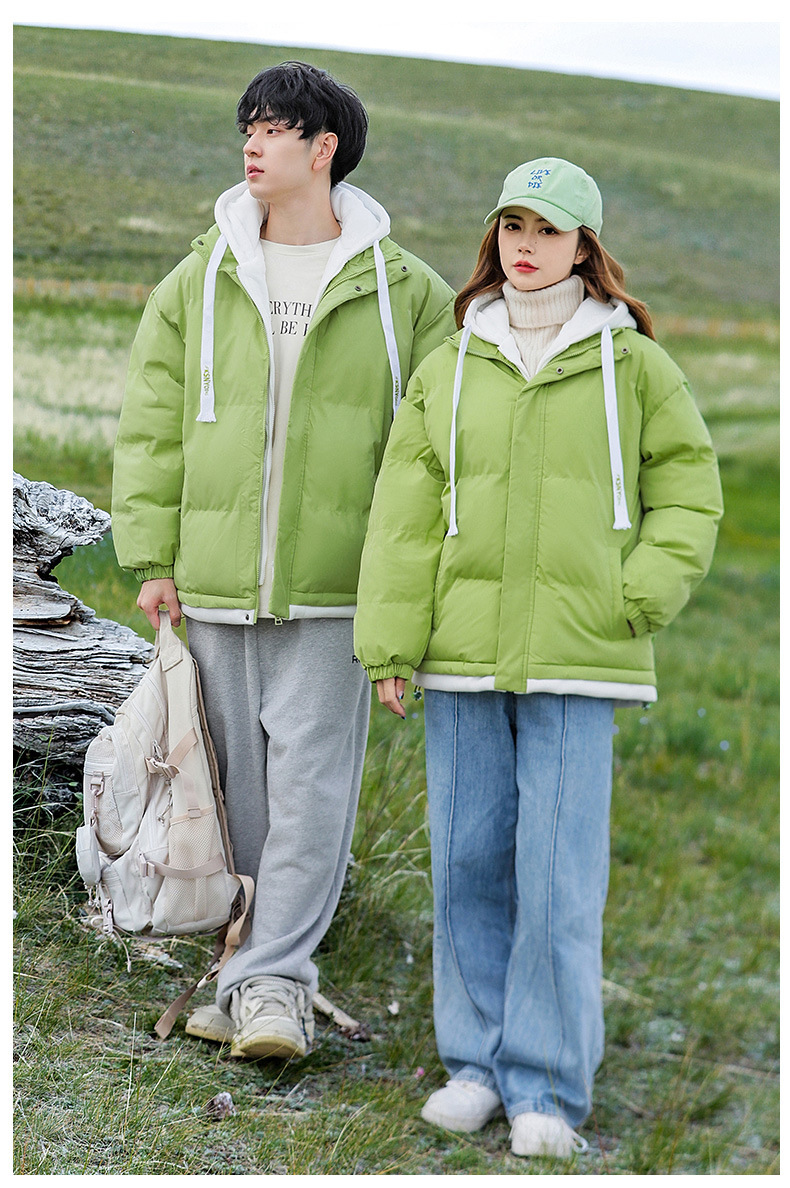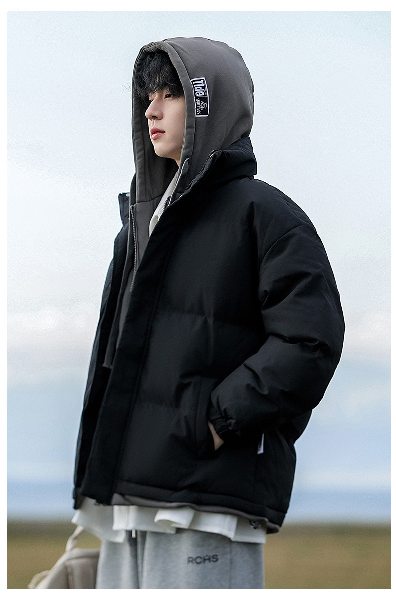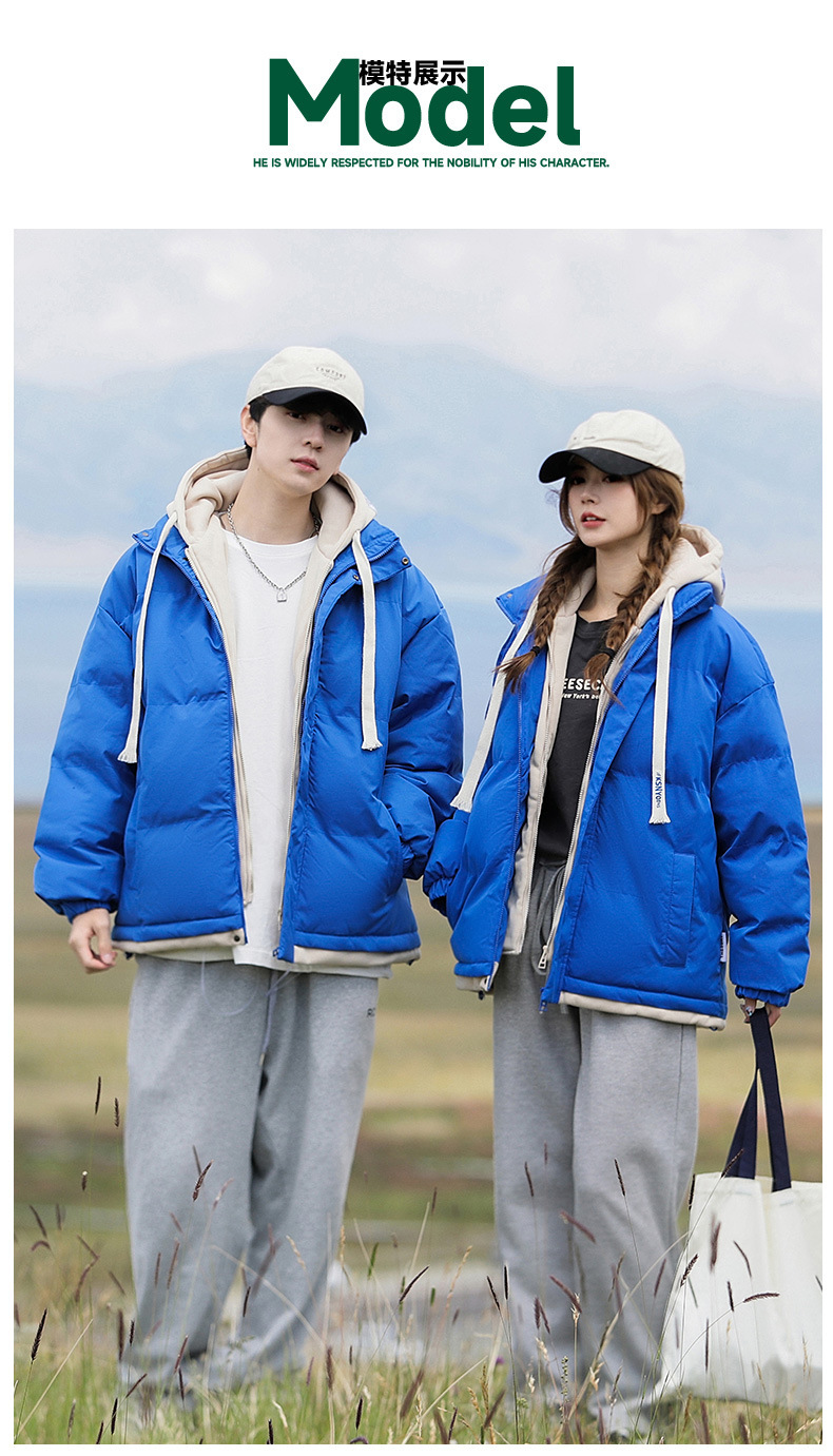 Abrigo acolchado de algodón para hombres invierno 2023 nuevo abrigo de pan con capucha de color sólido suelta pareja de moda falso Abrigo acolchado de algodón de dos piezas