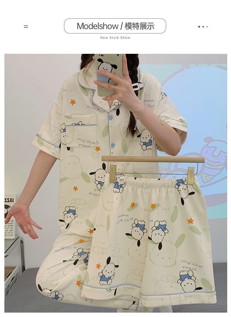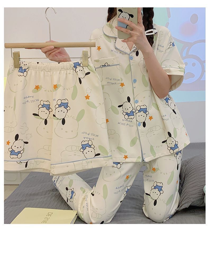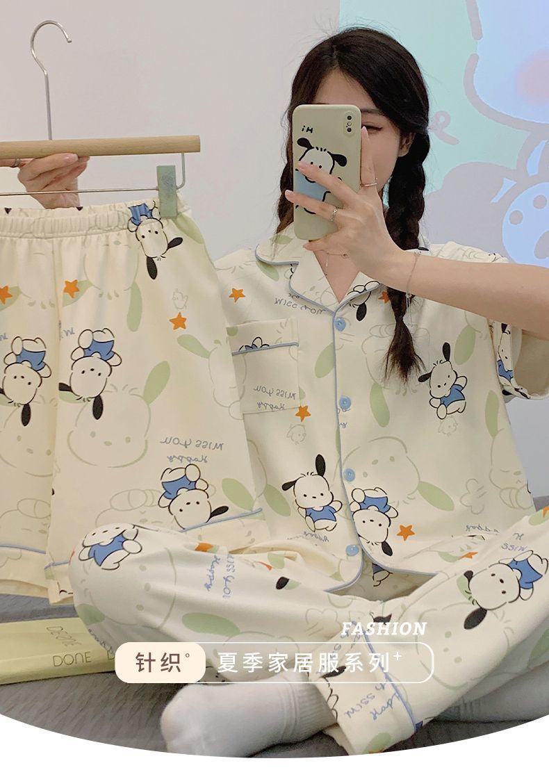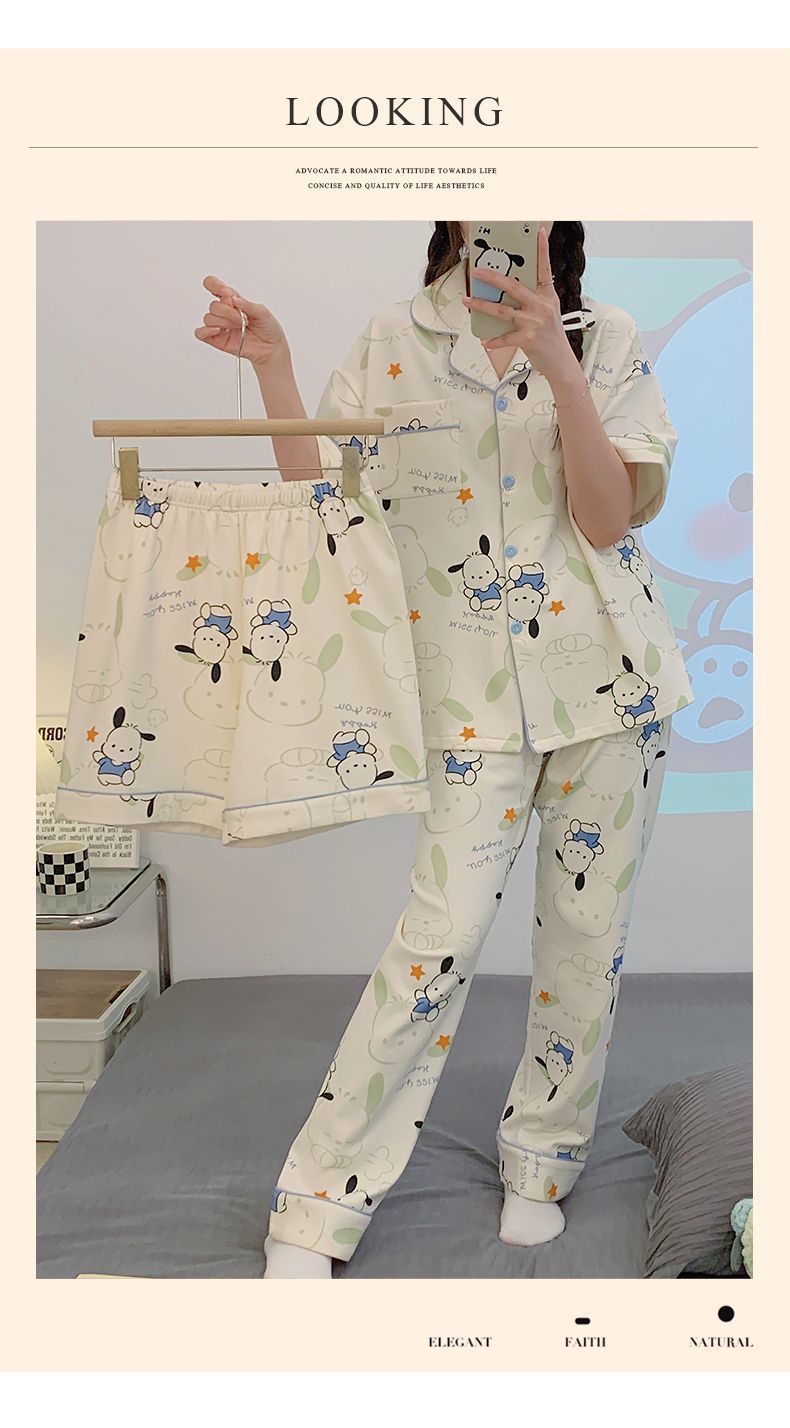 [Conjunto de tres piezas] 100% algodón pijamas de dibujos animados de verano de las mujeres de manga corta delgada de verano lindo desgaste del hogar al aire libre