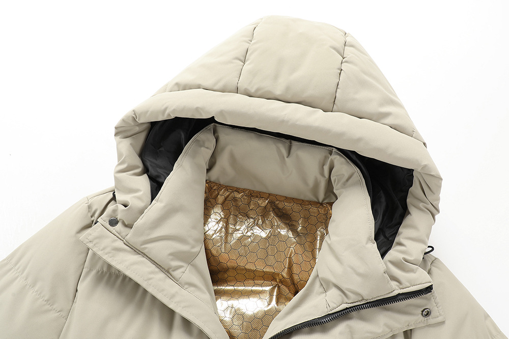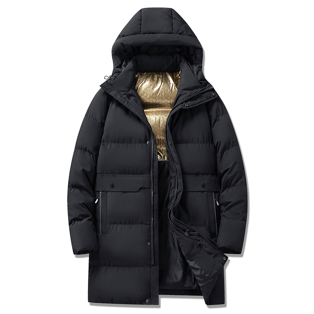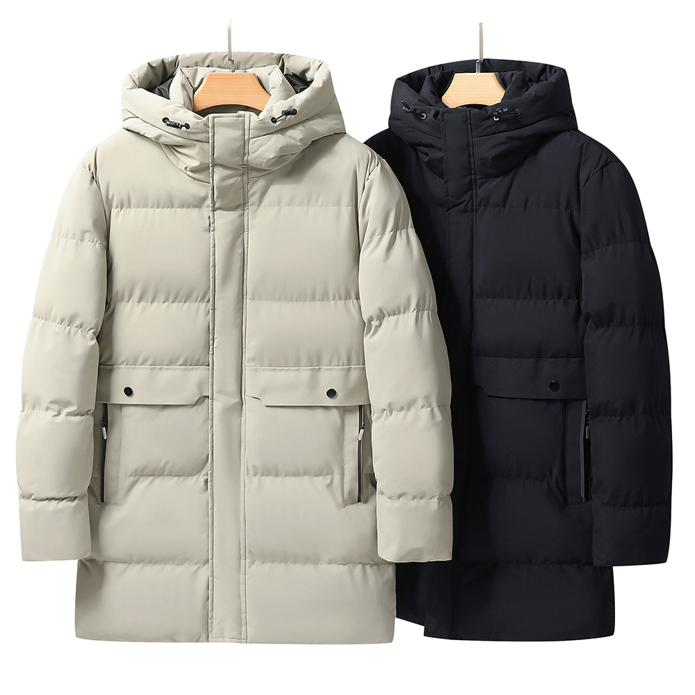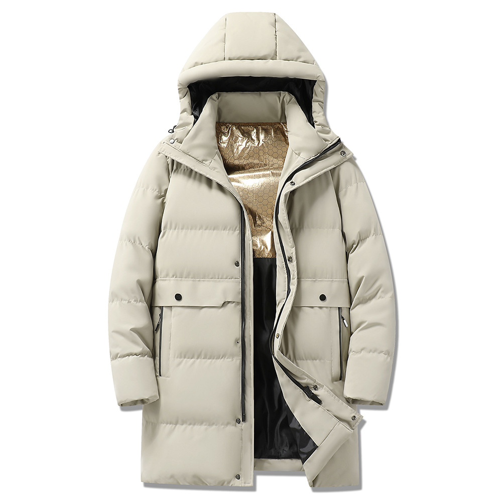 Otoño y invierno hombres encapuchados pico esquí al aire libre caliente algodón medio largo traje de esquí de grafeno grande algodón