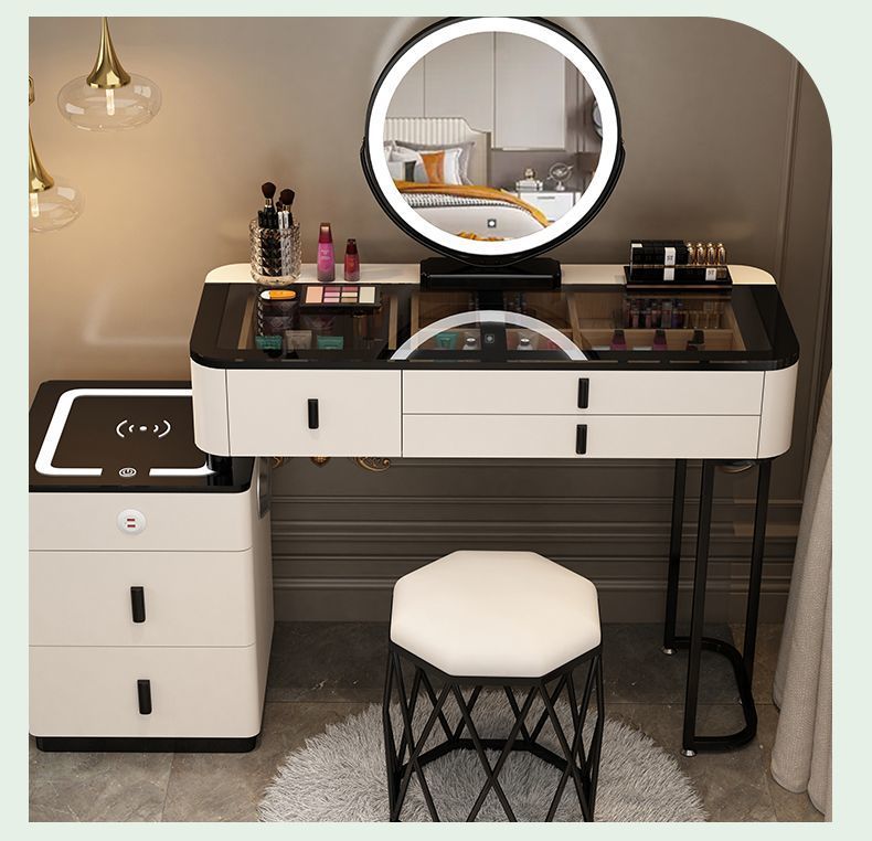 Escritorio blanco de 125,5 cm + Gabinete inteligente + espejo redondo + taburete de malla