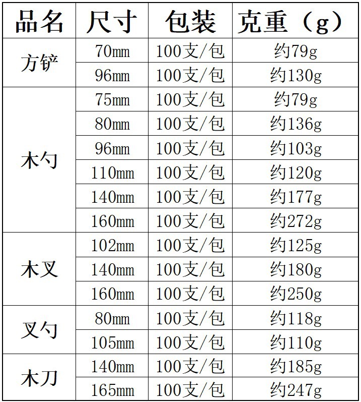 | Colores | Cuchara de hielo de 75mm (1200 piezas/juego de embalaje independiente),Cuchara de hielo de 94mm (paquete independiente de 1200 piezas/juego),Cuchara de hielo de 75mm (1000 piezas/juego a granel),Cuchara de hielo de 94mm (1000 piezas/juego a granel),Cuchara cuadrada de 70mm (1000 piezas a granel),Cuchara cuadrada de 96mm (1000 piezas a granel),Cuchara de madera puntiaguda de 75mm (1000 piezas a granel),Cuchara de madera puntiaguda de 96mm (1000 piezas a granel),Cuchara de madera puntiaguda de 110mm (1000 piezas a granel),Cuchara tenedor de madera de 105mm (1000 piezas a granel) |