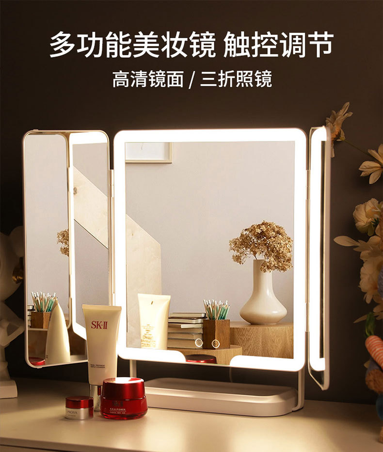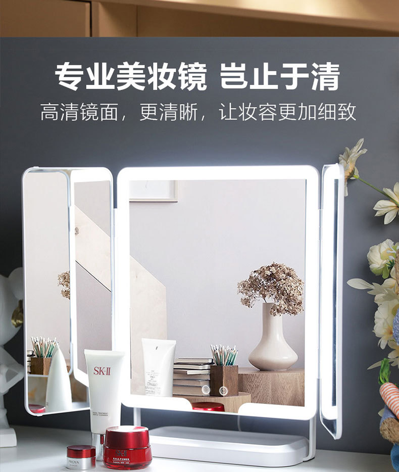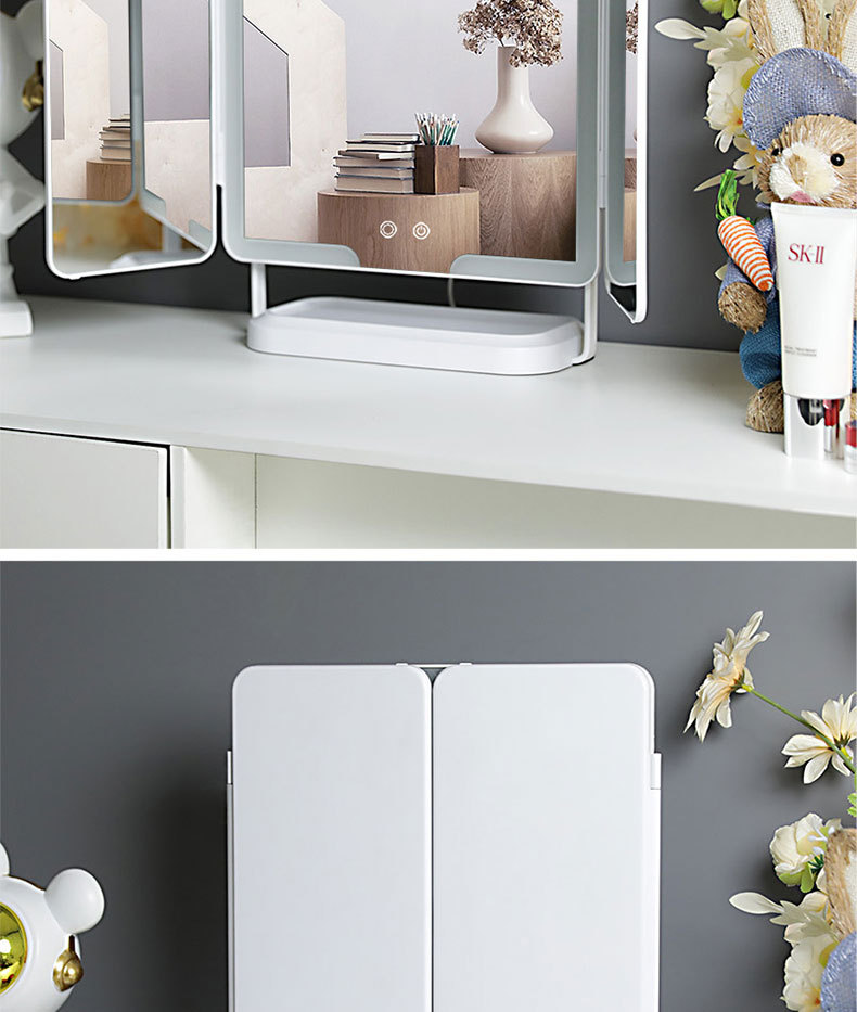 Espejo de maquillaje con luz, espejo triple de celebridades de Internet, espejo plegable de escritorio grande, espejo de tocador portátil con luz de relleno led