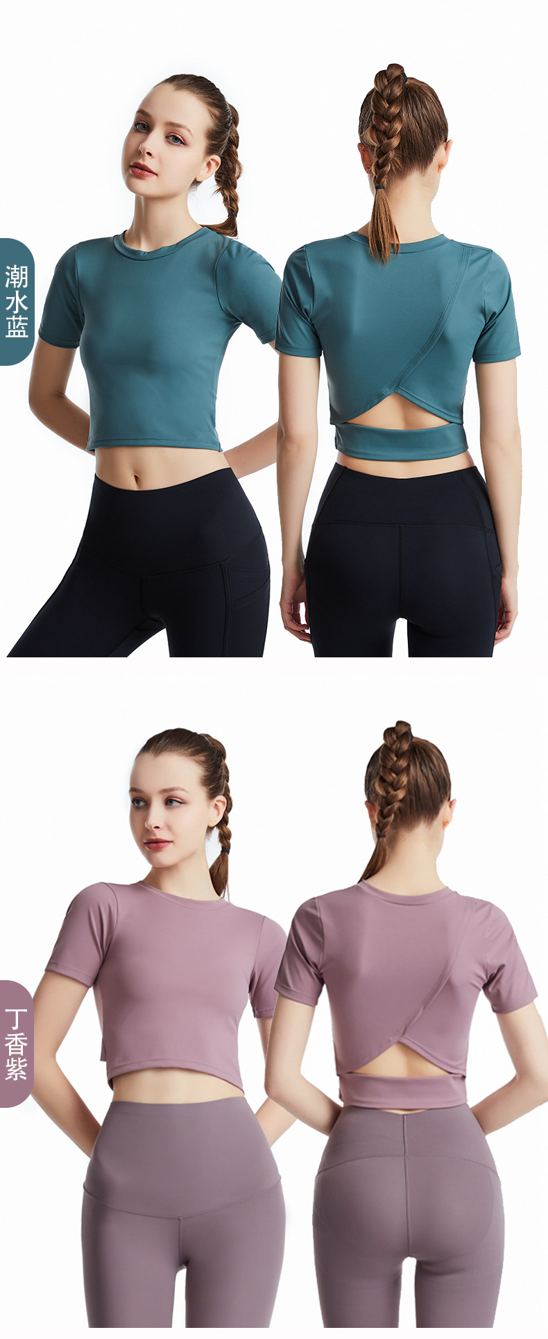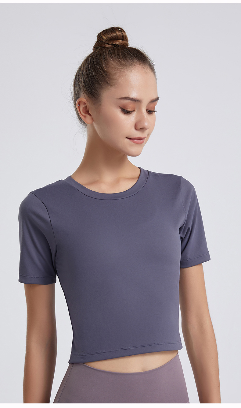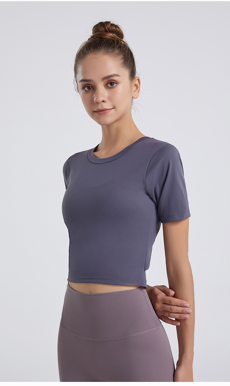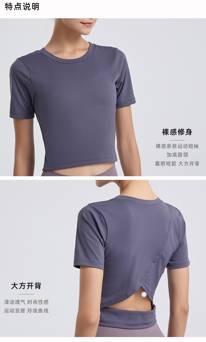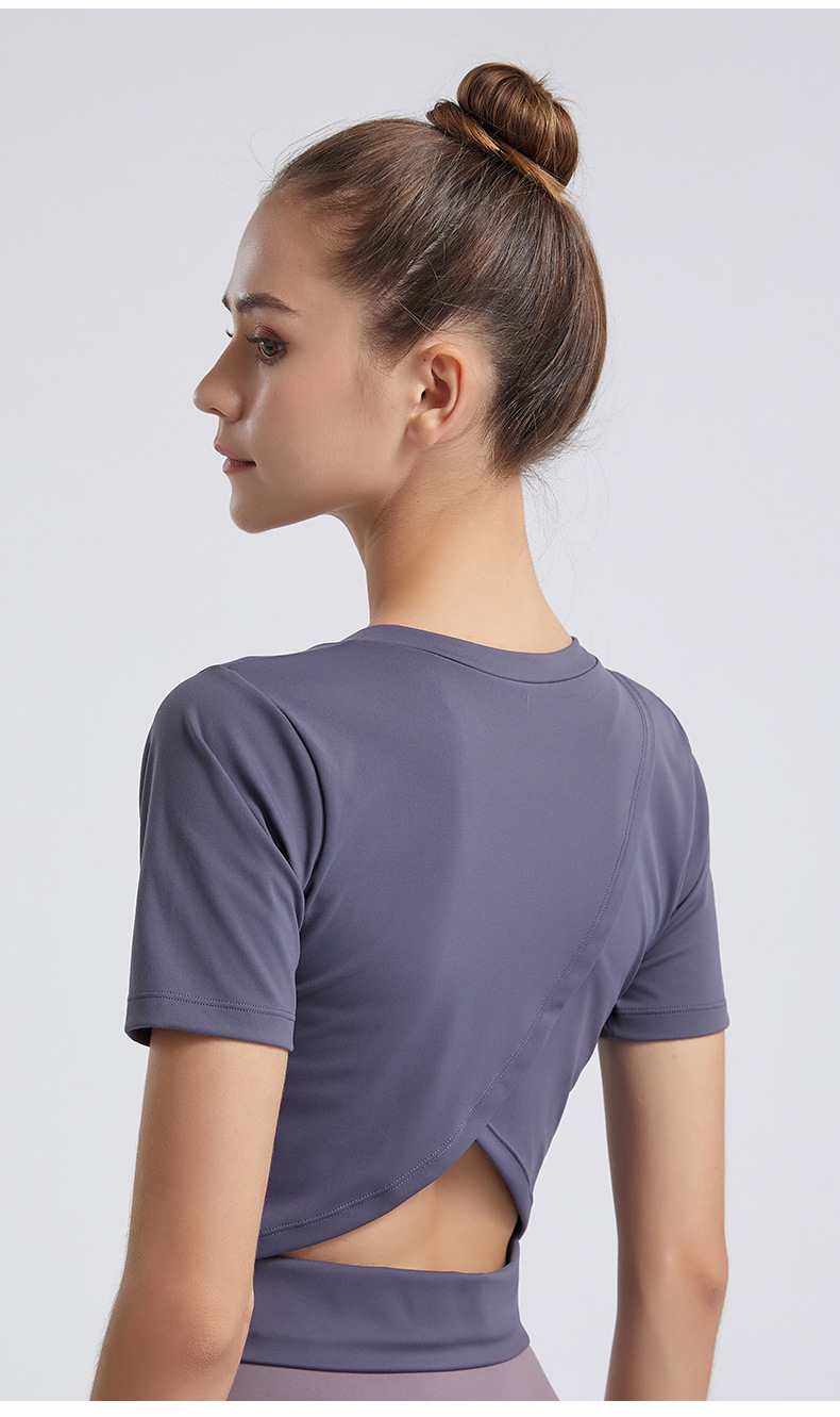 Europa y América Nueva Lulu desnuda deportes de manga corta Camiseta de las mujeres elástica delgada Cruz sin espalda yoga fitness top
