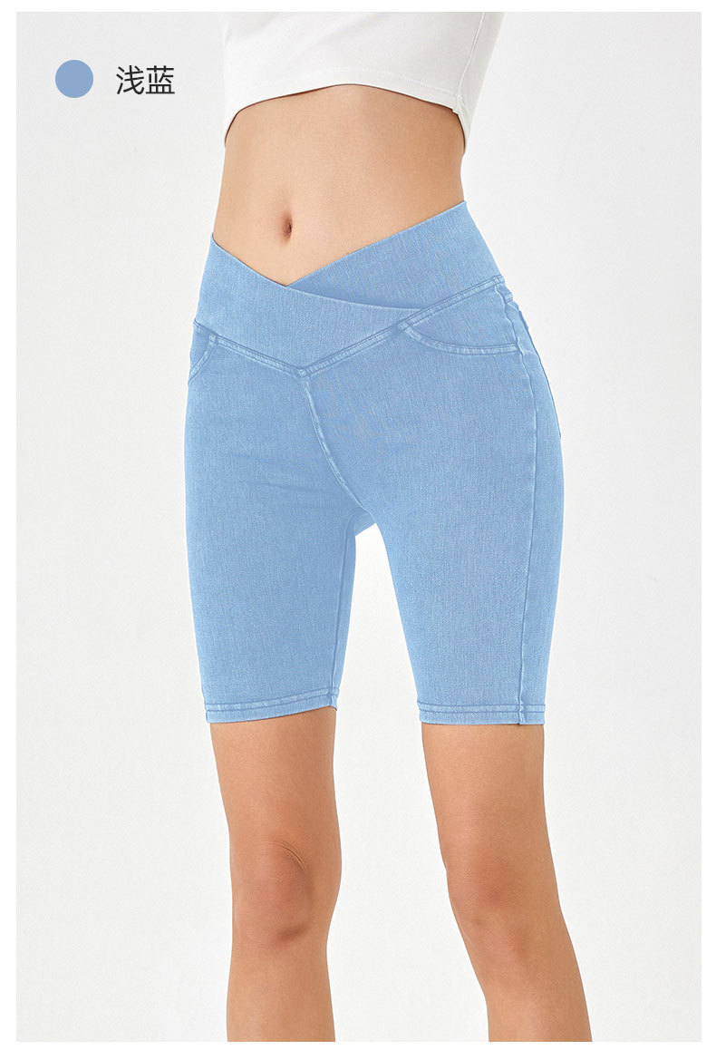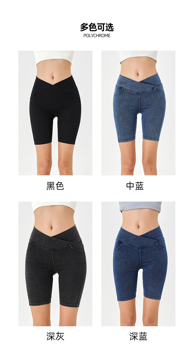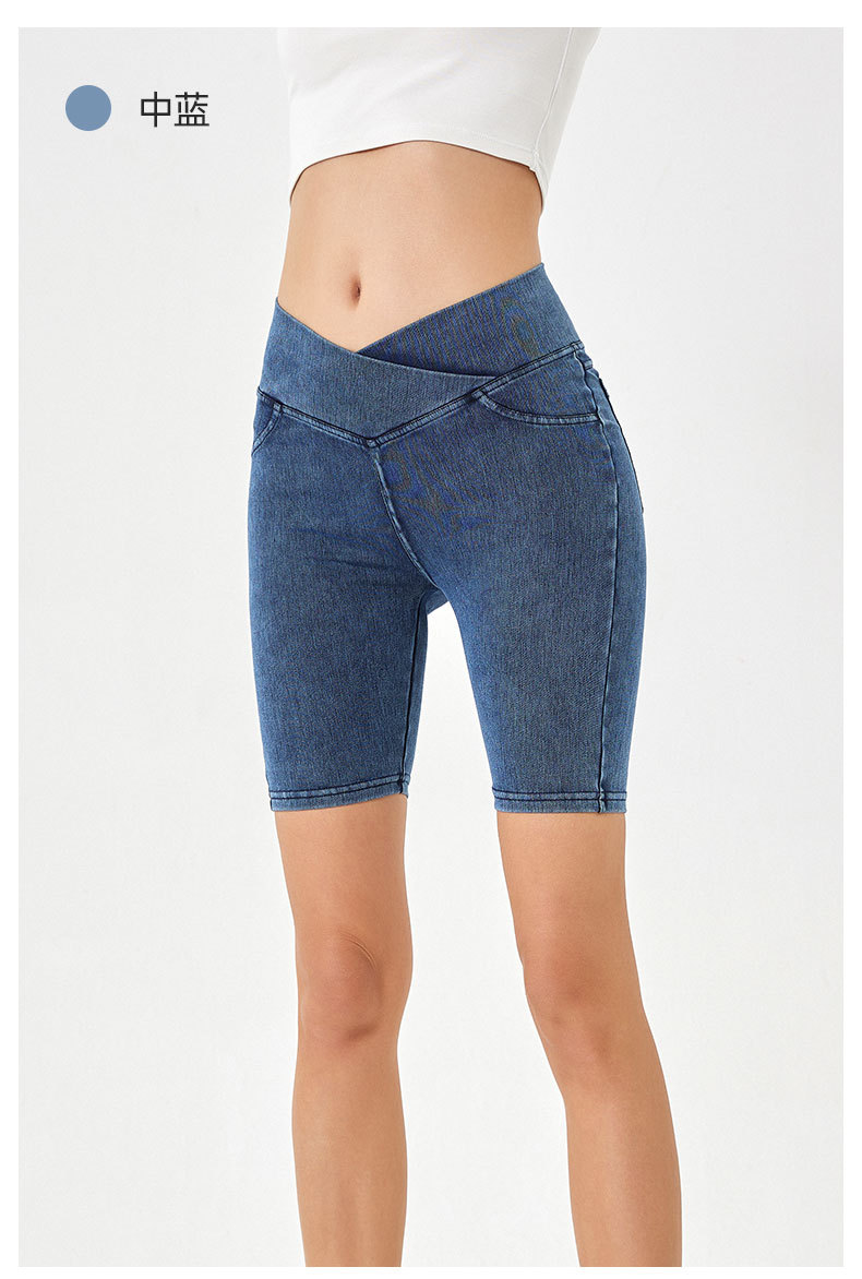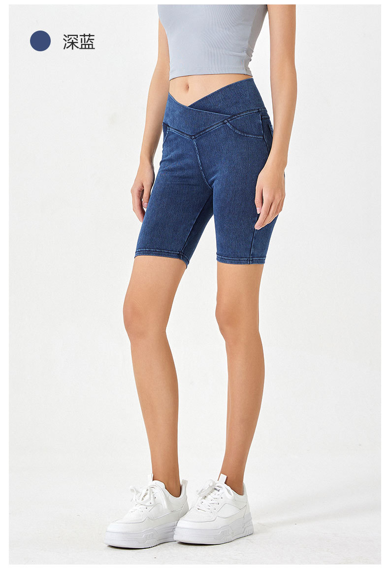 2024 nuevos pantalones cortos de mezclilla de cintura alta cruzada para mujer, pantalones de ciclismo de cinco puntos deportivos delgados y de alta elasticidad